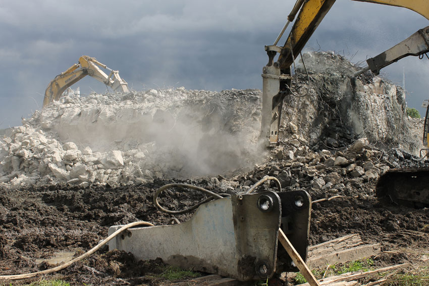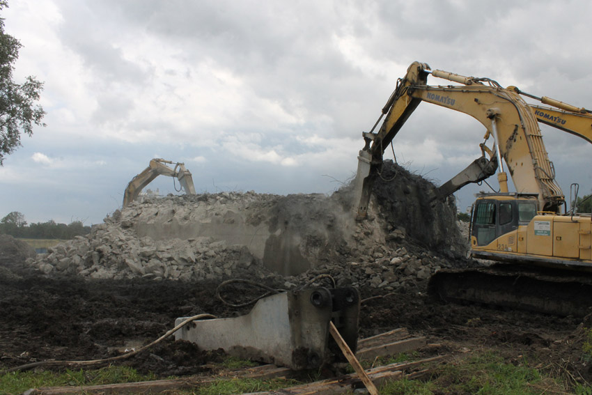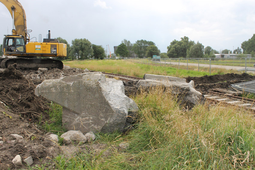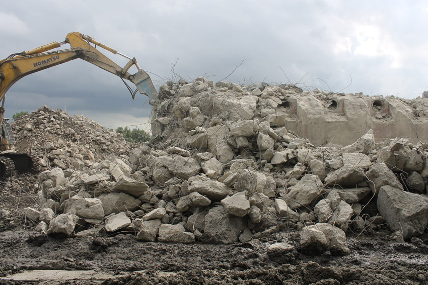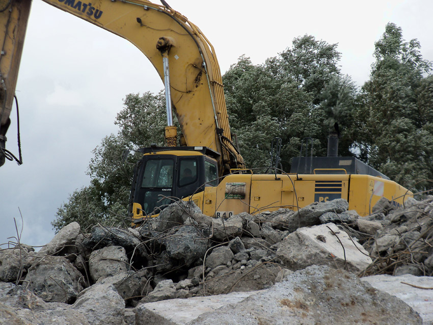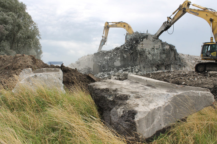 Abrisstag 30: Der Ost-T 750 ist nun bis fast zum Erdgeschoss abgetragen. Die Geschichte des Bunkers endet alsbald. Wir dachten, der Bunker hätte schon zum letzten Wochenende seine Struktur verloren gehabt, jedoch hat sein Rest noch eine "Schonfrist" bis zu dieser Wochenmitte erhalten.