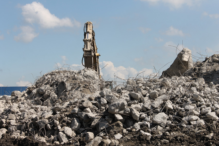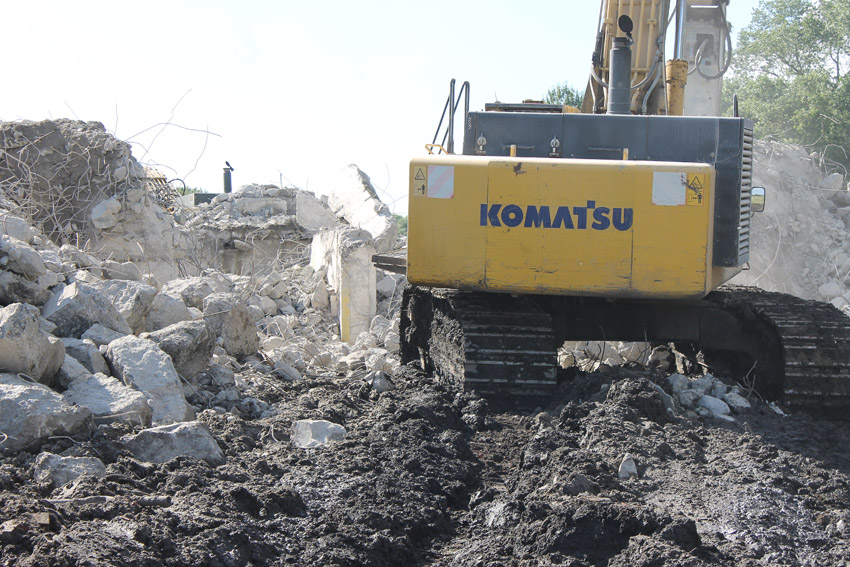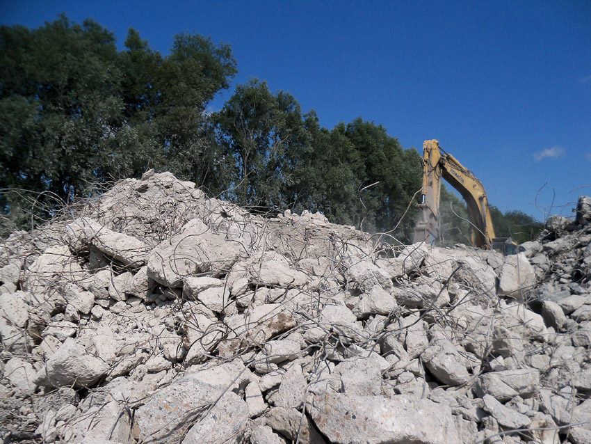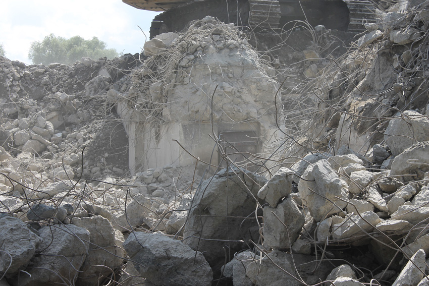 Abrisstag 31: Der Ost-T 750 ist jetzt auch im Erdgeschoss stark durchbrochen im Bereich seiner Außenwände. Der Innenbereich besteht im EG lediglich noch teilweise im Bereich der tragenden Wände des ehemaligen Treppenhauses. Noch einmal ist etwas Einsicht ins damalige Innere vorhanden, da Betonschutt entfernt wurde. Auch ein ehemaliger Schriftzug der Treppenhauswand ist ein wenig erkennbar. Morgen zu Feierabend wird sich das Bild des Ost-T 750 nicht mehr von der jetzigen Erscheinung des West-T 750 unterscheiden: Schutt...