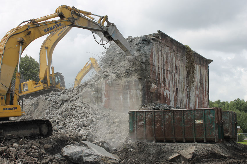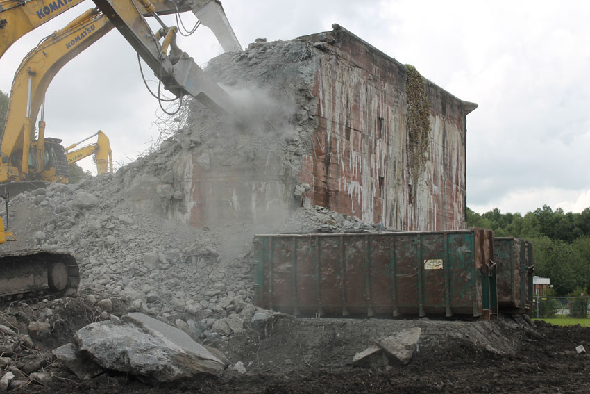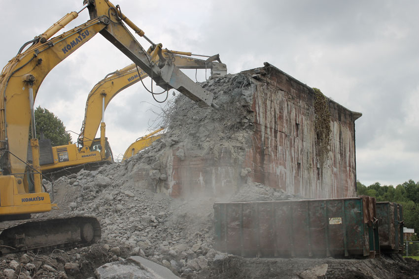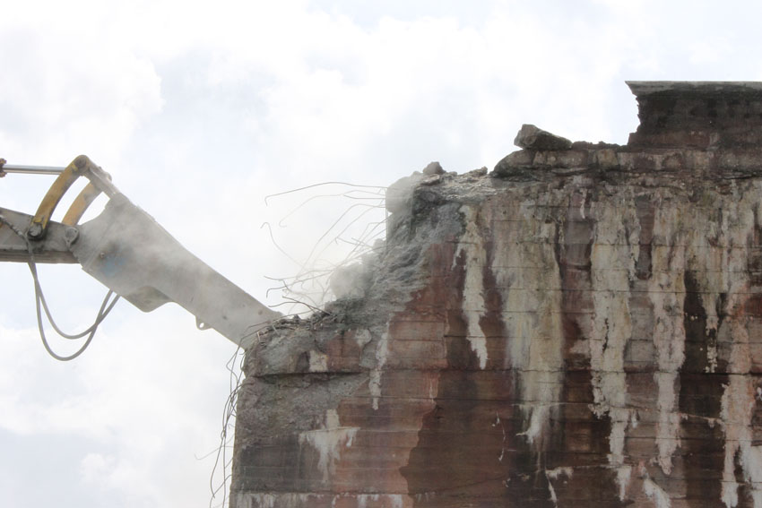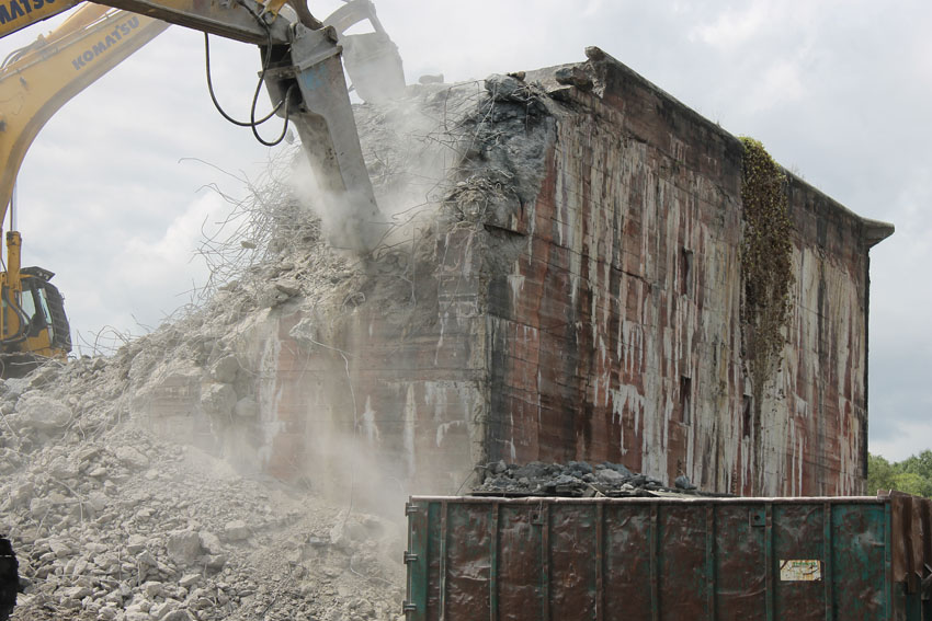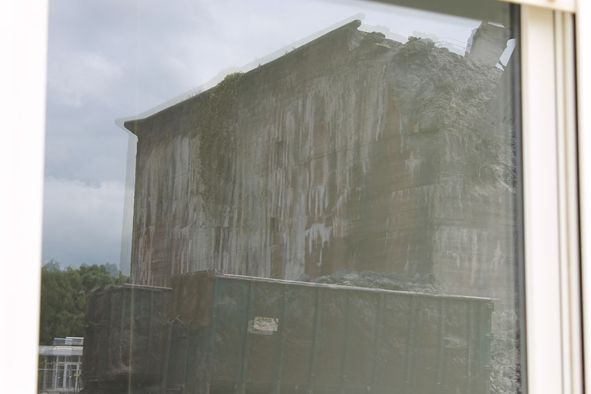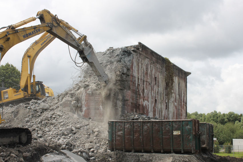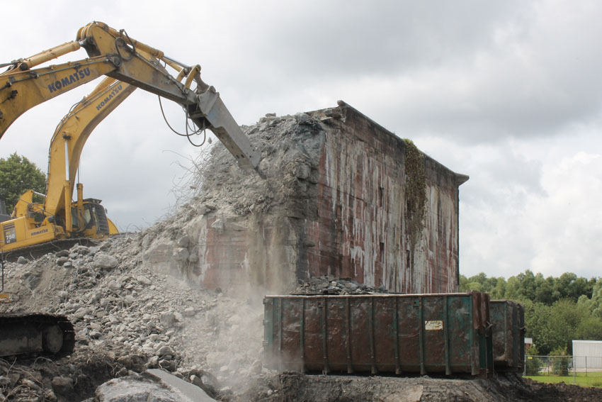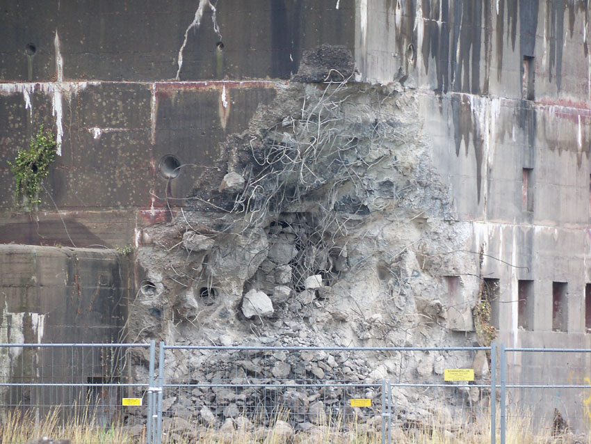 Abrisstag 12: Der T 750 West steht im OG1 und OG2-Bereich fast nur noch mit seiner Nordwand. Die Nordostecke wurde heute bereits teilweise abgetragen. Mitte nächster Woche wird nur noch ein Schutthaufen vom Bunker übrig sein. In zweieinhalb Wochen Abrisszeit ist der Bunker dann in die Analen der Geschichte übergegangen... Unterdessen wurde am T 750 Ost nicht weiter abgebrochen. Hier wird die Fortsetzung der Arbeiten für kommenden Montag erwartet.
