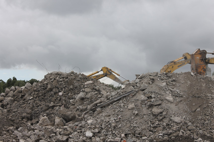 Abrisstag 16: Heute wüteten wieder Schauer und Sturmböen über Wilhelmshaven. Den Abbruch haben sie nicht beeinflussen können. Der T 750 West hat seine Struktur großteilig verloren, die Nordwand ist fast gänzlich zertrümmert. Die Bagger Typ PC 750 LC tragen die Bunker Typ T 750 ab. Die Gleichheit der Ziffern ist ein Kuriosum. Auch vom Splitterschutzvorbau West ist ein Großteil nun Vergangenheit. Zum Wochenende wird vom Bunker lediglich ein Trümmerfeld erkennbar sein... Die Abrissarbeiten am T 750 Ost beginnen kommenden Samstag oder Montag, nachdem die Meißelwerkzeuge am Westbunker nicht mehr benötigt werden.