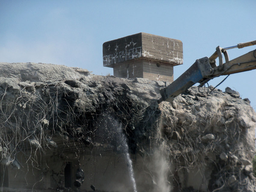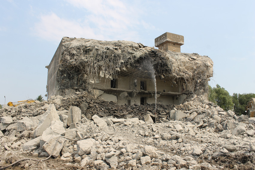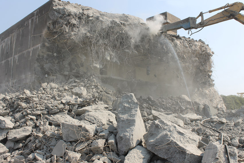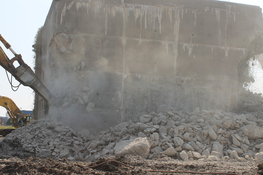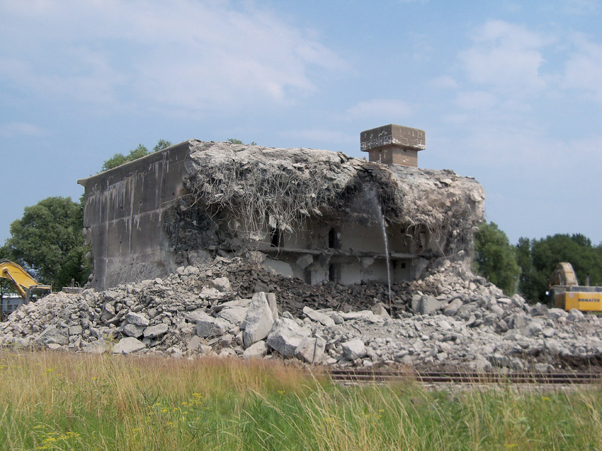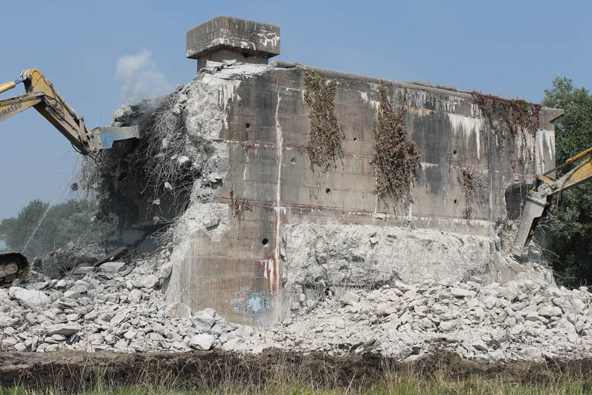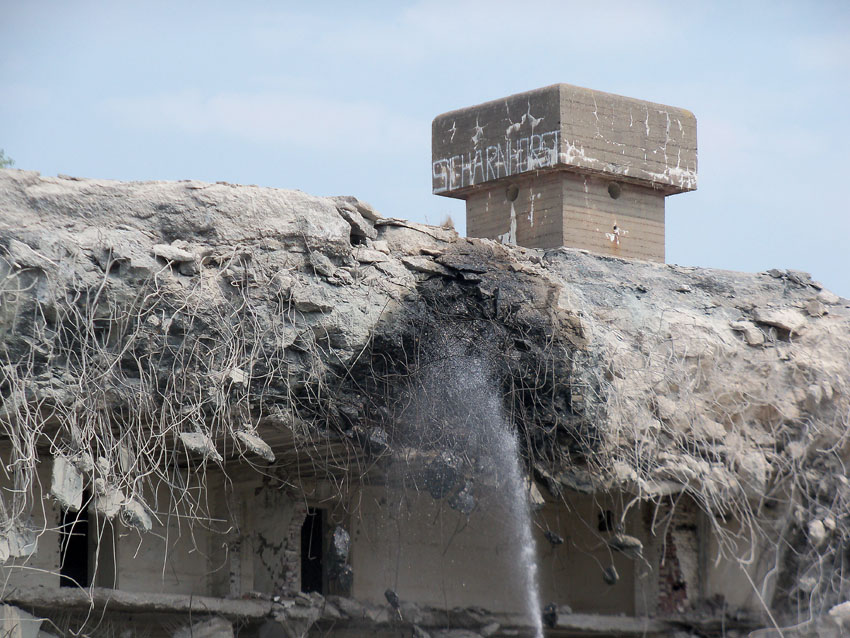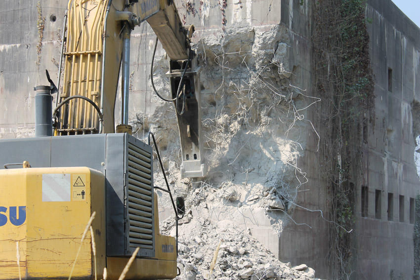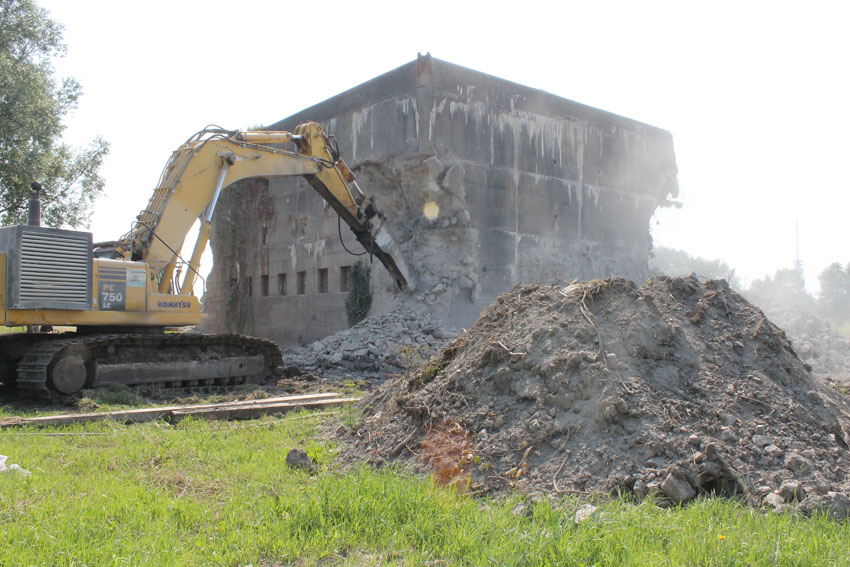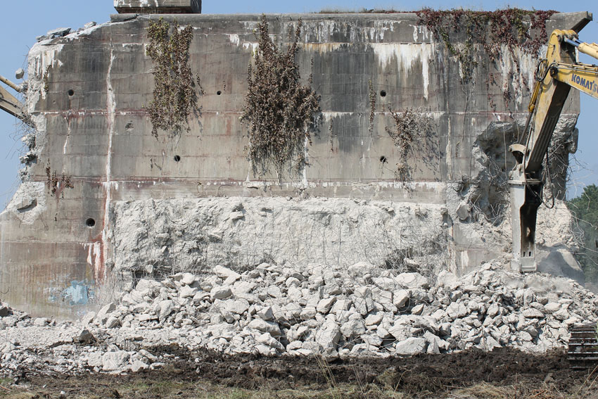 Abrisstag 23: Die Südwand des T 750 Ost wurde heute auch im Dachbereich bis direkt an den Lüftungsturm abgebrochen. Im Bereich der Nordwand ist die West- und Ostecke bereits arg zerstört. Im Bereich der Trümmerhalde, die einst T 750 West war, zerschreddert die kürzlich aufgestellte Brechmaschine nun konstant den Bunkerbeton...