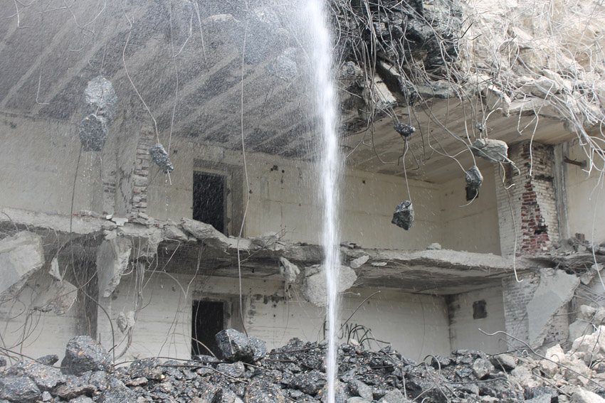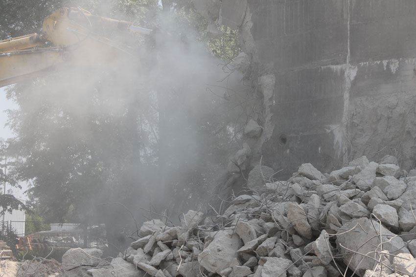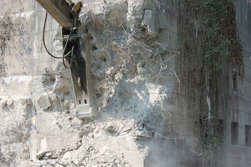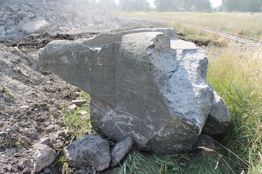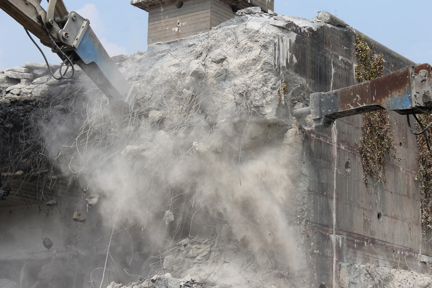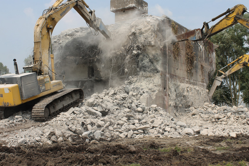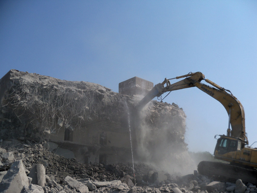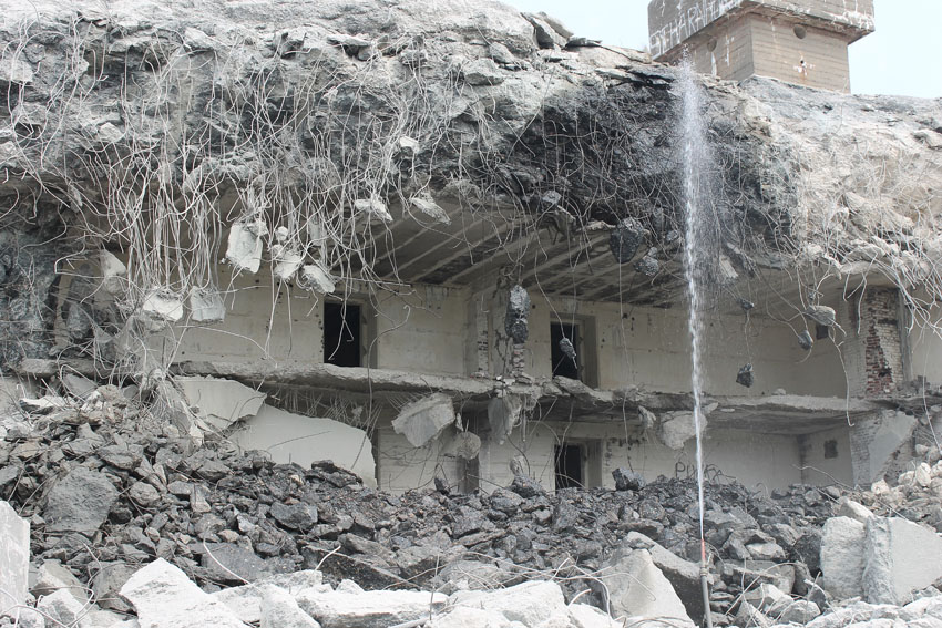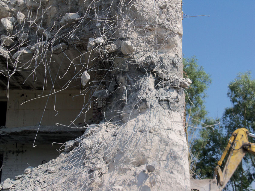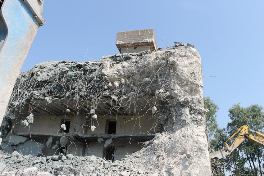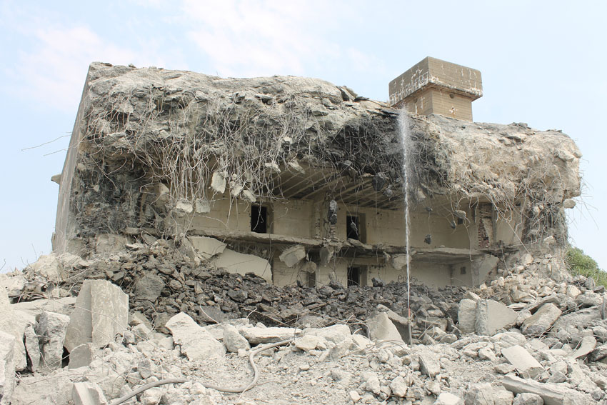 Abrisstag 23: Die Südwand des T 750 Ost wurde heute auch im Dachbereich bis direkt an den Lüftungsturm abgebrochen. Im Bereich der Nordwand ist die West- und Ostecke bereits arg zerstört. Im Bereich der Trümmerhalde, die einst T 750 West war, zerschreddert die kürzlich aufgestellte Brechmaschine nun konstant den Bunkerbeton...