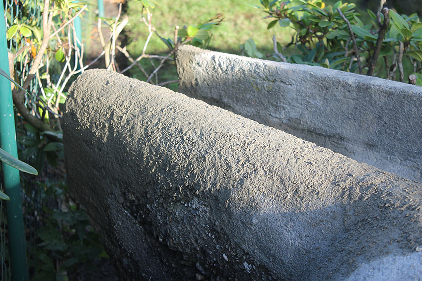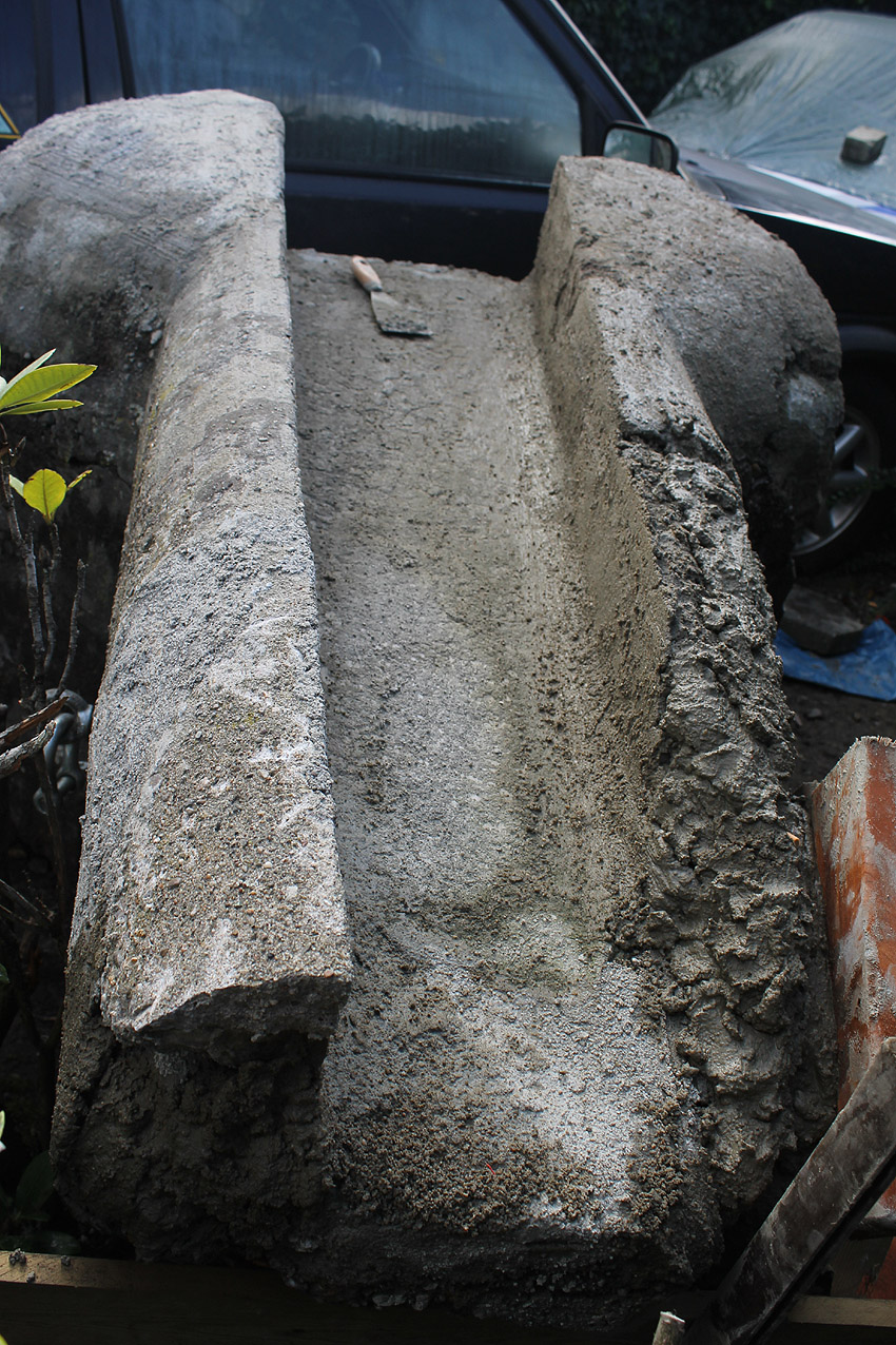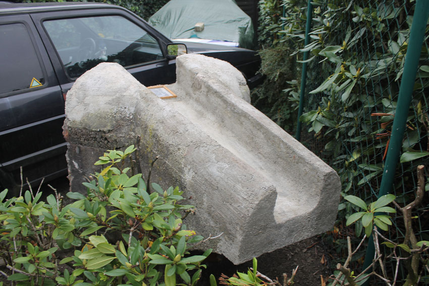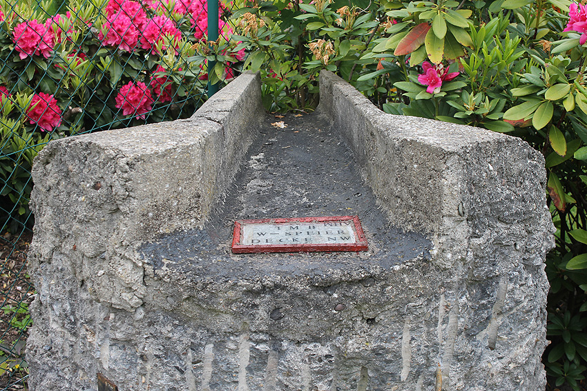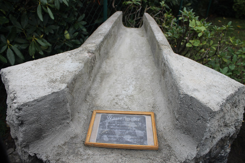 Ein Schriftfeld wurde angebracht und einige nicht ganz so gerade, eher wellige Stellen im Oberbereich wurden noch einmal angeglichen. Der Wasserspeier hat nun sein Enderscheinungsbild erhalten. Morgen erfolgt noch eine Behandlung mit einem Buttermilch-Moos-Extrakt, um dem im oberen Viertel aufgebauten Neubeton innerhalb von drei Wochen eine Erscheinung wie 70-Jahre-Beton zu verleihen.