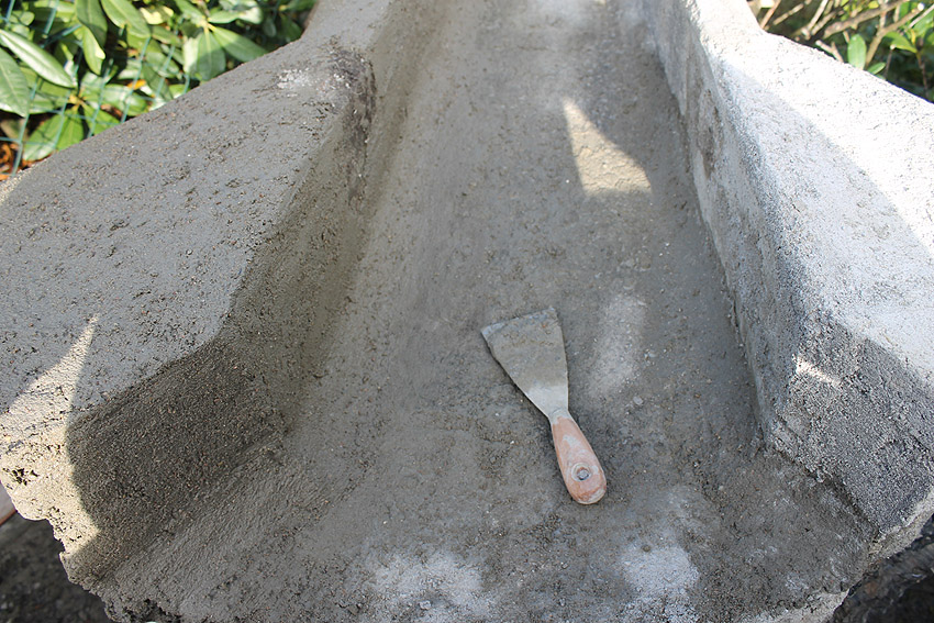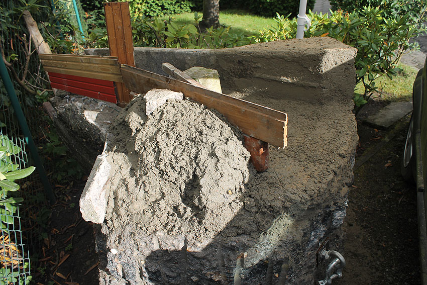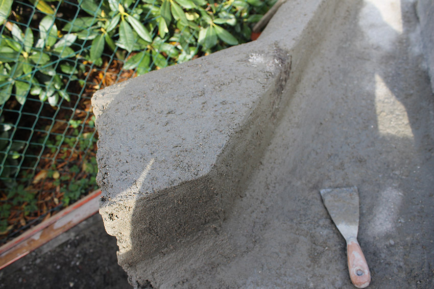 So sieht der restaurierte Bereich trocken aus. Feinarbeiten werden die Kanten und Rundungen noch angleichen.