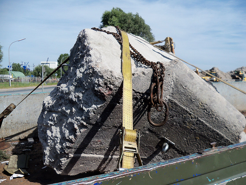 Als eines der letzten erhaltenen Relikte der T 750 Hannoversche Straße soll morgen der Wasserspeier Nordwest des West-T 750 nach Schortens umgebettet werden. Vorher muss noch unnötiger Ballast entfernt werden, damit das Relikt transportabel wird. Endgewicht: 1,5 Tonnen. Im Anschluss werden einige Teilbereiche des Oberbereichs mit Originalmaterial wieder hergestellt. Vielen Dank an Fa. JK-Fahrzeugtechnik für die Unterstützung!