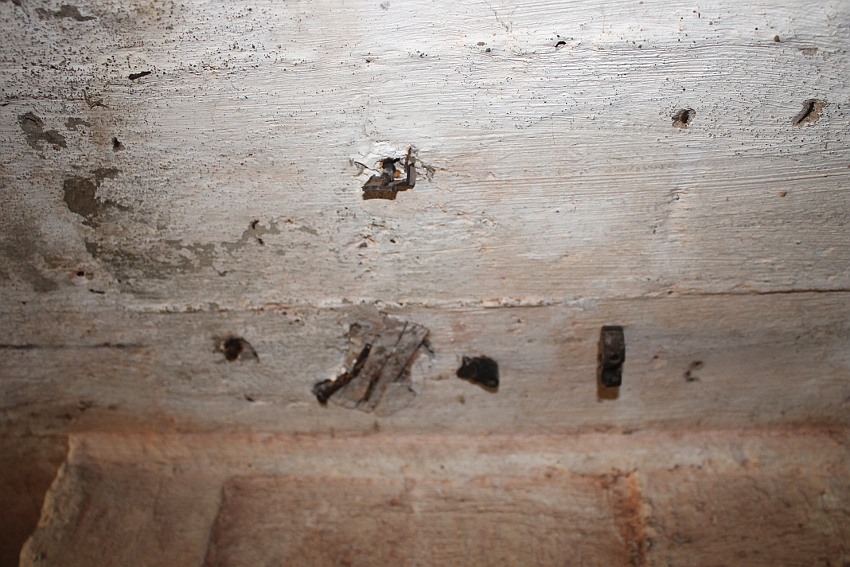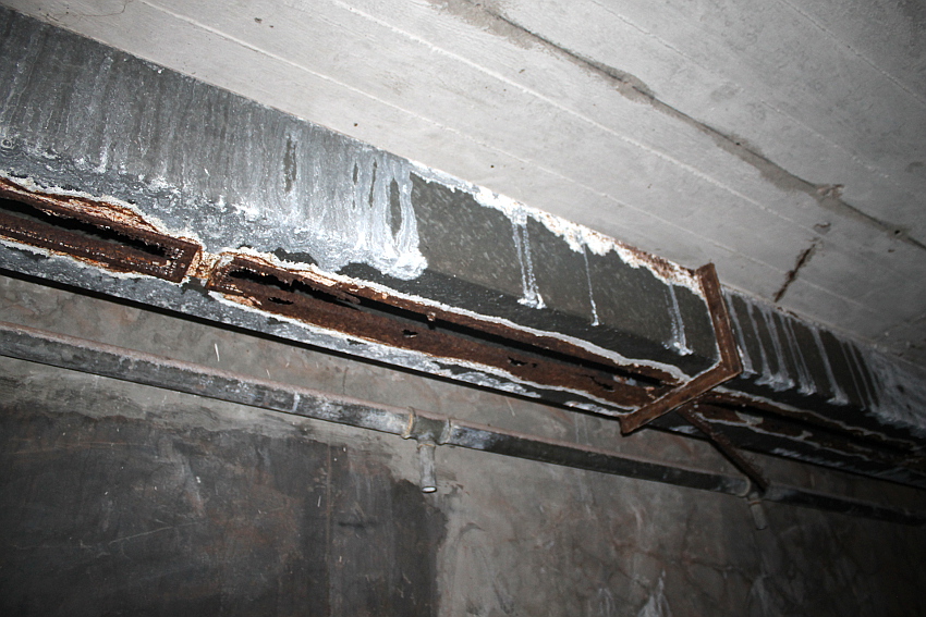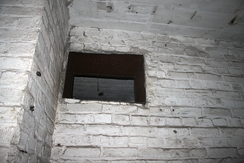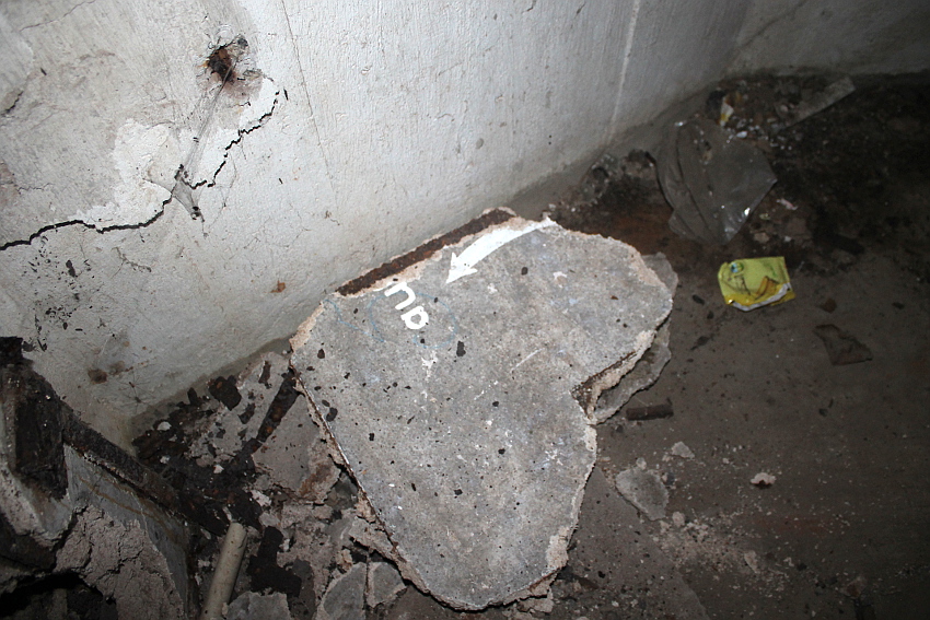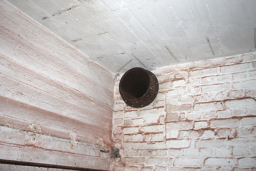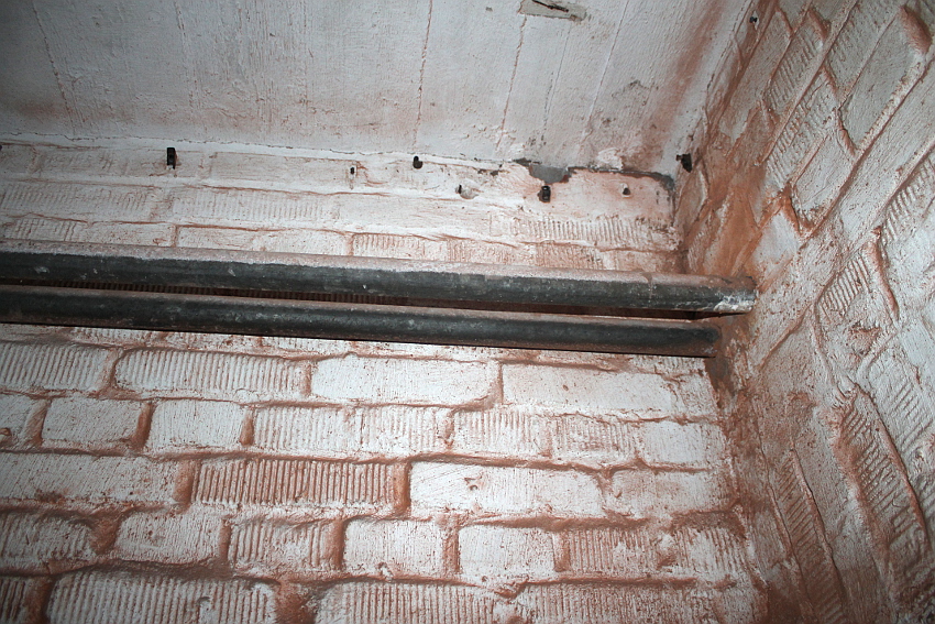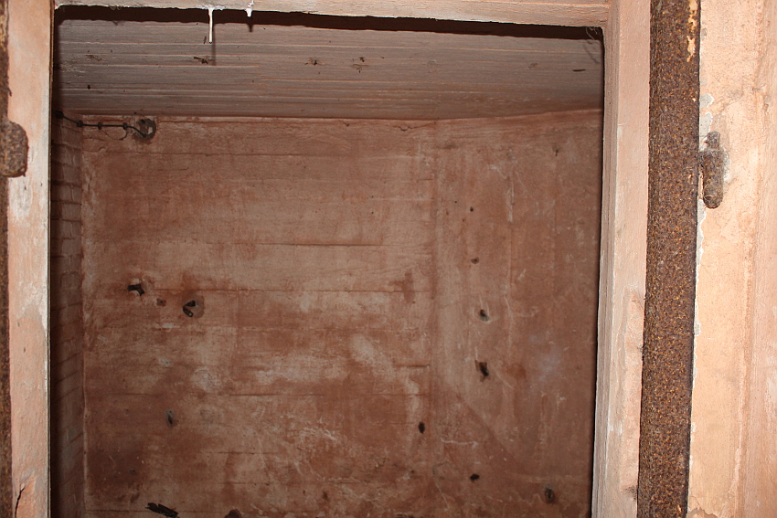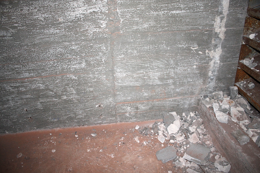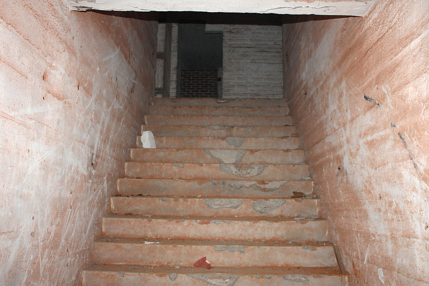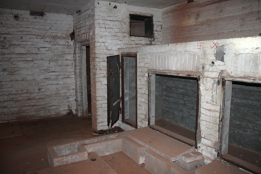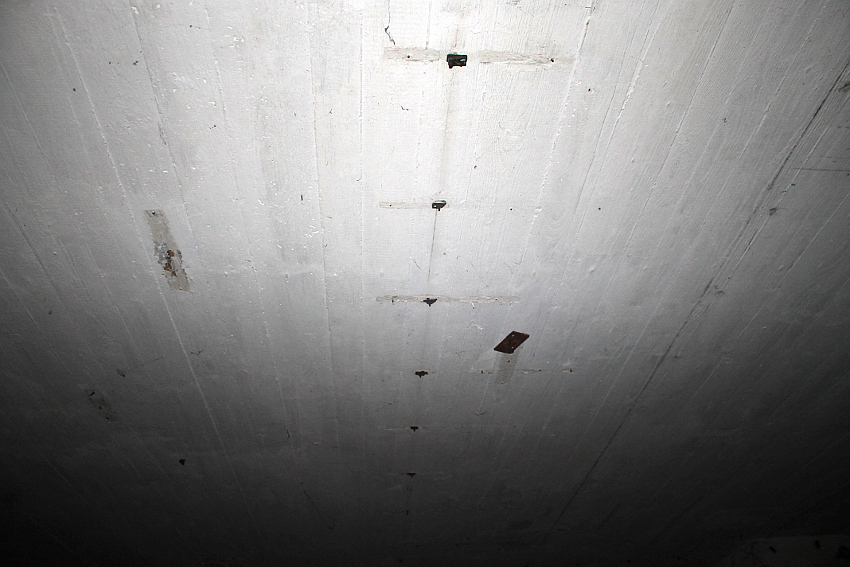 Bei diesem Truppenbunker ist auffällig, dass es im Inneren ganz im Gegensatz zum T 750 Ost / Banter Ruine nur sehr wenig Beschriftungen gibt. Hier hatte man scheinbar keine Zeit mehr für derartige Arbeiten, die wohl im Anschluss an jene im T 750 Ost ausgeführt wurden. Die Beschriftungen wurden großteilig durch Soldaten in ihrer Freizeit in feiner Handarbeit ausgeführt. Möglicherweise wurden die hierfür verantwortlichen Kriegsmarine-Männer kurzfristigt verlegt. Auffällig sind die Phosporfarbestreifen im OG II. Im ersten Obergeschoss kamen sie hingegen nicht mehr zur Realisierung...