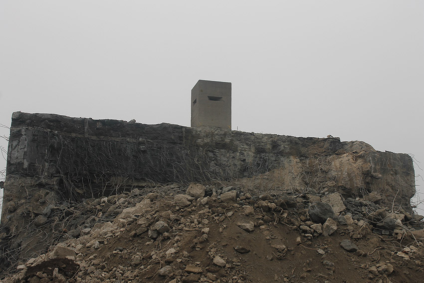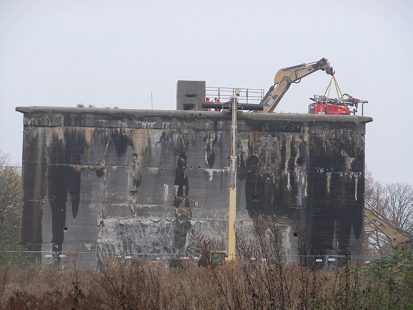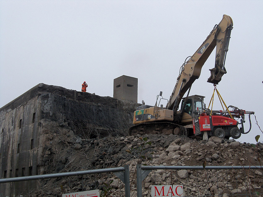 Am heutigen Tage wurden die Bohrungen abgeschlossen. Ungefähr 100 Bohrungen mit Tiefe bis zu 2,50 Metern wurden gesetzt. Am Nachmittag wurde das Bohrgerät, welches mit einem Kran Anfang der Woche aufs Dach gehoben wurde, mit einem der Bagger wieder heruntergelassen. Weitere Teile des Ostbereiches vom Dach wurden gestern und heute abgebrochen. Dort ist nun aber erst einmal Schicht, da die Bohrlöcher nun bis an die Abrisslinie reichen. Die Lockerungssprengung soll laut Auskunft eines Mitarbeiters am nächsten Dienstag erfolgen. Dann wird auch erkennbar sein, wie der Beobachtungsstand auf die Detonation, die fast nicht zu hören sein soll, reagieren wird. Schutzmatten sollen vorher zur Dämmung auf das Dach gelegt werden. Ob die Sprengung an einem Stück erfolgt oder in Etappen, bleibt abzuwarten. Logischer wäre aber eine einzige Gesamt-Lockerungssprengung des Daches. Äußerlich erkennbar werden wohl diverse kleine Risse im Oberbereich des Bunkers im Anschluss darauf sein. Wir sind gespannt.