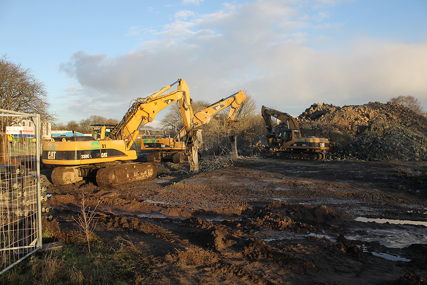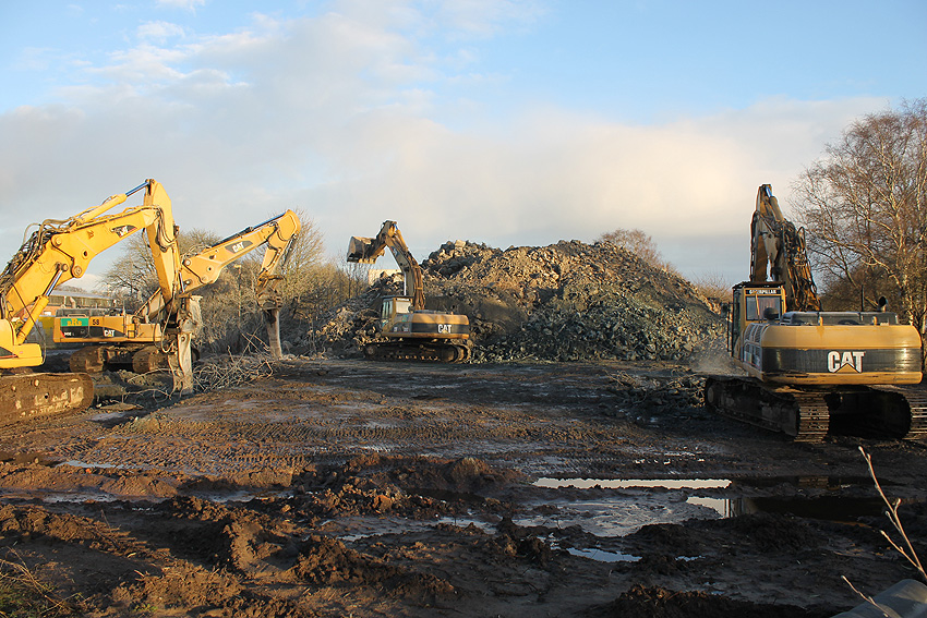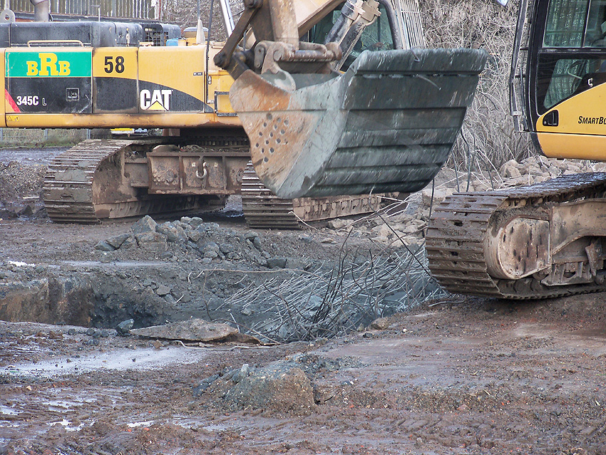 Endlich wieder besseres Wetter. Heute wurde an der Fundamentplatte weiter zerkleinert. Von Norden griffen zwei Bagger an, von Westen ein weiterer. Die Brechmaschine ist auch am heutigen Tage außer Funktion.