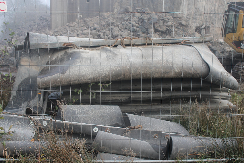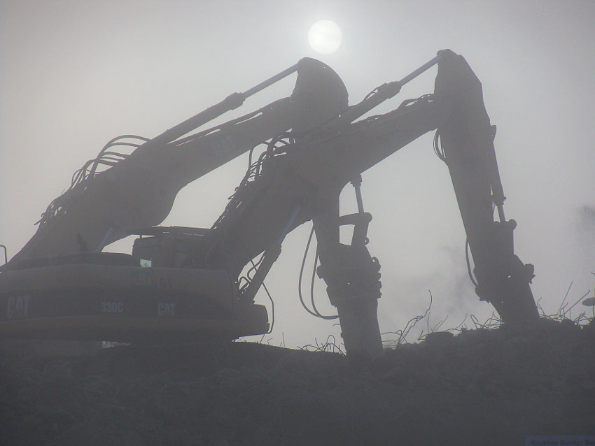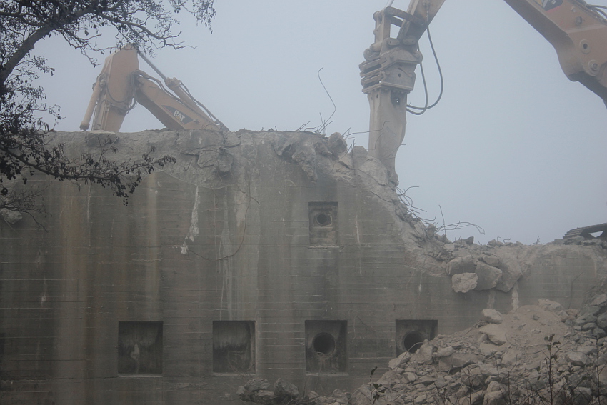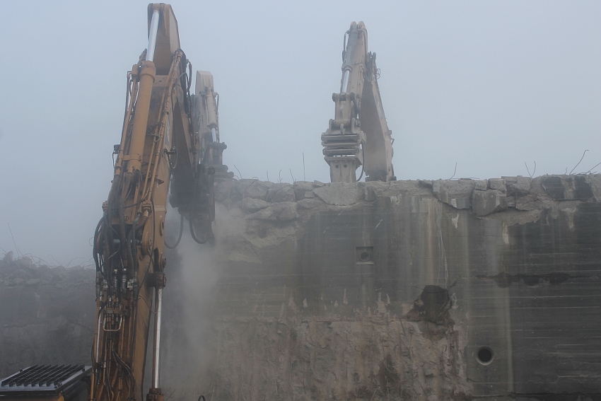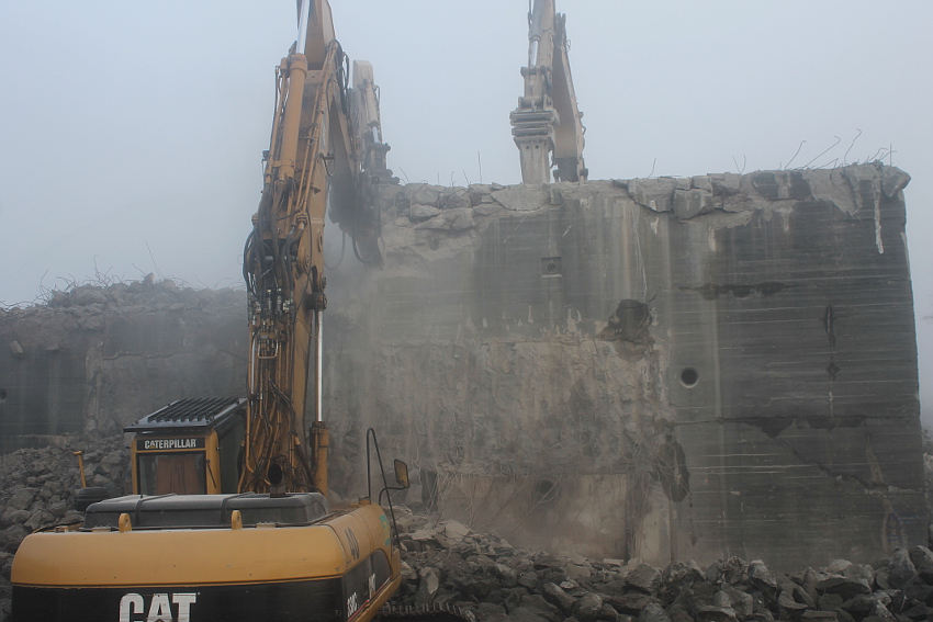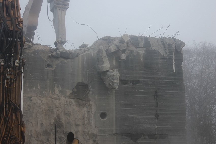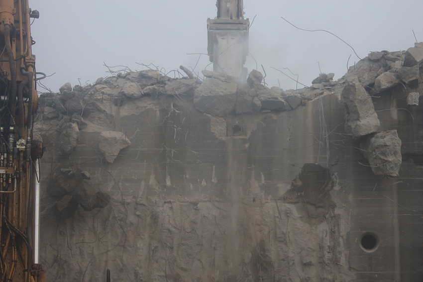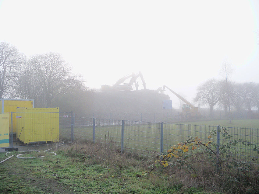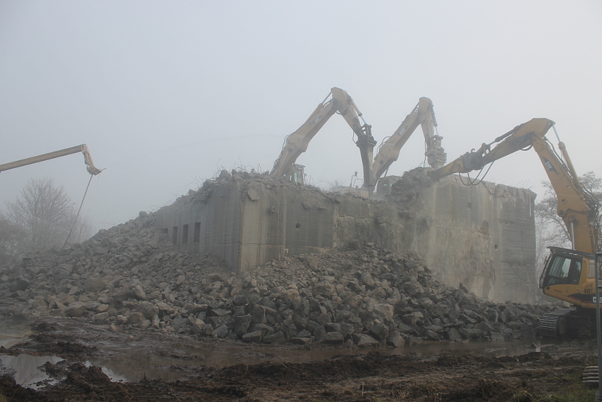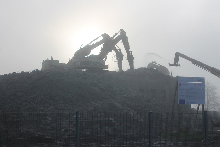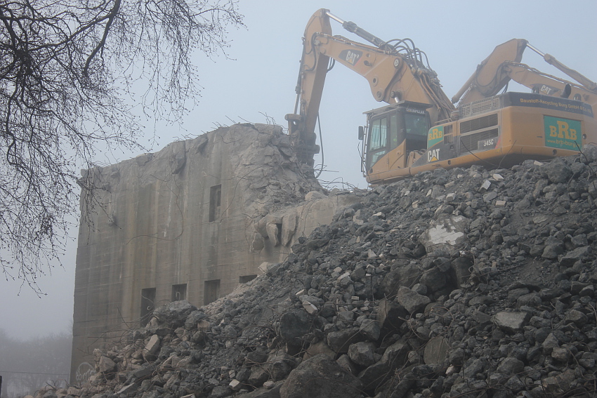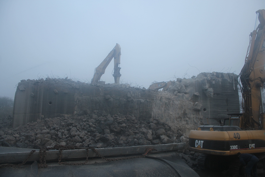 Vom Jadebusen herangezogene dichte Nebelbänke hüllten den Abriss heute streckenweise erneut in eine gespenstische Atmosphäre. Wieder schritt der Abbruch in beschleunigtem Tempo voran. Die Außenwände des ehemaligen OG 2 wurden bis auf einen Rest im Südwestbereich des Bunkers heute vernichtet. Der Schuttberg wächst und wächst.