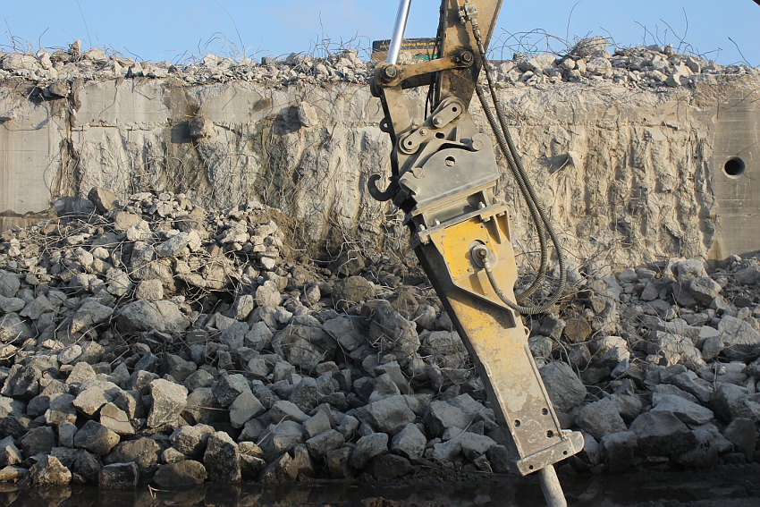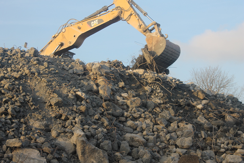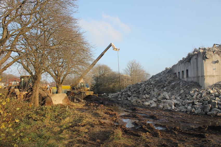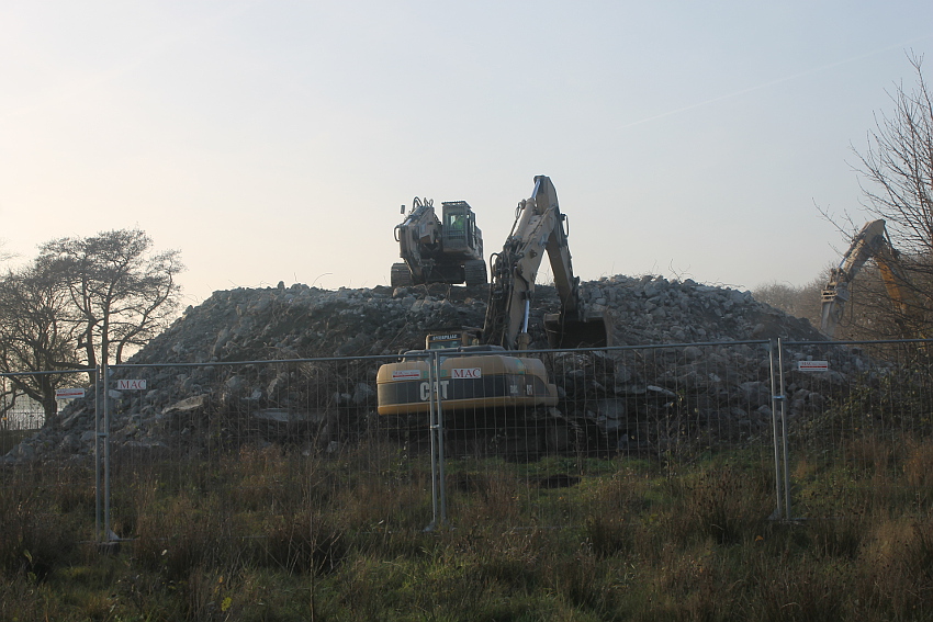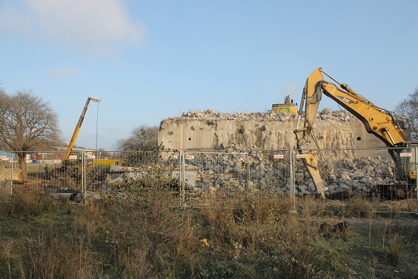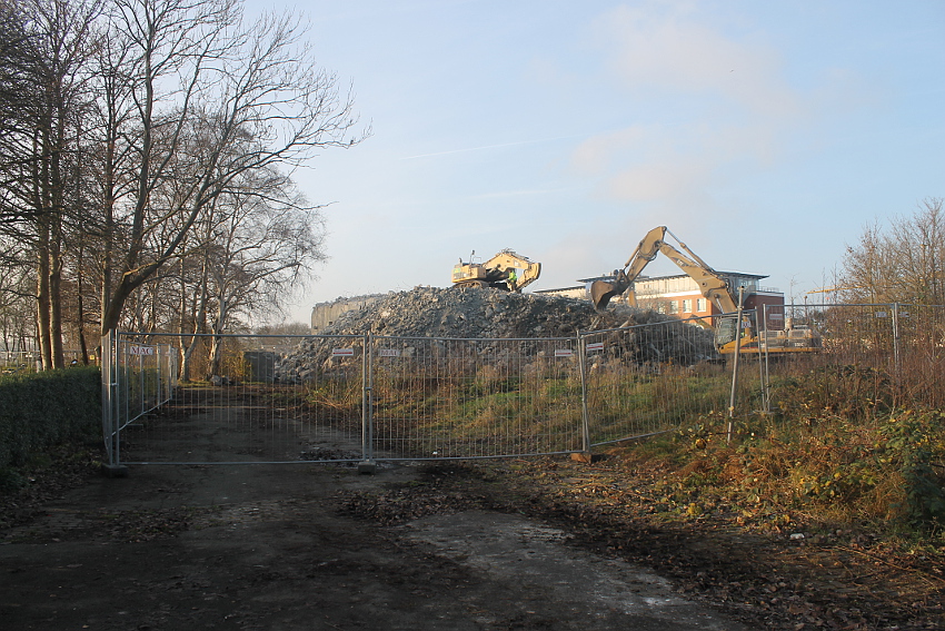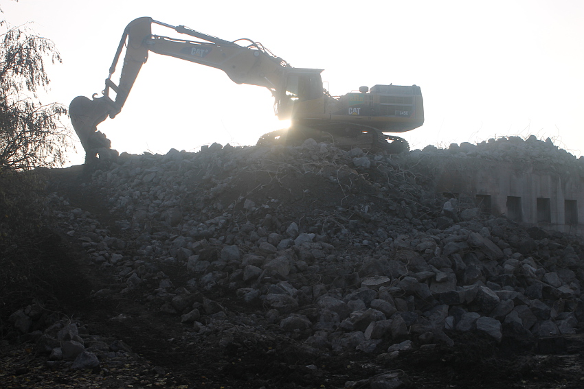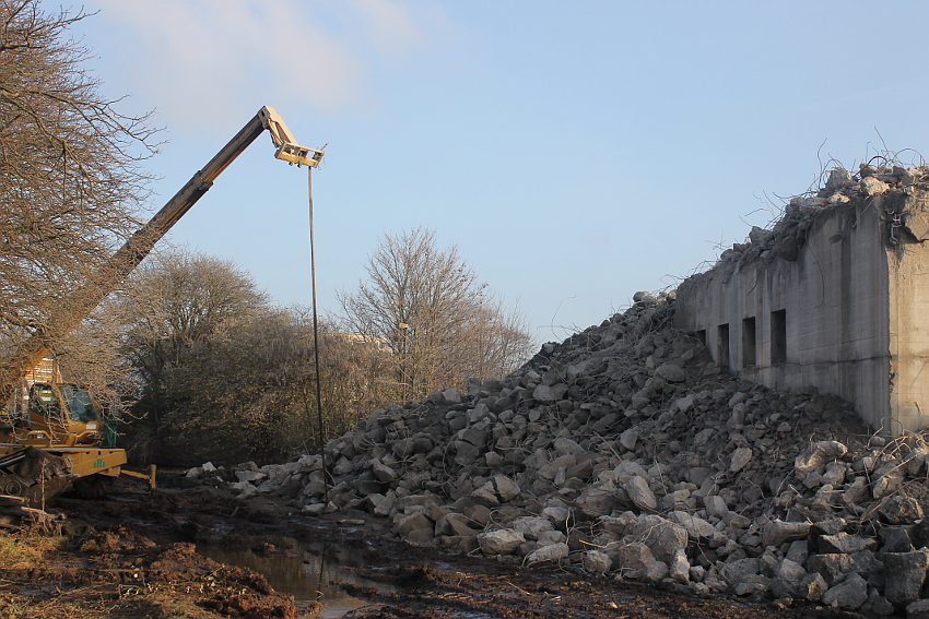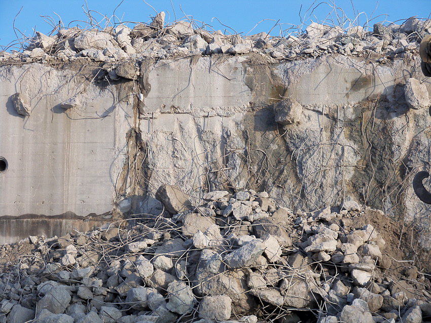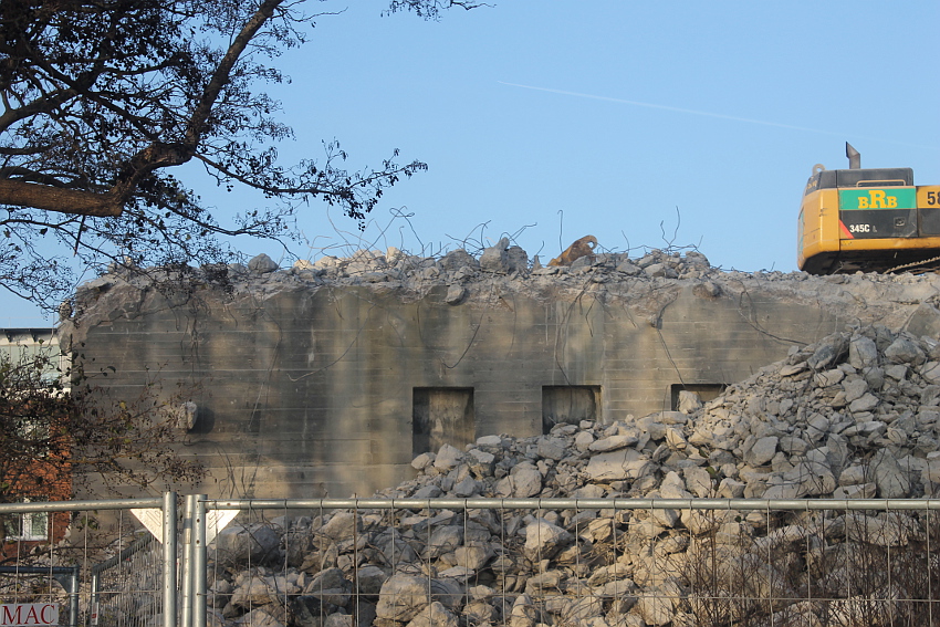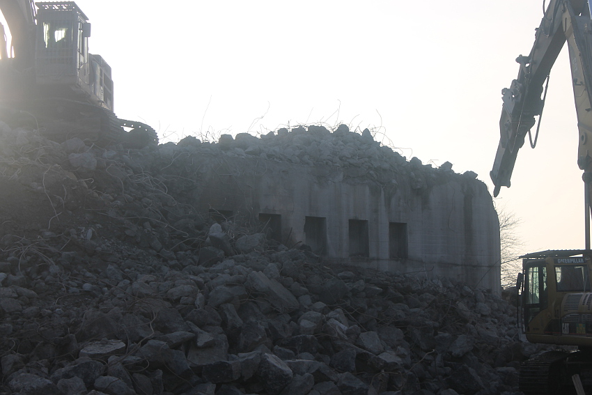 Der letzte Rest des ehemaligen OG 2 vom T 750 in dessem Südwestbereich wurde heute zerstört. Die gesamte Außenwand des OG 2 ist nunmehr Vergangenheit. Es wurde heute damit begonnen, den mittlerweile entstandenen gigantischen Schuttberg nach Osten hin zu verlagern, um an die verschütteten Teile des Bunkers zu gelangen. Eventuell soll bereits nächste Woche die "Brechmaschine" eintreffen, welche dann nach und nach den Betonschutt zerkleinert. Dafür wurde die Baustelle um rund 25 Meter nach Osten hin erweitert und auch der Bauzaun folglich weiter nach Osten versetzt.