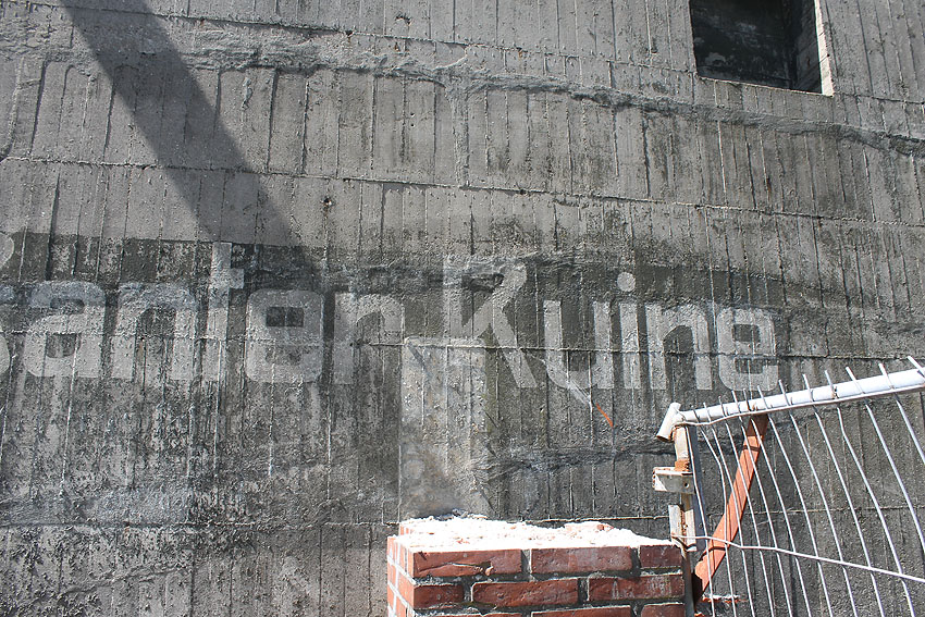 Noch einmal Aufnahmen vom Hinweispfeilrest (siehe auch weiter oben) unmittelbar links neben dem Schriftzug Banter Ruine und dem darunterliegenden Hinweisfeld, den wir am 25. April 2013 während unserer Vereinsbegehung der Bunker fotografierten: