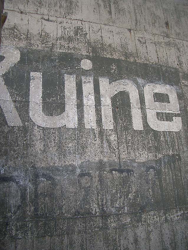 Nach dem Osterfeuer 2015 nahe des Bunkers wurde beim Abtransport der Getränkewagen der Torpfeiler an der Ostwand des T 750 teilweise zerstört. Nun ist der Schriftzug Banter Ruine wieder gänzlich zu sehen.