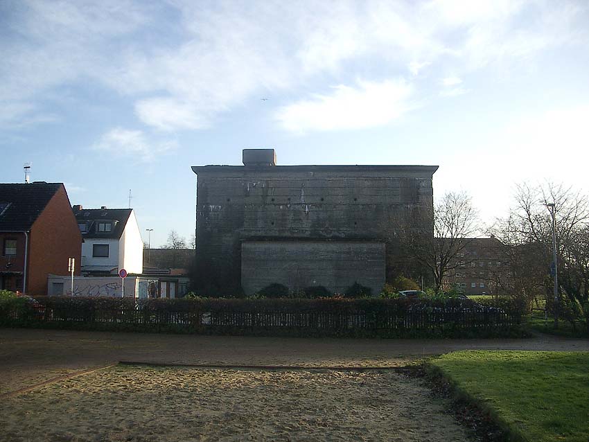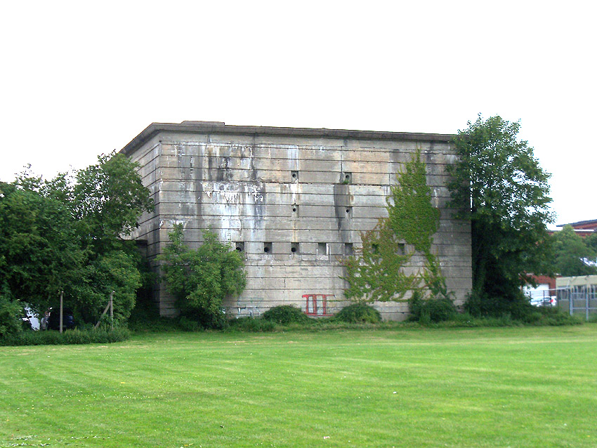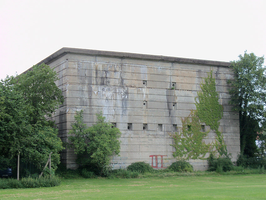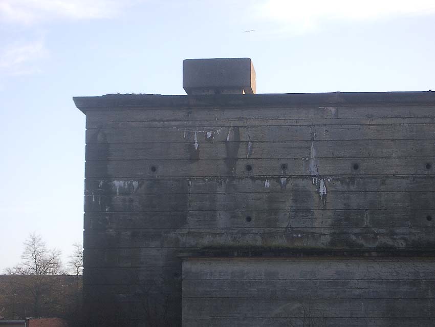 Der Bunker ist äußerlich relativ gut erhalten. Er ist jedoch circa 1,00 m höher als "normal" angelegt. Seine Zugangsbauwerke sind deshalb über Treppen erreichbar (ähnlich wie beim "Scharnhorstbunker" in Kiel). Warum diese erhöhte Bauweise erfolgte, ist mir noch nicht bekannt. Es könnte eventuell sein, dass das Objekt über ein viertes halbkellerartiges ( 3,5 Stockwerke...) Geschoss verfügte. Sozusagen Ebene "0". Ich halte dies aber für ziemlich ausgeschlossen. Der Bunker wurde von innen gesprengt, Teile des Treppenhauses sind jedoch noch begehbar. Von der Sprengung zeugen die vielen kleinen Risse an der Fassade. Auffallend sind die kerbenartigen Streifen / Vertiefungen an den Außenwänden des Bunkers. Siehe dazu auch: