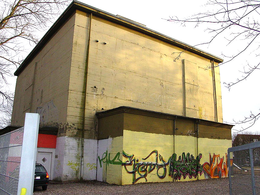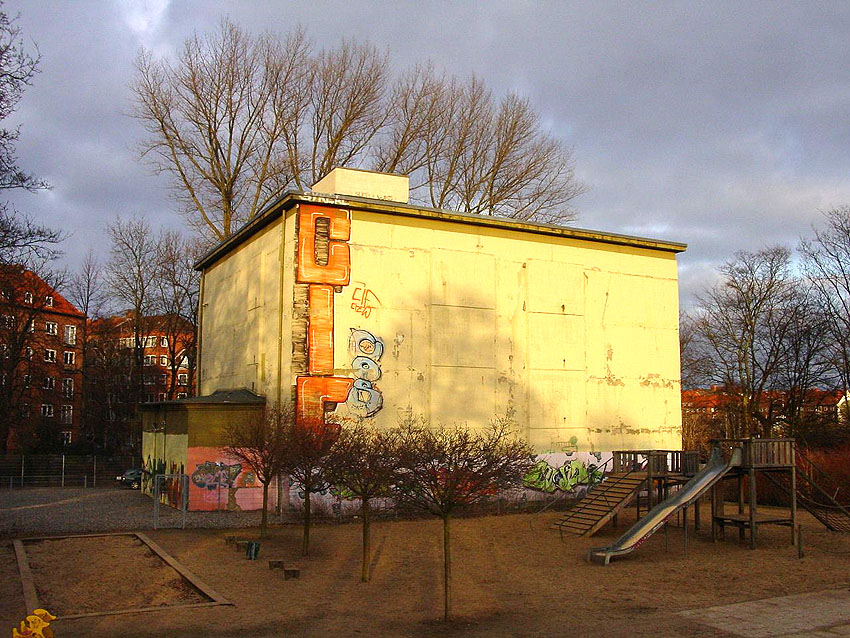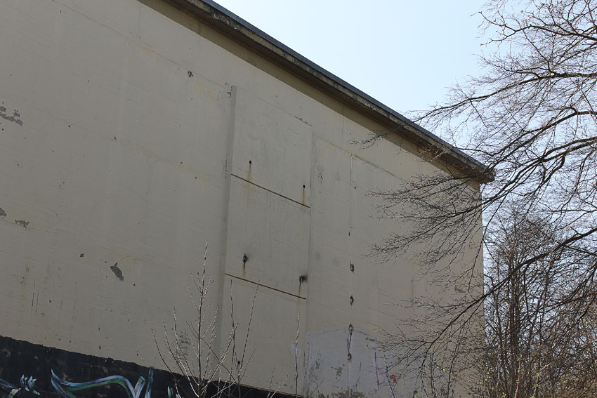 Auch die Öffnungen im Lüftungsturm scheinen verschlossen zu sein. An den hervorgesetzten Wandbereichen finden sich stattdessen einige im Zuge der Herrichtung angebrachte Öffnungen (hier rechts im Bild)... Interessant ist der Dachkragen des Bunkers. Genau wie in Bremerhaven (ehemals Wesermünde) an den Truppenmannschaftsbunkern sind auch hier relativ starke Hervorsetzungen vorhanden. Wie in Bremerhaven sind hier auch die Dachkanten der Splitterschutzvorbauten mit Hervorsetzungen versehen. Der Lüftungsturm selbst ist nicht im Eckbereich des Daches platziert, sondern mittig zur Westdachkante. Auch ist er größer als regulär. Der Bunker selbst ist (in der Proportion um 90 Grad zum Standard versetzt) minimal rechteckig - Breite ca. 23,00 m x Tiefe 21,00 m - , statt (annähernd) quadratisch - Breite 21,00 m x Tiefe 21,60 m - in seiner Grundrissform realisiert worden.