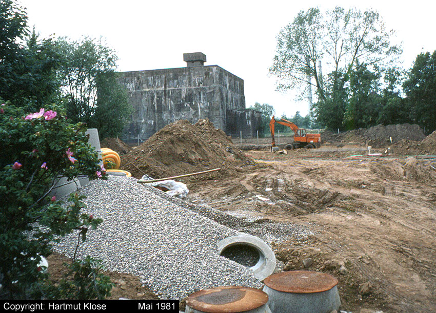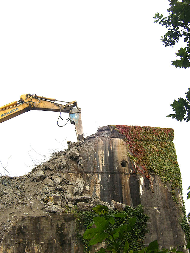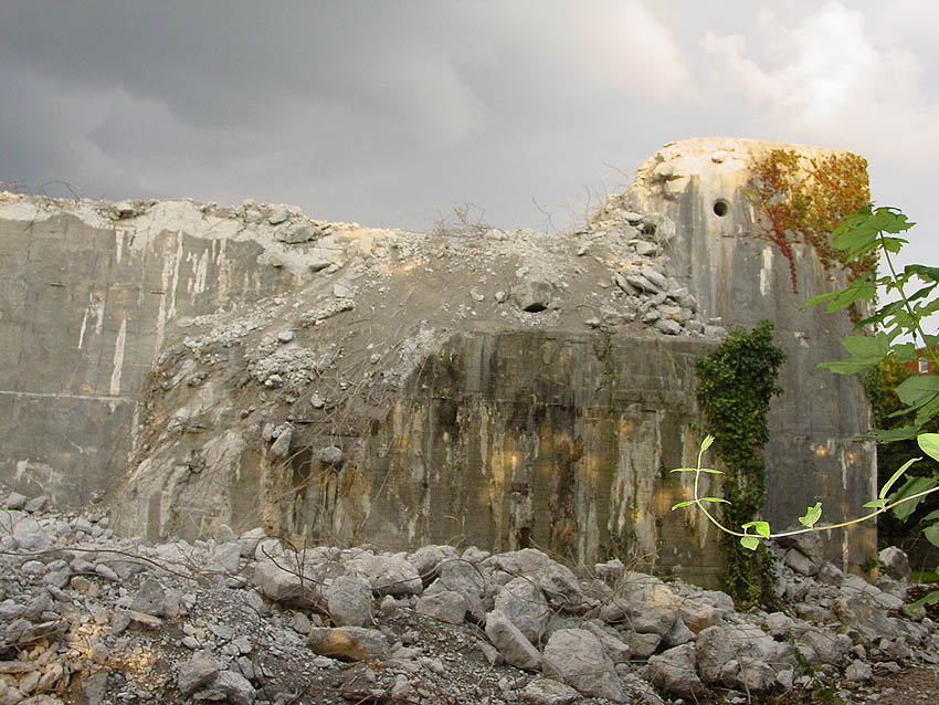 In der letzten Juliwoche 2007 begann ohne vorherige Ankündigung nun der geplante Abriss des T 750. Innerhalb weniger Wochen wird das Bauwerk unter anderem der projektierten Errichtung eines Famila-Marktes weichen. Eine "Rampe" aus Sand für den schweren Bagger, welcher von oben beginnend den Bunker Schritt für Schritt abträgt, wurde angeböscht. Die folgenden Innenaufnahmen zeigen eindeutig, dass der Bunker nach dem Krieg innerlich gesprengt wurde. Dies ist die einzige bisher nachgewiesene neuzeitige Beseitigung eines T 750. Man sieht, dass in der heutigen Zeit auch eine 3,75 Meter-Stahlbetonabschlussdecke einem modernen Abbruchwerkzeug nur unwesentlichen Widerstand entgegenzusetzen vermag. Wir berichten weiter über dieses Ereignis. Hier nun die ersten Fotos von J.Schwarzenberg, welcher vor Ort den Abriss für die Nachwelt festhält: