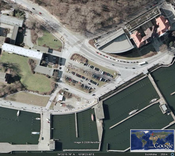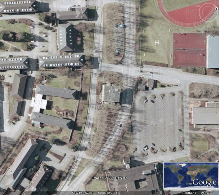 Nachtrag 28.12.12: Ein uns nun vorliegendes Luftbild aus dem April 1945, das wiederum den gesamten Bereich Blücherbrücke und Marinestation Ostsee zeigt, weist keinerlei T 750, geschweige denn eine T 750-Baustelle auf. Das bedeutet, eventuell lag der Kieler T 750 4 Düsternbrook wiederum außerhalb des Bildbereiches, was aber unwahrscheinlich ist, da das Luftbild im Original bis weit nach Süden und auch weithin nach Norden in Richtung Kiel-Wik reicht. Nichts was an einen T 750 erinnert, ist auf dem Bild zu erkennen. Zu sehen ist auf dem 1945er Luftbild wiederum der Hochbunker an der Blücherbrücke. Über das obere Bild von 1944 hier ein passender Ausschnitt des Luftbildes von 1945 gelegt: