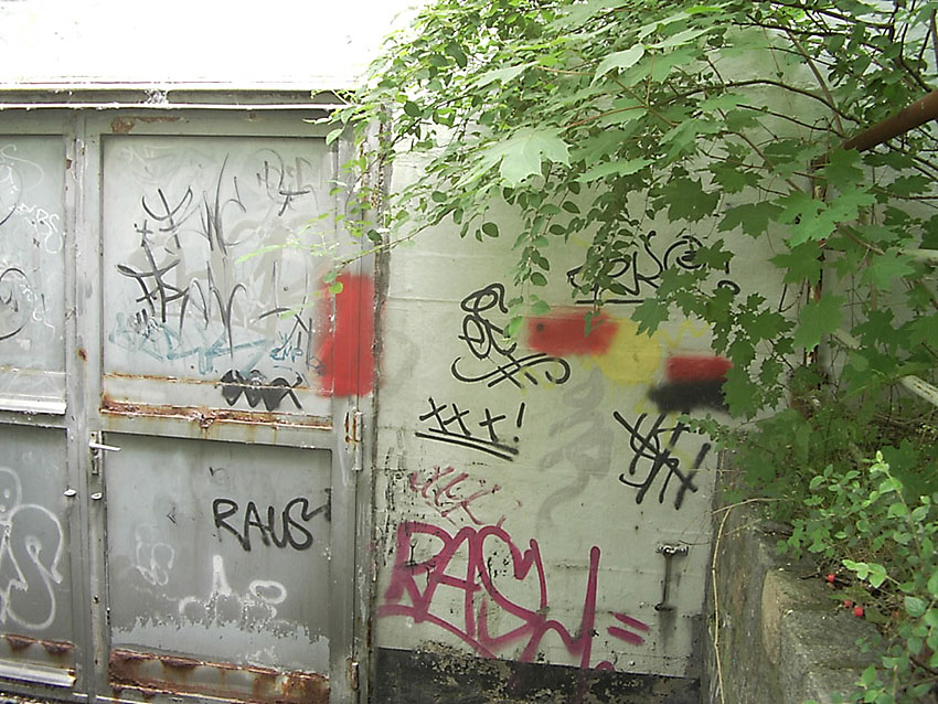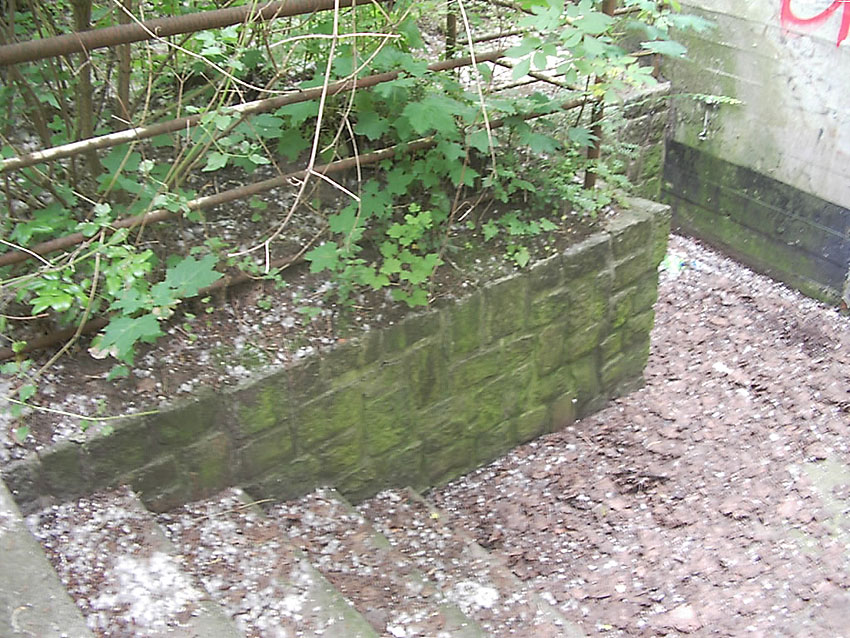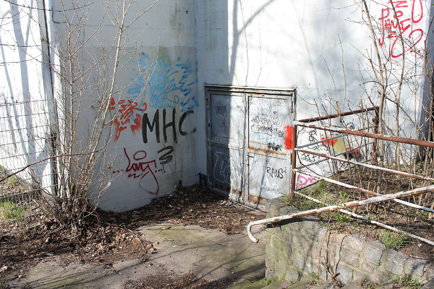 Wie im Bild weiter oben: Die seitlichen Einschnitte im Bereich der massiven Splitterschutzvorbauten wurden augenscheinlich bis durch die Decke des Bunkers getrieben.