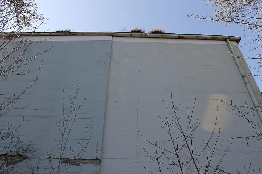 Wäre der Lüftungsturm nicht entfernt worden, wäre er aus diesem Blickwinkel heute wie oben dargestellt erkennbar (kleiner Anbau vorne aus Nachkriegszeiten). So, wie links in der Montage dargestellt, werden die ursprünglichen Luftschächte ausgesehen haben.