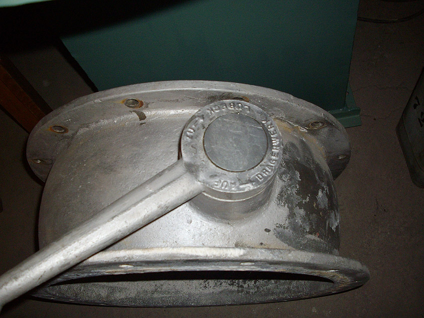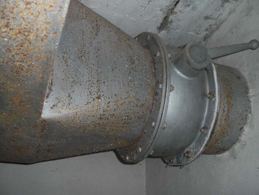 In den Truppenmannschaftsbunkern befanden sich meist zwei Arten von Druckschutzklappen vor den inneren Lüftungsschachtmündungen. Die kleinere Version für die Schächte mit geringerem Querschnitt, sowie nicht ganz so häufig wie die kleinere Version im Bunker vertreten die größere Version für die Lüftungsschächte mit großem Querschnitt. Hergestellt wurden die Klappen meist durch die Stahlbaufirma Klement und Sohn. Hier abgebildet ist eine der größeren Schutzklappen.