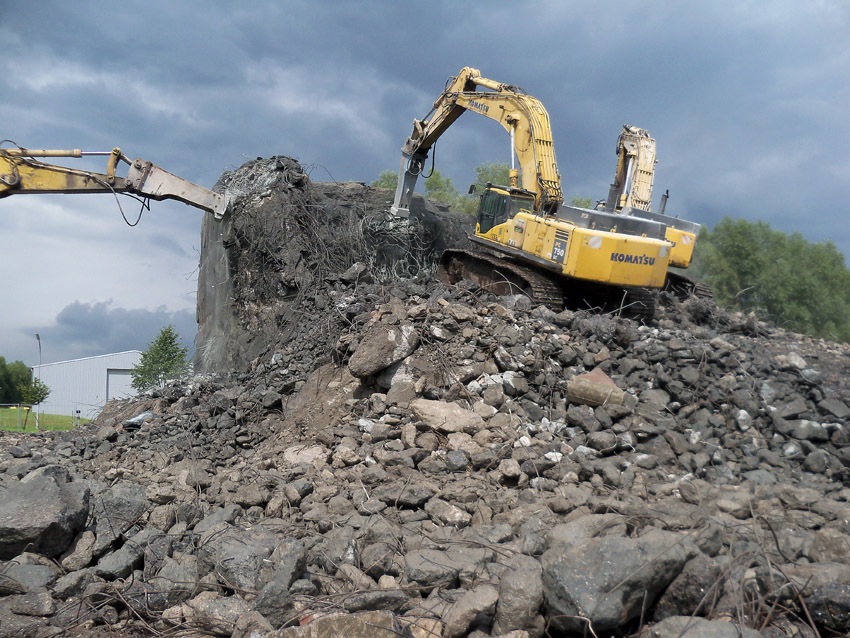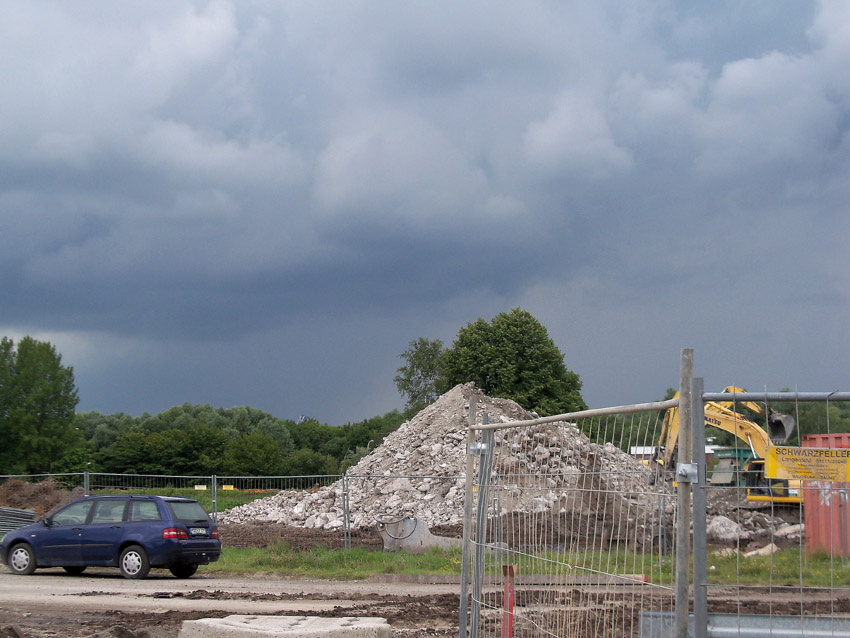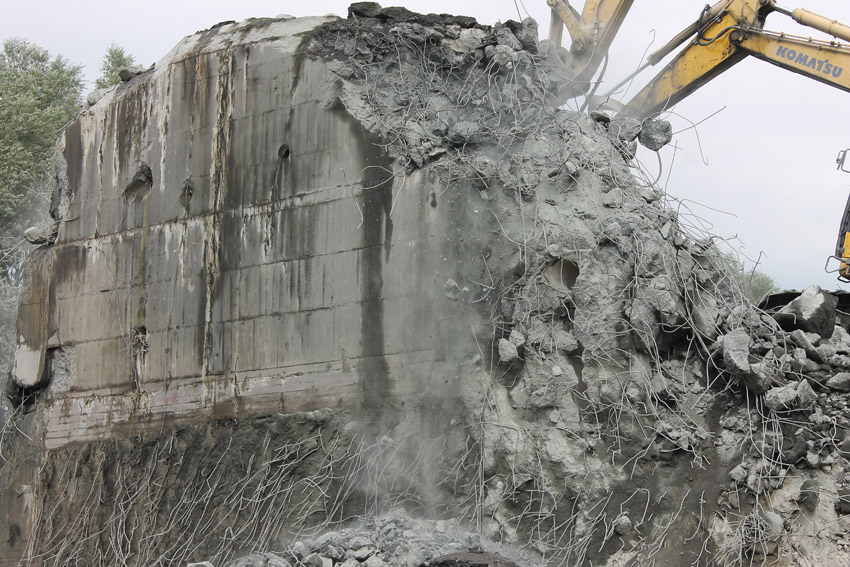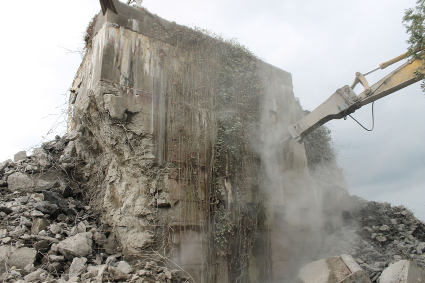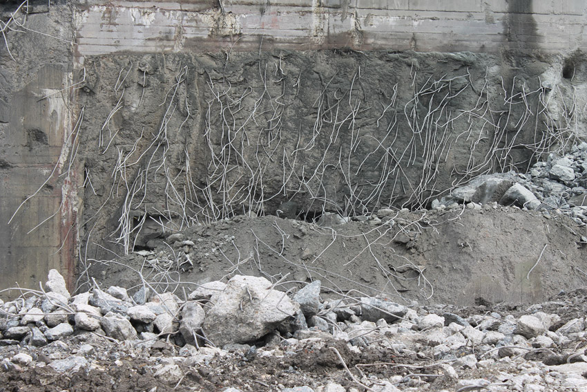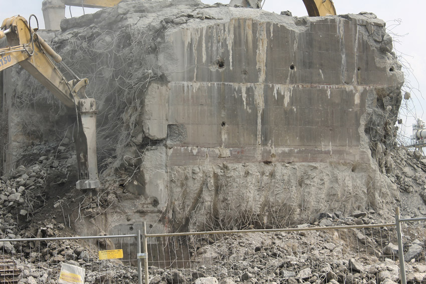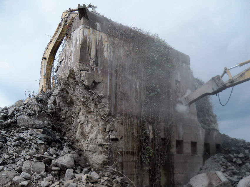 Abrisstag 27: Der Ost-T 750 wurde nach Norden hin nun großteilig durchbrochen. Zwischen Abschlussdecke und OG1 klafft jetzt im OG2 ein gewaltiges Loch. Während im Bereich T 750 West, der mittlerweile lediglich einen überdimensionalen Schutthaufen darstellt, die Brechmaschine unermüdlich den Beton zerkleinert, sind die letzten Tage des T 750 Ost angebrochen, der nun zusehends immer mehr an Struktur verliert...