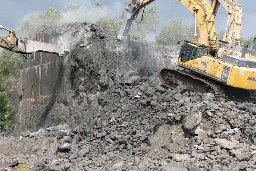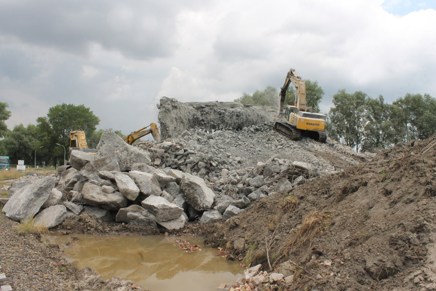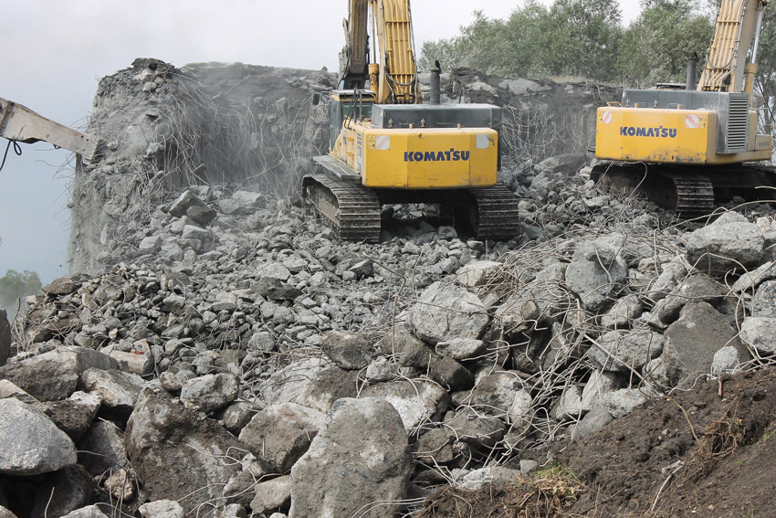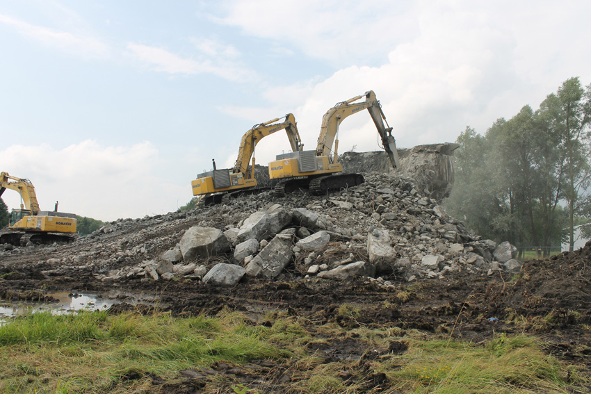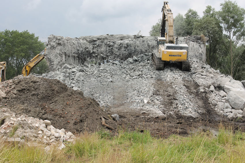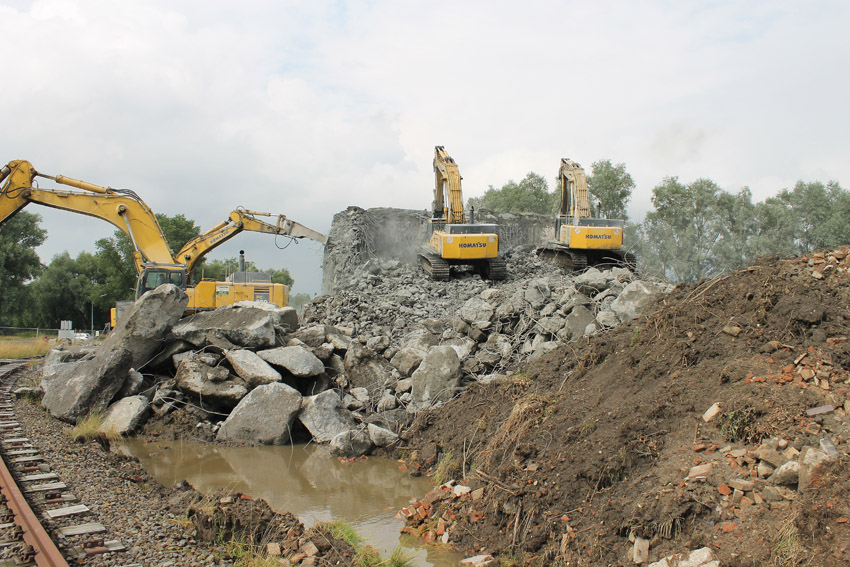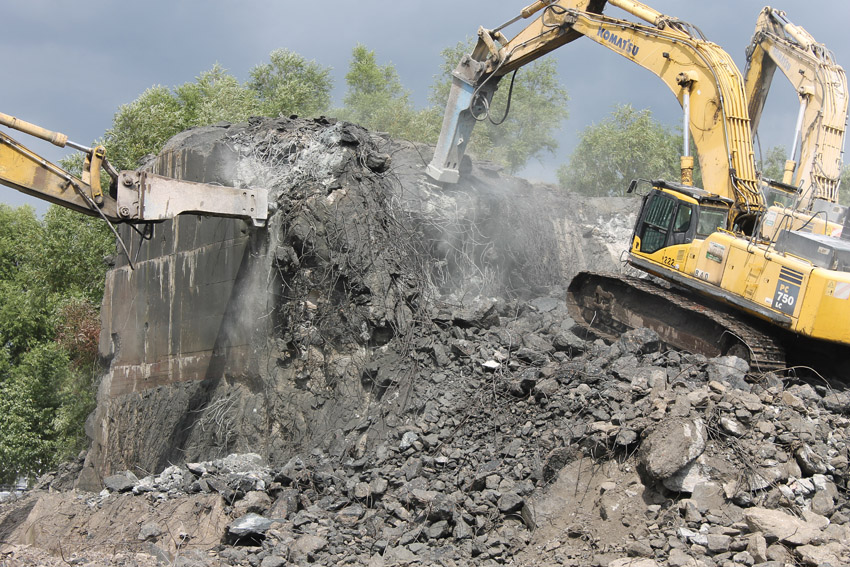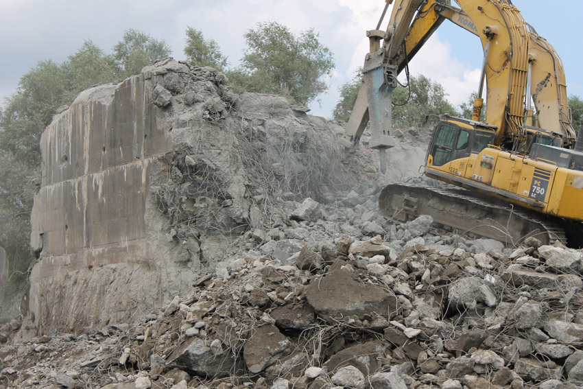 Abrisstag 27: Der Ost-T 750 wurde nach Norden hin nun großteilig durchbrochen. Zwischen Abschlussdecke und OG1 klafft jetzt im OG2 ein gewaltiges Loch. Während im Bereich T 750 West, der mittlerweile lediglich einen überdimensionalen Schutthaufen darstellt, die Brechmaschine unermüdlich den Beton zerkleinert, sind die letzten Tage des T 750 Ost angebrochen, der nun zusehends immer mehr an Struktur verliert...
