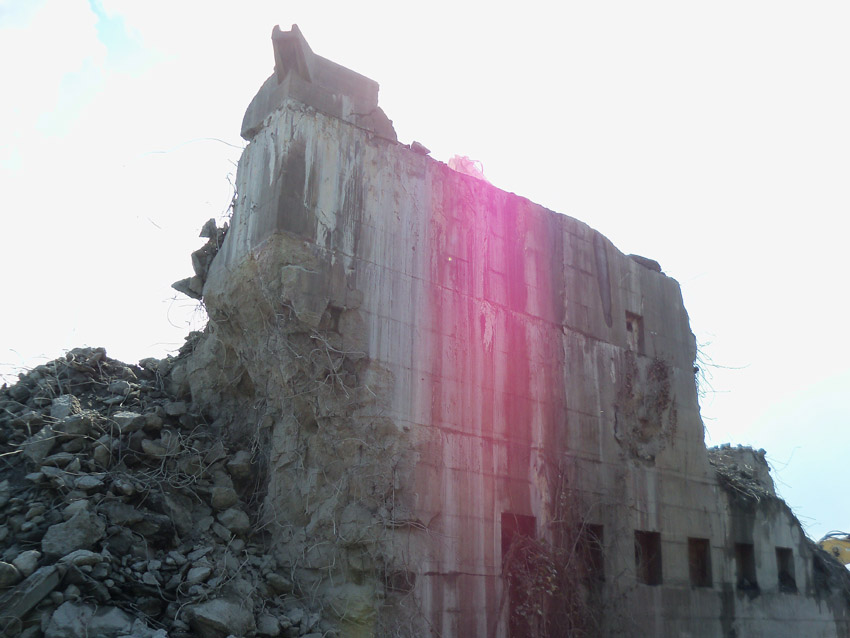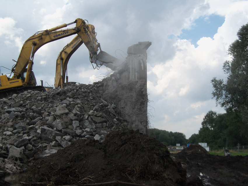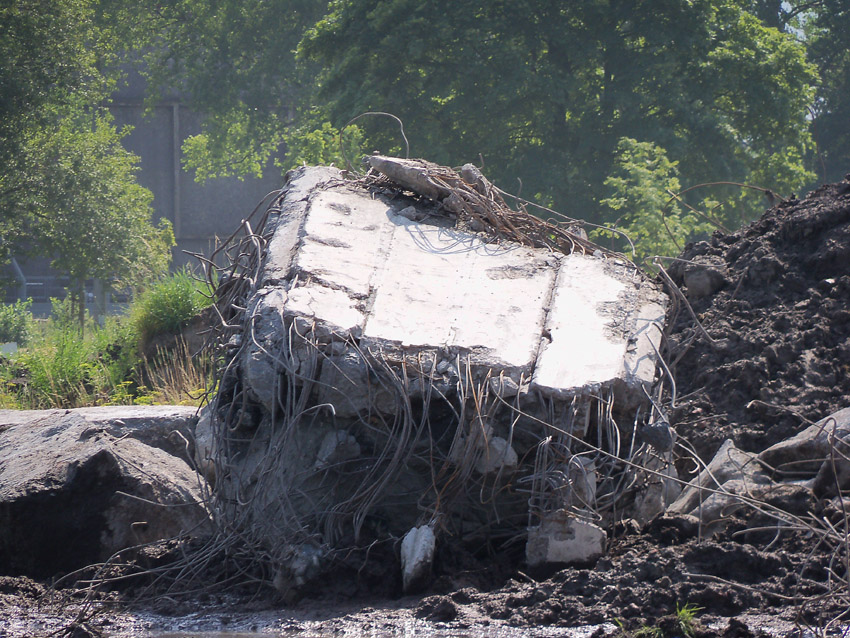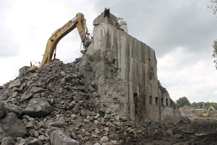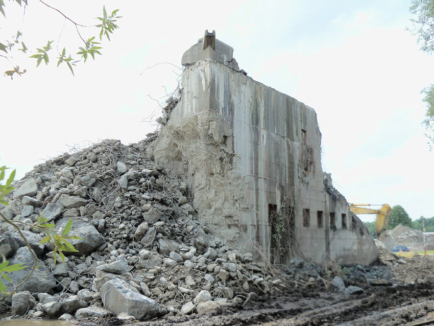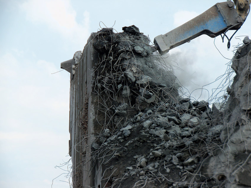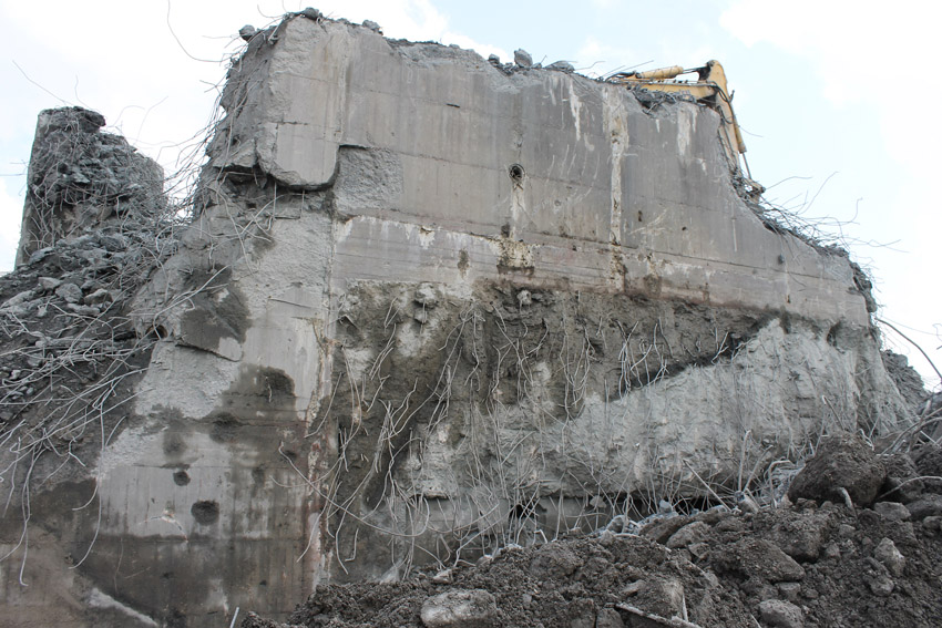 Abrisstag 28: Der Ost-T 750 wurde nach Norden hin im Bereich des Durchbruches weiter abgetragen. Ein Großteil der Decke wurde entfernt und in einem gewaltigen Betonquader südlich der Rampe abgelagert. Montag oder Dienstag wird die Struktur des T 750 Vergangenheit sein. Was heute noch wie eine Skulptur thront, ist der Wasserspeier Nordost. Wie ein Mahnmal sticht der Speier gen Himmel. Aber auch dies nicht mehr lang...