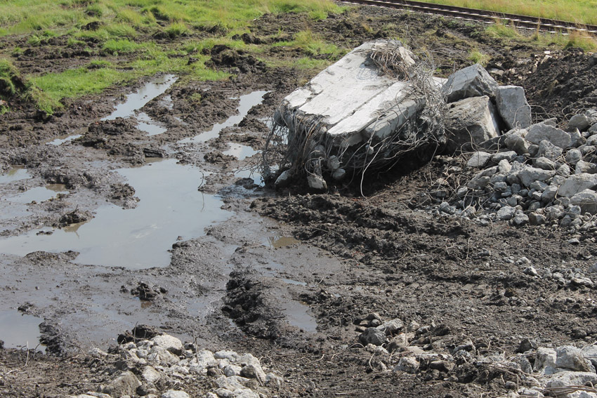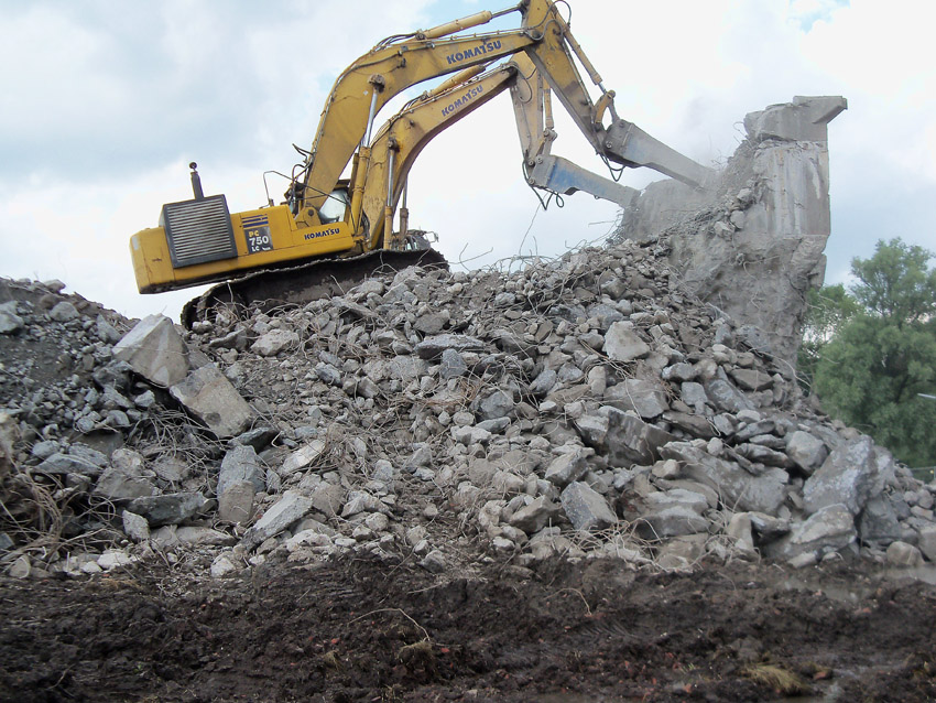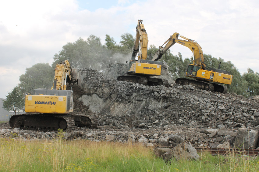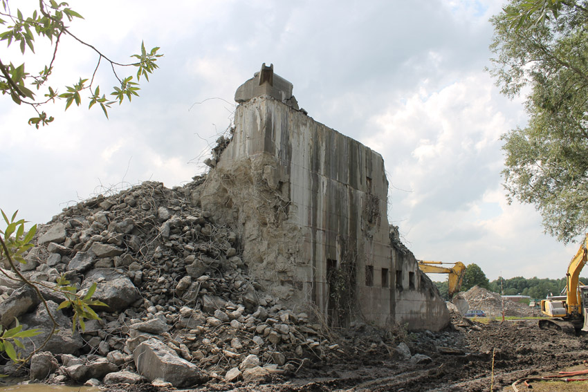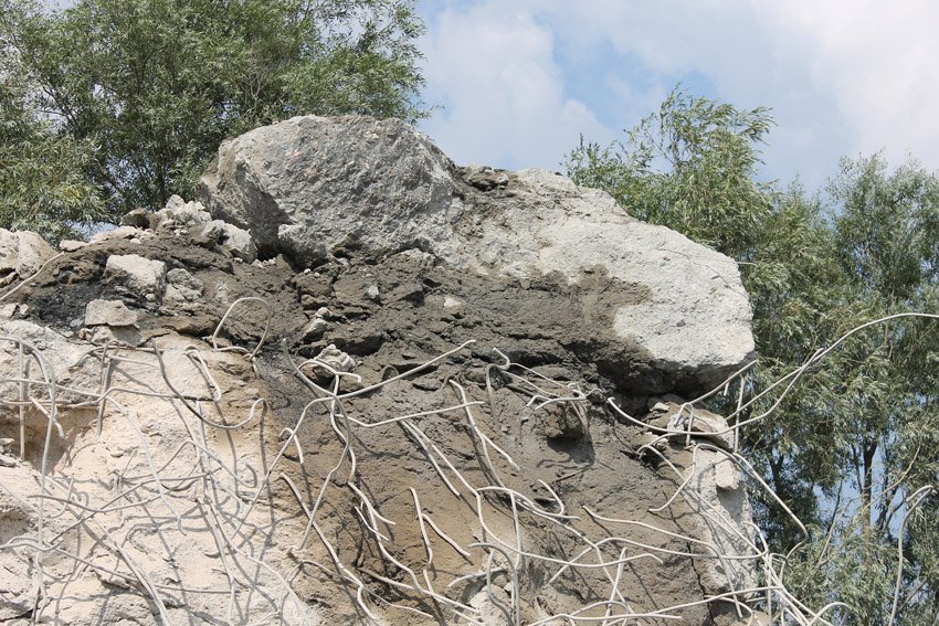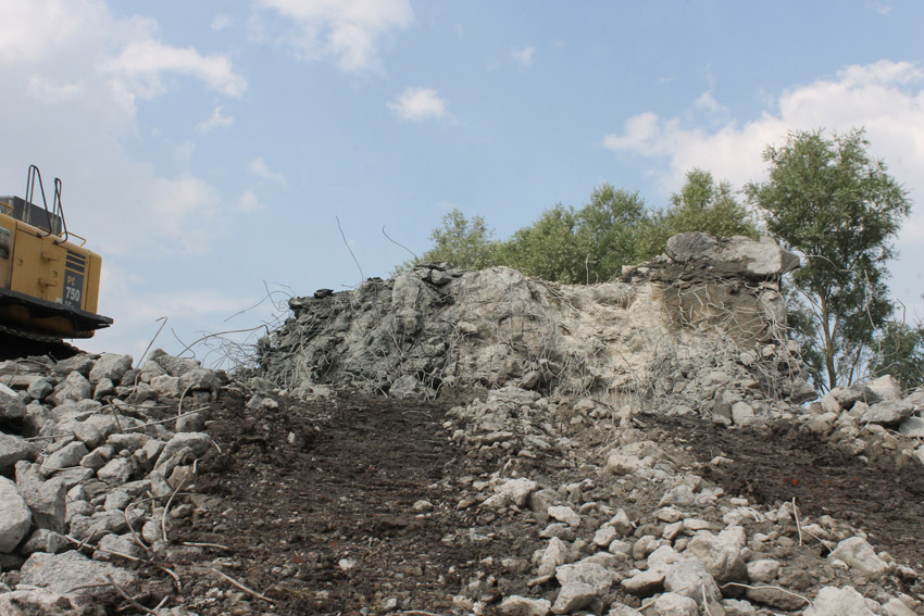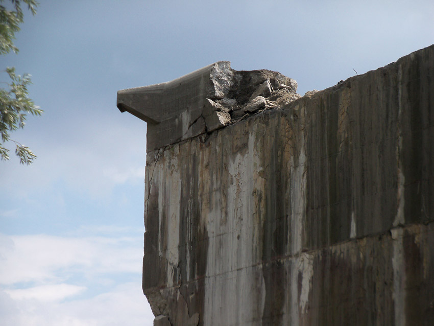 Abrisstag 28: Der Ost-T 750 wurde nach Norden hin im Bereich des Durchbruches weiter abgetragen. Ein Großteil der Decke wurde entfernt und in einem gewaltigen Betonquader südlich der Rampe abgelagert. Montag oder Dienstag wird die Struktur des T 750 Vergangenheit sein. Was heute noch wie eine Skulptur thront, ist der Wasserspeier Nordost. Wie ein Mahnmal sticht der Speier gen Himmel. Aber auch dies nicht mehr lang...