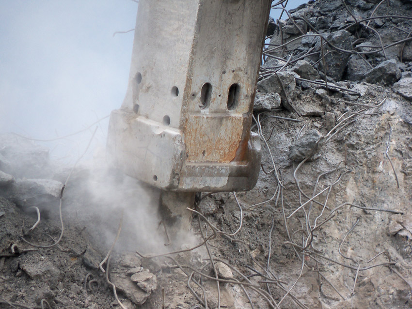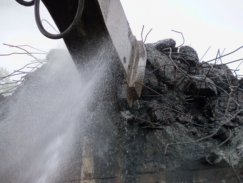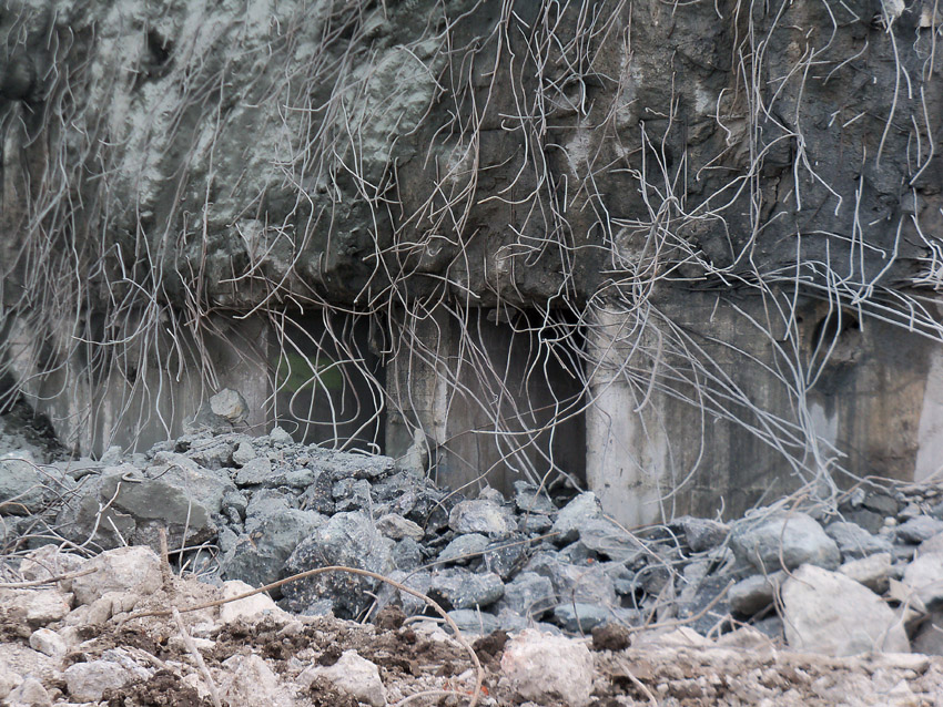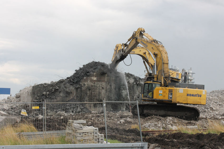 Abrisstag 30: Der Ost-T 750 ist nun bis fast zum Erdgeschoss abgetragen. Die Geschichte des Bunkers endet alsbald. Wir dachten, der Bunker hätte schon zum letzten Wochenende seine Struktur verloren gehabt, jedoch hat sein Rest noch eine "Schonfrist" bis zu dieser Wochenmitte erhalten.