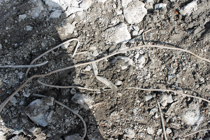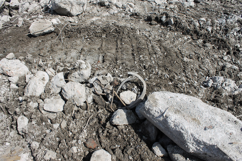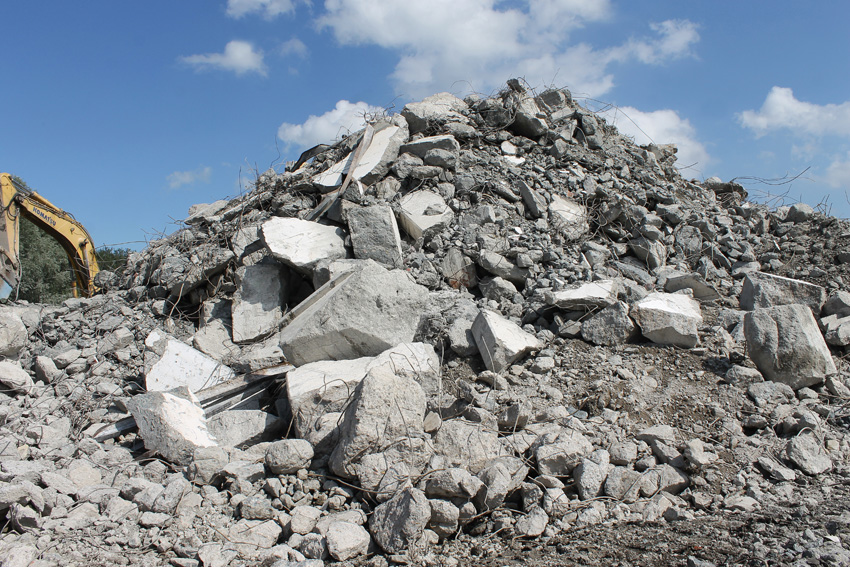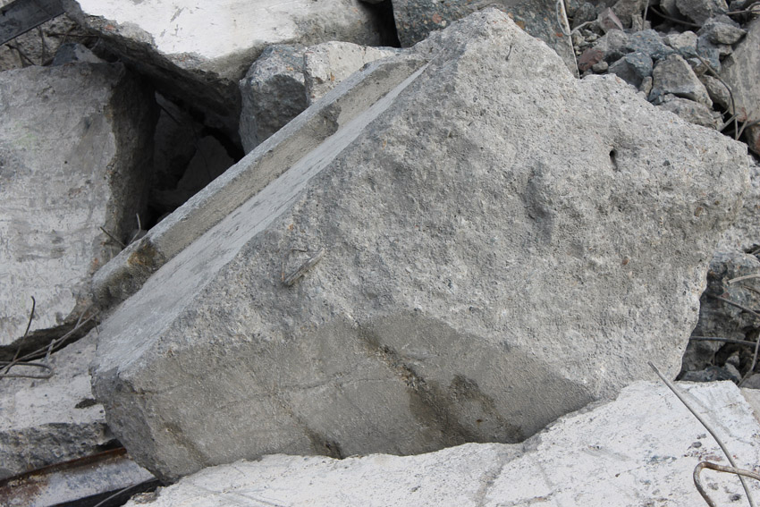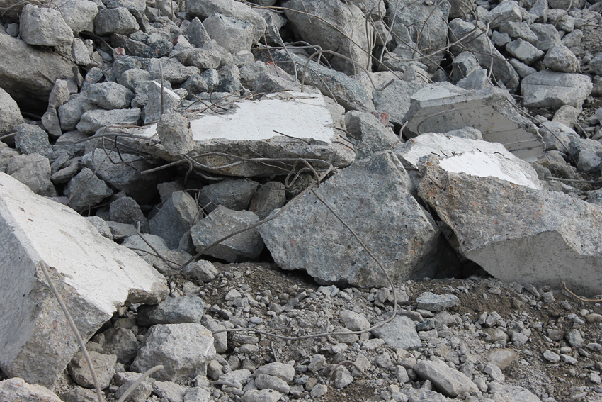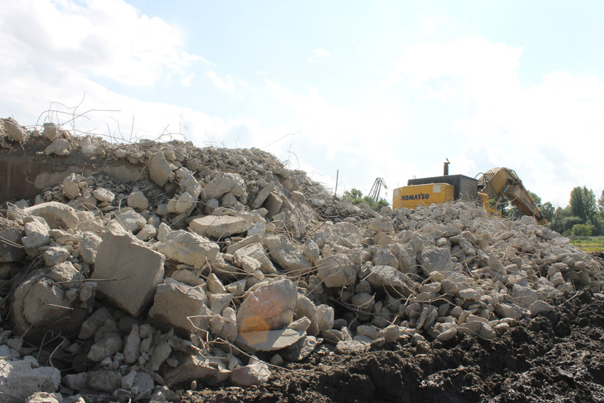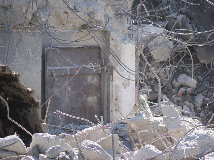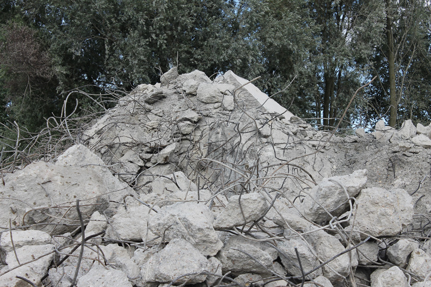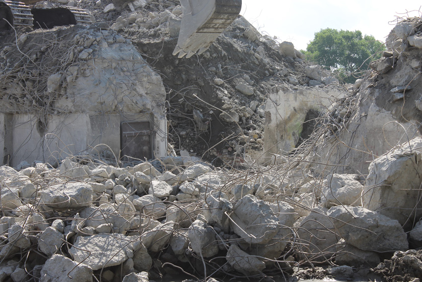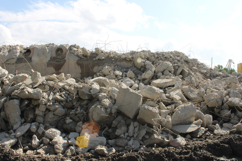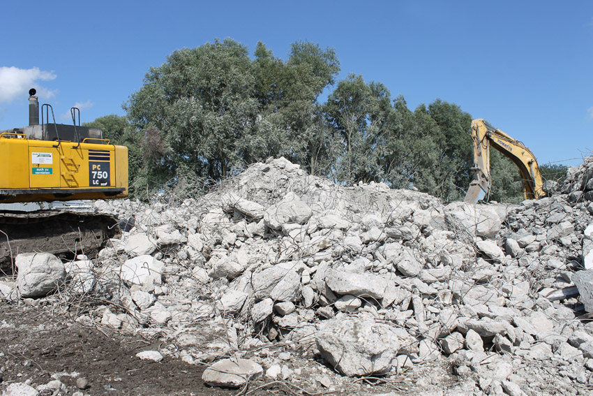 Abrisstag 31: Der Ost-T 750 ist jetzt auch im Erdgeschoss stark durchbrochen im Bereich seiner Außenwände. Der Innenbereich besteht im EG lediglich noch teilweise im Bereich der tragenden Wände des ehemaligen Treppenhauses. Noch einmal ist etwas Einsicht ins damalige Innere vorhanden, da Betonschutt entfernt wurde. Auch ein ehemaliger Schriftzug der Treppenhauswand ist ein wenig erkennbar. Morgen zu Feierabend wird sich das Bild des Ost-T 750 nicht mehr von der jetzigen Erscheinung des West-T 750 unterscheiden: Schutt...