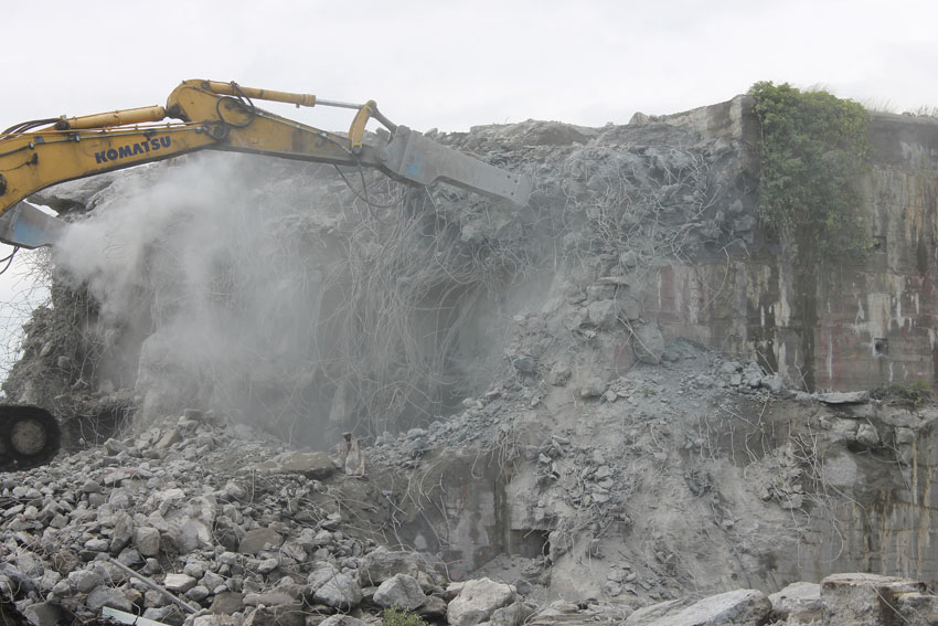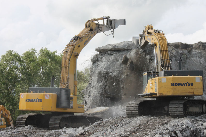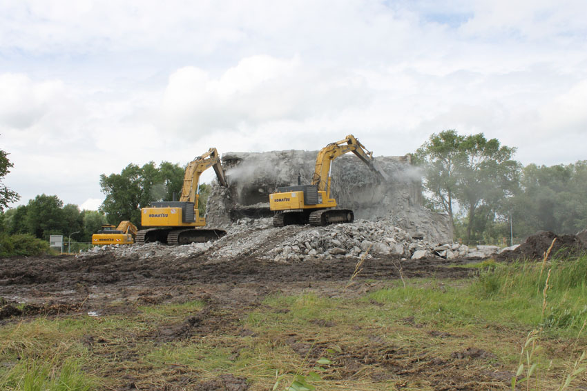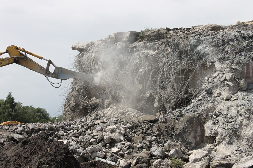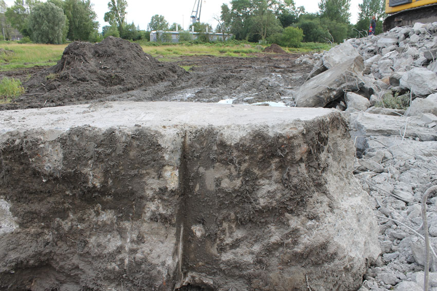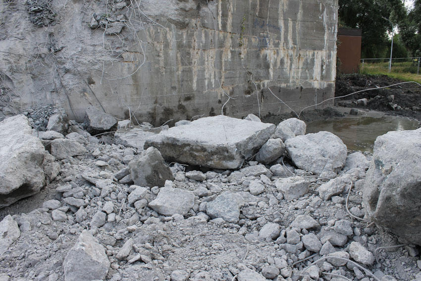 Abrisstag 7: Der gesamte Südbereich des Bunkers wurde weiter abgetragen. Es wird im Bereich des OG1 und 2 immer weiter in Richtung Bunkermitte vorgedrungen. Der Rest des Lüftungsturmes wurde vom Dach gestoßen und liegt nun östlich des Bunkers. Am Bunker Ost wurde der Ostsplitterschutzvorbau vom aufgeschütteten Erdreich befreit. Alles deutet auf einen baldigen Abrissbeginn hin, wir rechnen mit Mittwoch.