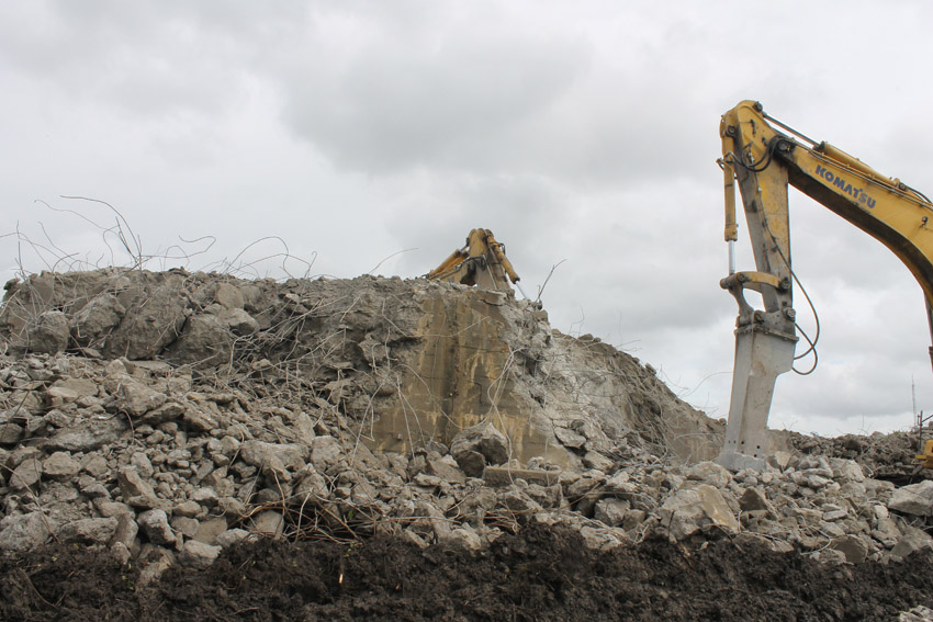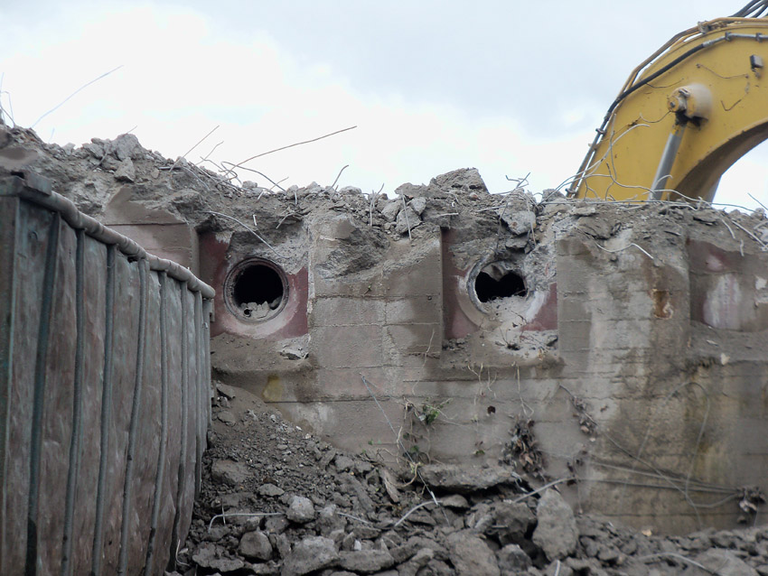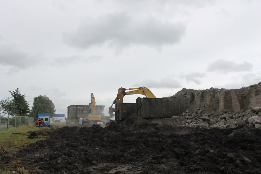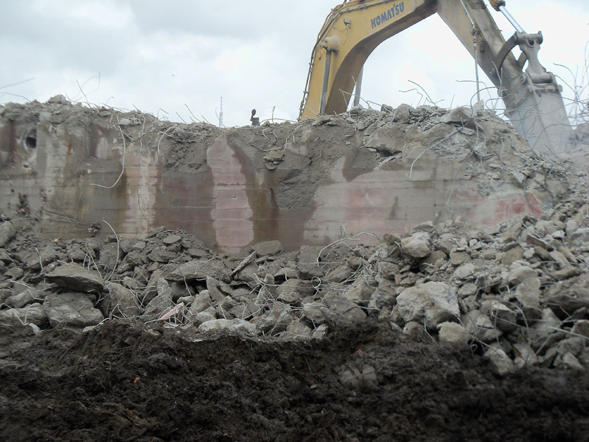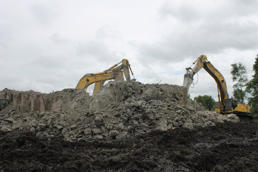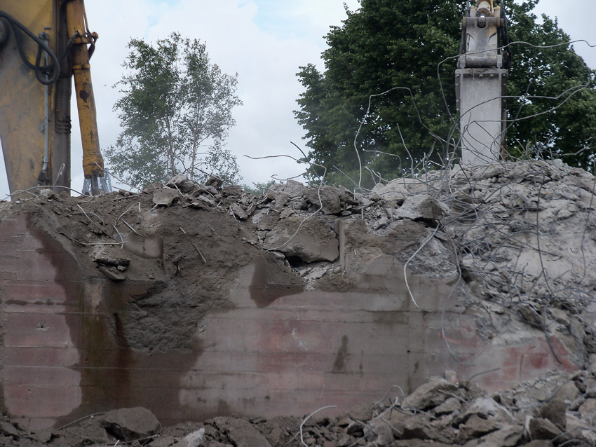 Abrisstag 16: Heute wüteten wieder Schauer und Sturmböen über Wilhelmshaven. Den Abbruch haben sie nicht beeinflussen können. Der T 750 West hat seine Struktur großteilig verloren, die Nordwand ist fast gänzlich zertrümmert. Die Bagger Typ PC 750 LC tragen die Bunker Typ T 750 ab. Die Gleichheit der Ziffern ist ein Kuriosum. Auch vom Splitterschutzvorbau West ist ein Großteil nun Vergangenheit. Zum Wochenende wird vom Bunker lediglich ein Trümmerfeld erkennbar sein... Die Abrissarbeiten am T 750 Ost beginnen kommenden Samstag oder Montag, nachdem die Meißelwerkzeuge am Westbunker nicht mehr benötigt werden.