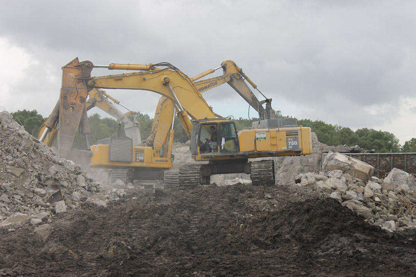 Die Bagger Typ PC 750 LC tragen die Bunker Typ T 750 ab. Die Gleichheit der Ziffern ist ein Kuriosum.