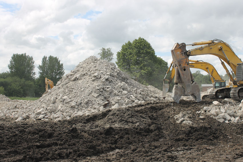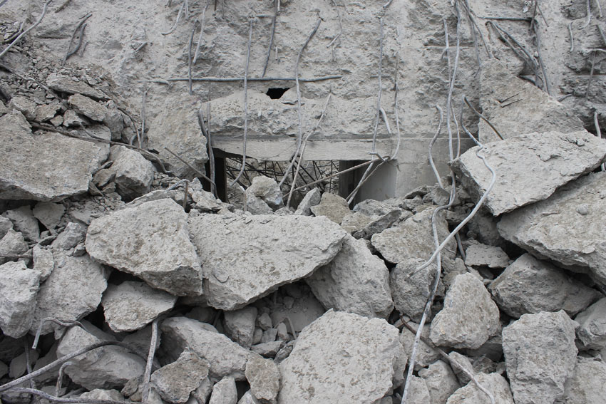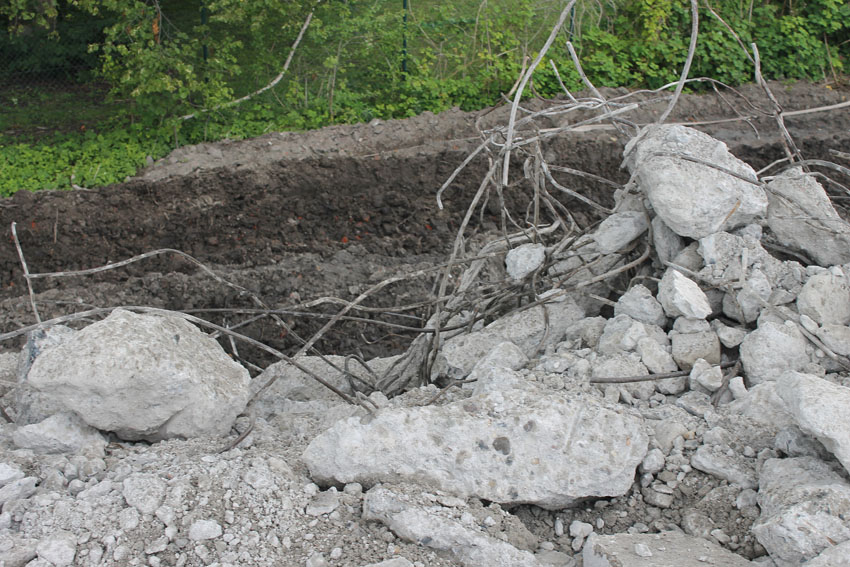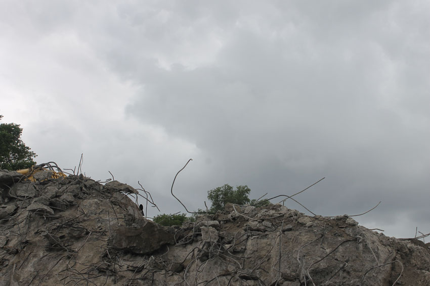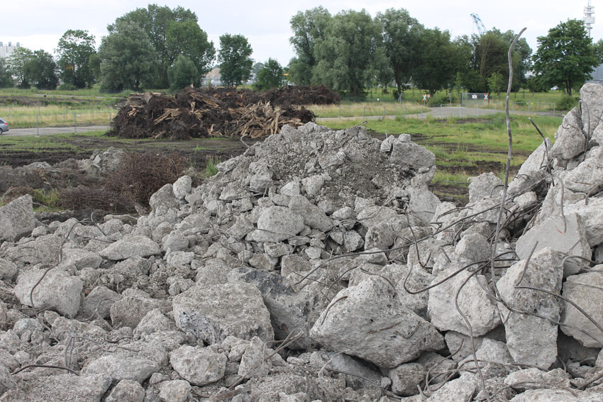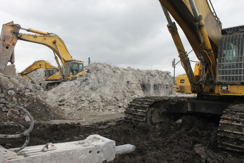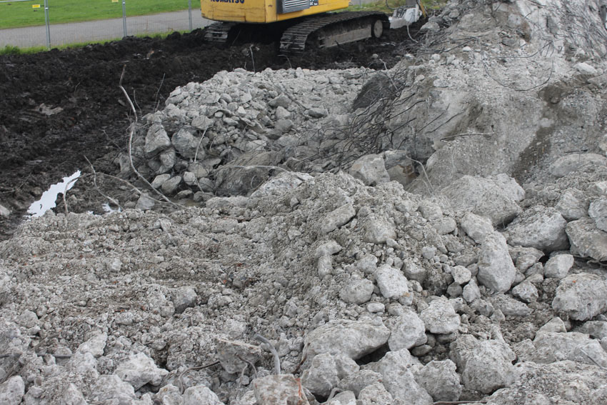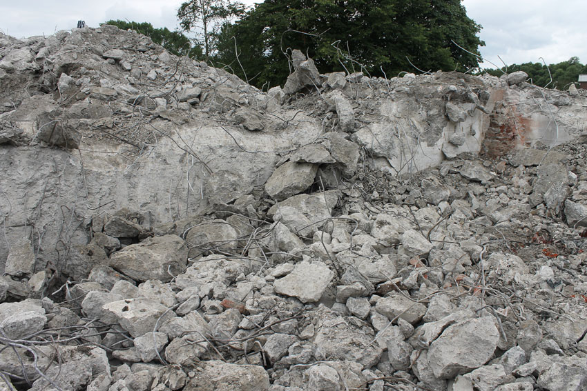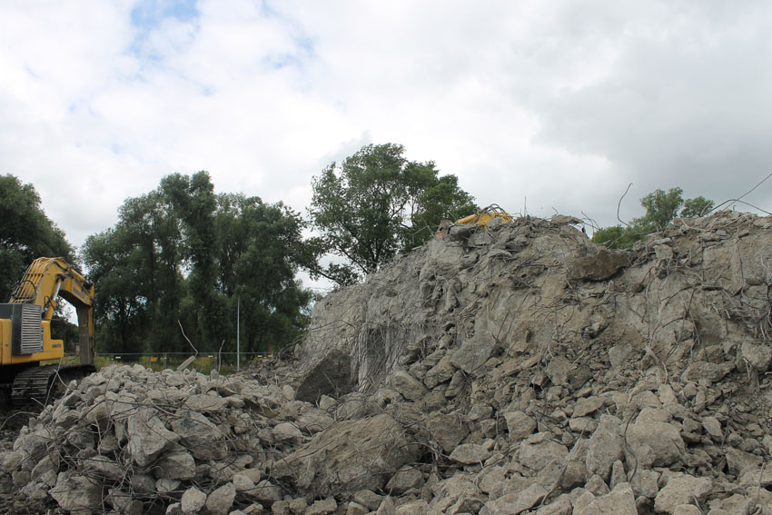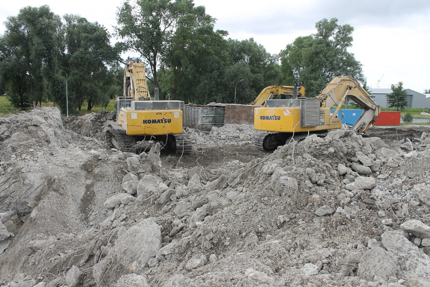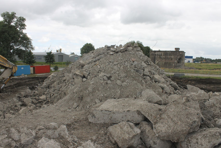 Abrisstag 18: Vom West-T 750 ist nicht mehr viel übrig. Lediglich die Südwand zeigt noch erhaltene Reste auf, wie auch die Westwand mit den beiden äußeren Gasschleusenzugängen. Was sich dem Betrachter sonst noch bietet, ist ein gigantischer Trümmerberg, der sich mit einer Höhe von bis zu 8 Metern, einer Breite von circa 30 Metern und einer Länge von ungefähr 50 Metern erstreckt. Montag beginnt das Drama am Ostbunker.