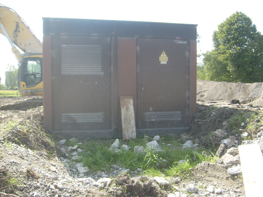 Auch das bis jetzt eingehauste Trafohaus, an dem ehemals die Nordostecke des T 750 mit seiner Nordwand grenzte, steht nun wieder frei. Darunter befindet sich der neuzeitliche Betonsockel des Hauses und darunter wiederum die historische T 750-Zerschellerplatte...