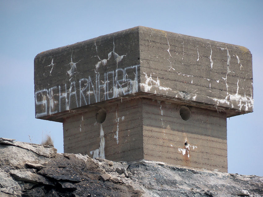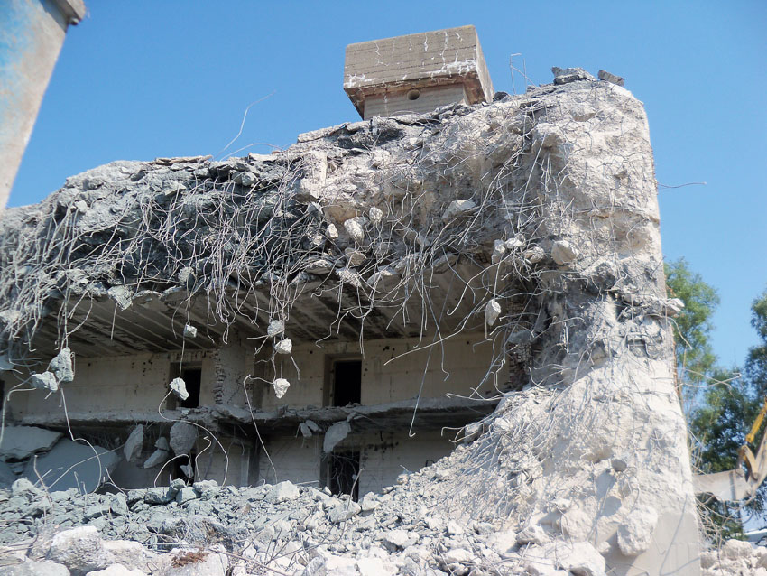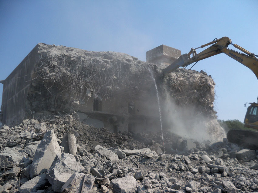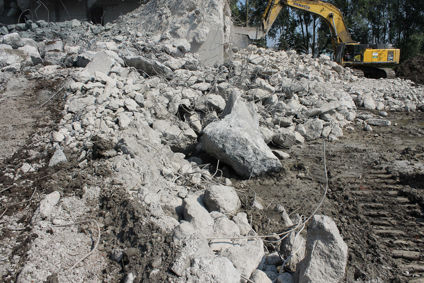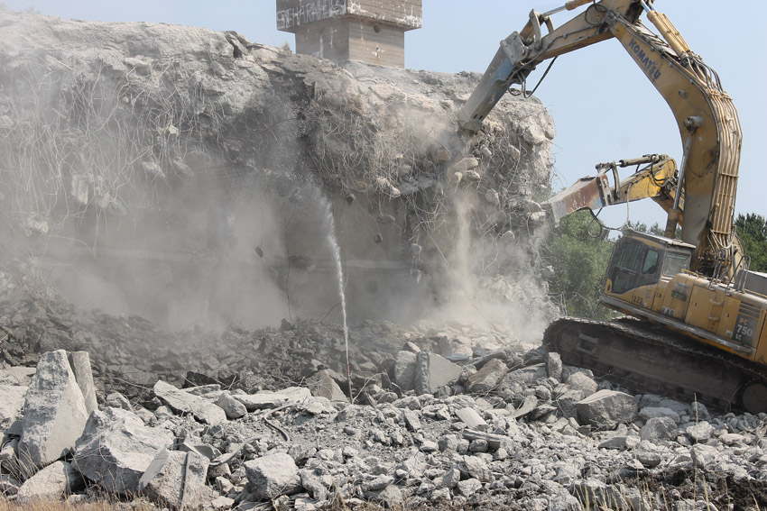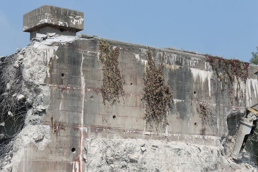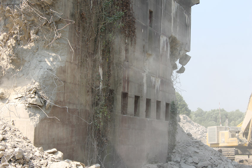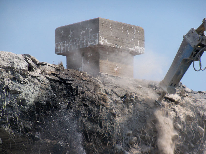 Abrisstag 23: Die Südwand des T 750 Ost wurde heute auch im Dachbereich bis direkt an den Lüftungsturm abgebrochen. Im Bereich der Nordwand ist die West- und Ostecke bereits arg zerstört. Im Bereich der Trümmerhalde, die einst T 750 West war, zerschreddert die kürzlich aufgestellte Brechmaschine nun konstant den Bunkerbeton...