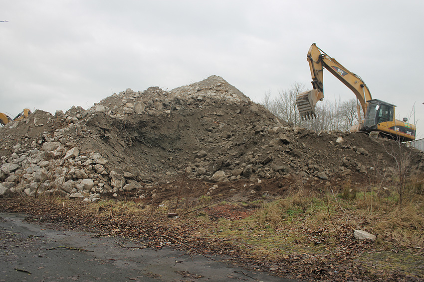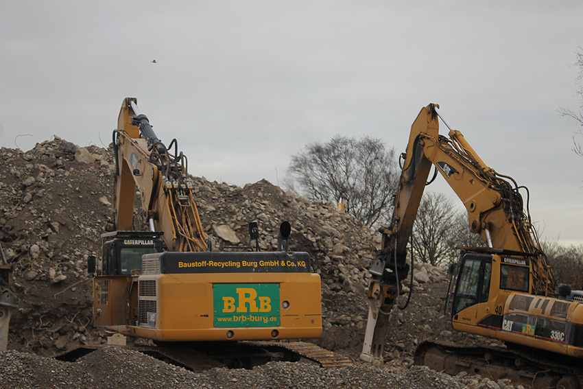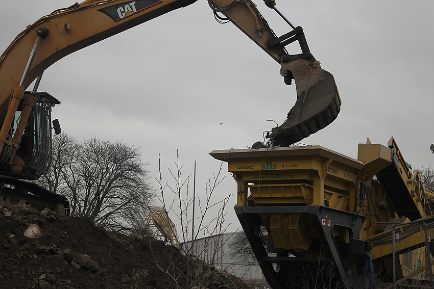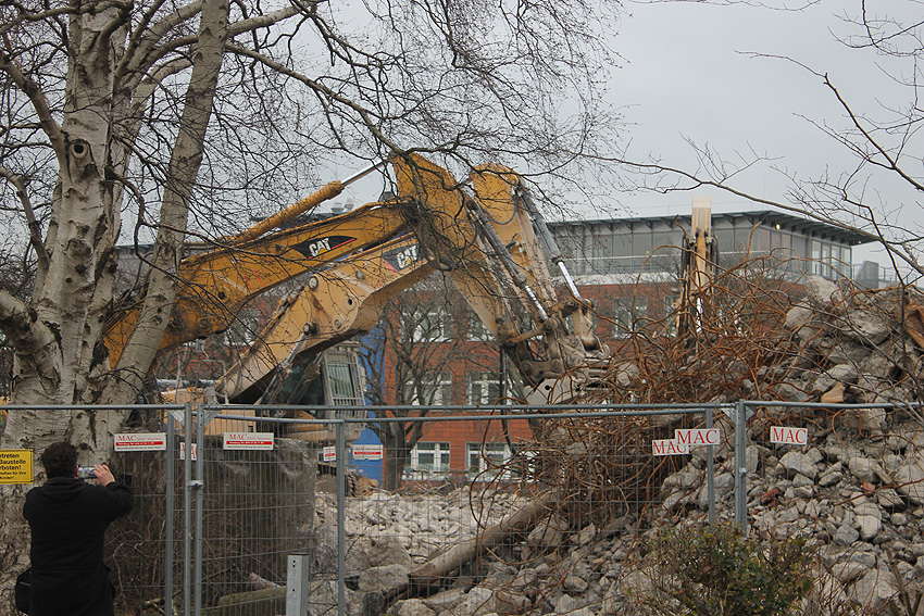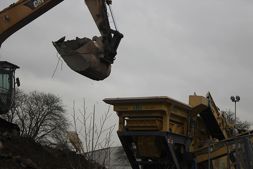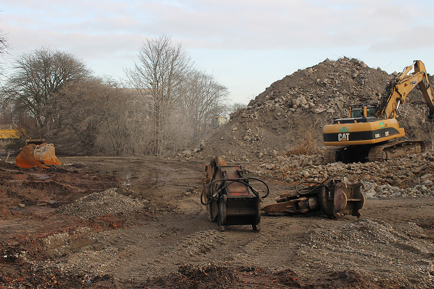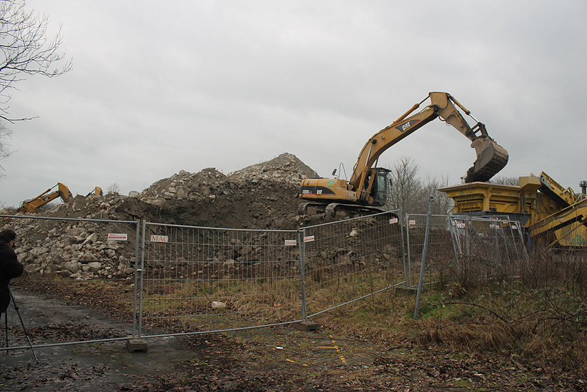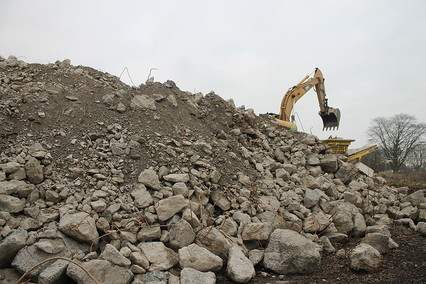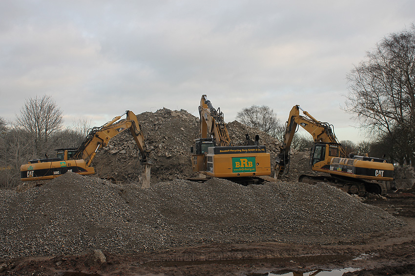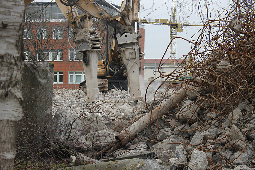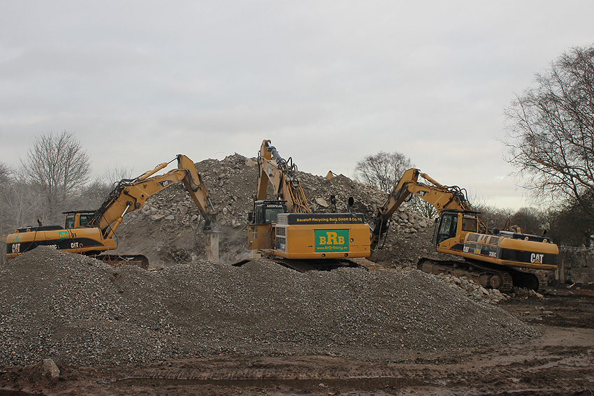 Heute war der erste Abrisstag im neuen Jahr. Gestern und vorgestern stand die Rückbaustelle wider Erwarten still. Heute wurde weiter auf die Fundamentplatte eingemeißelt, die nun auf Tiefe von etwa einem Meter ungefähr bis zur Hälfte zerkleinert ist. Die Zerschellerplatte ist weiterhin unangetastet. Zudem ist die Brechmaschine mittlerweile wieder in Funktion. Ab jetzt werden wir regulär einmal wöchentlich, immer mittwochs, die Dokumentation fortsetzen. Sollten zukünftig jedoch unerwartete, interessante Entwicklungen eintreten, sind wir natürlich zeitnah vor Ort und berichten.