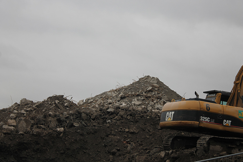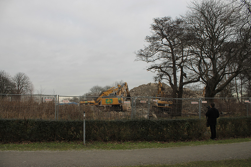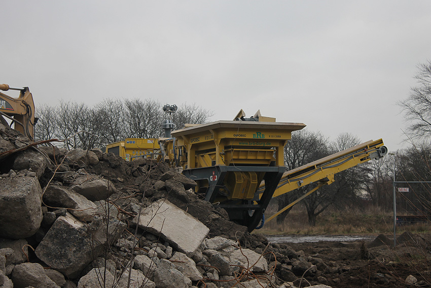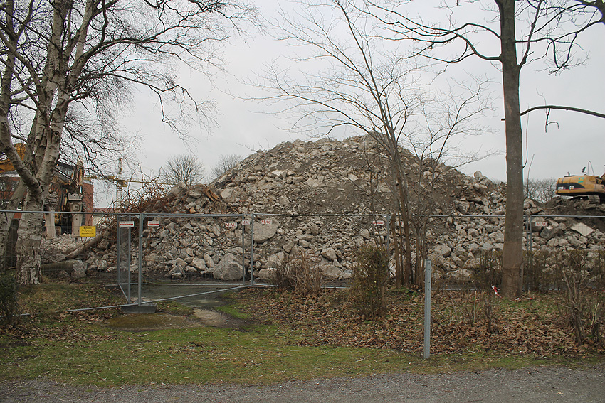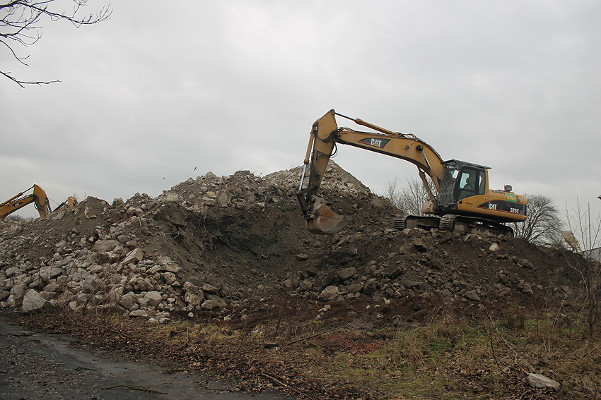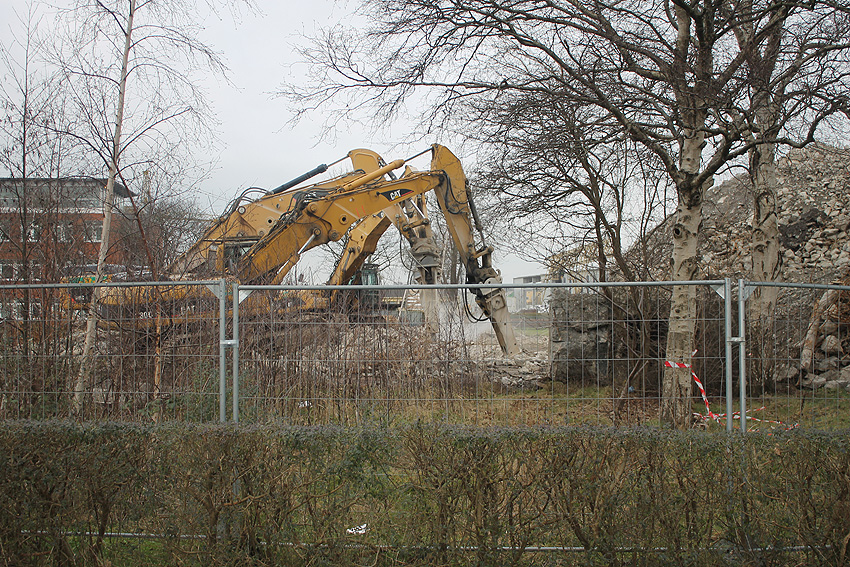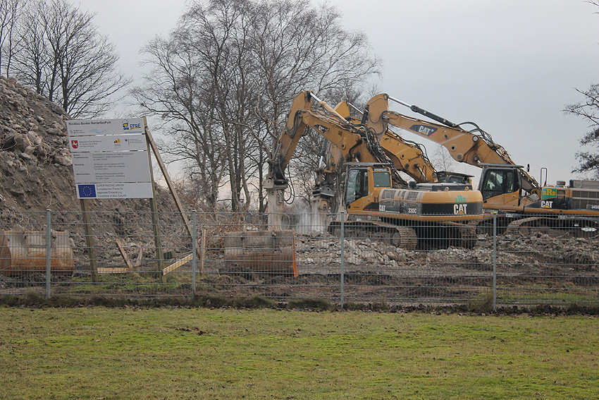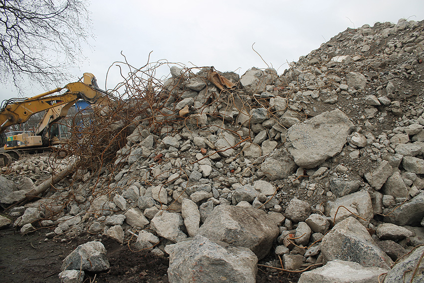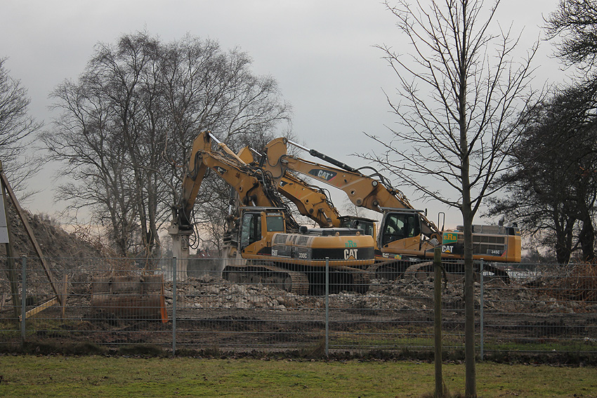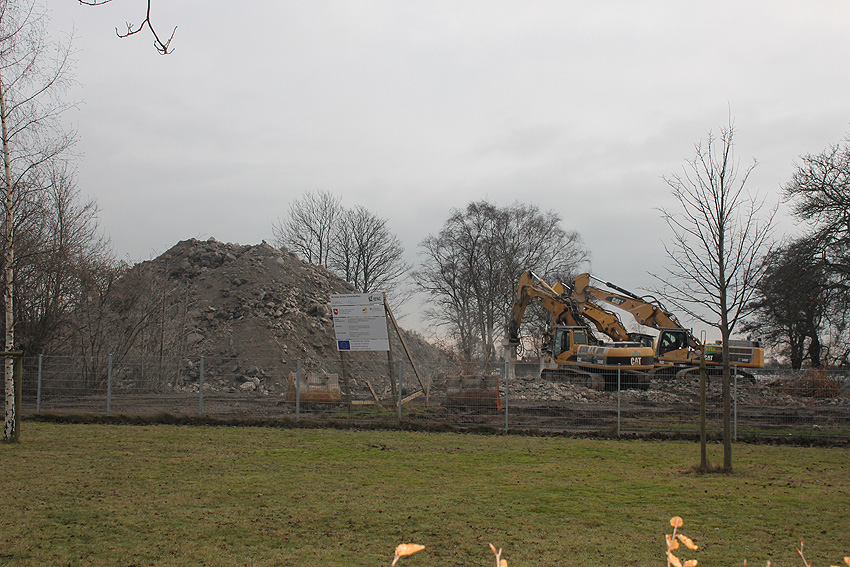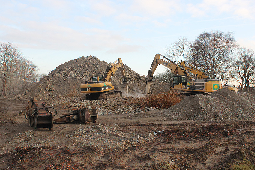 Heute war der erste Abrisstag im neuen Jahr. Gestern und vorgestern stand die Rückbaustelle wider Erwarten still. Heute wurde weiter auf die Fundamentplatte eingemeißelt, die nun auf Tiefe von etwa einem Meter ungefähr bis zur Hälfte zerkleinert ist. Die Zerschellerplatte ist weiterhin unangetastet. Zudem ist die Brechmaschine mittlerweile wieder in Funktion. Ab jetzt werden wir regulär einmal wöchentlich, immer mittwochs, die Dokumentation fortsetzen. Sollten zukünftig jedoch unerwartete, interessante Entwicklungen eintreten, sind wir natürlich zeitnah vor Ort und berichten.