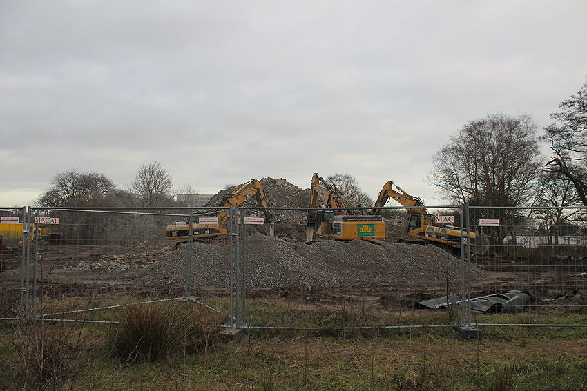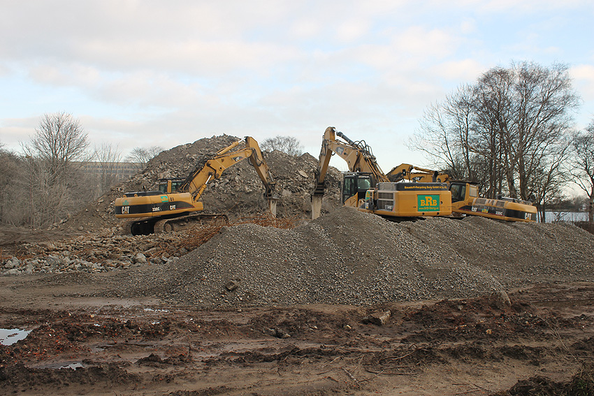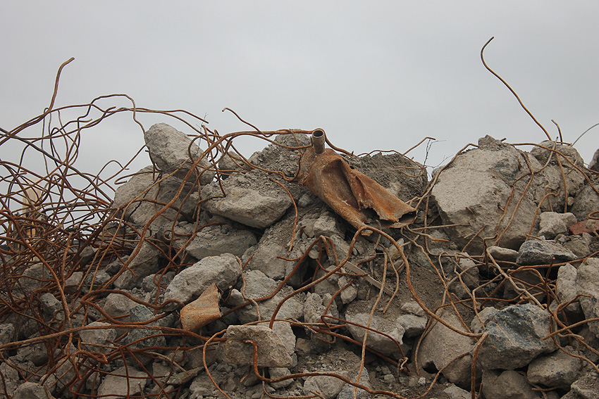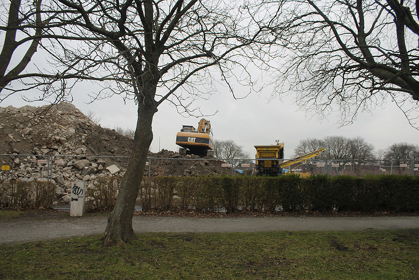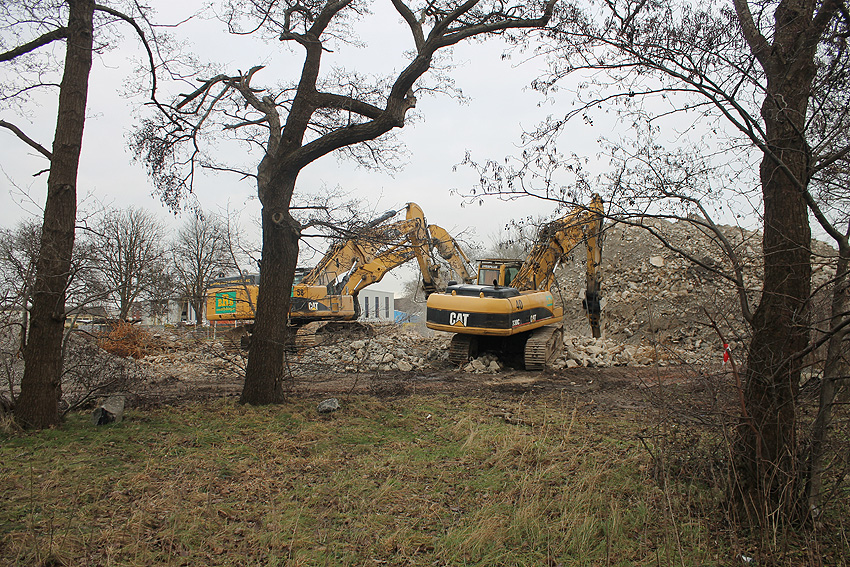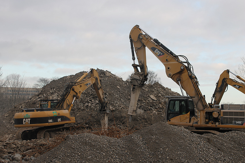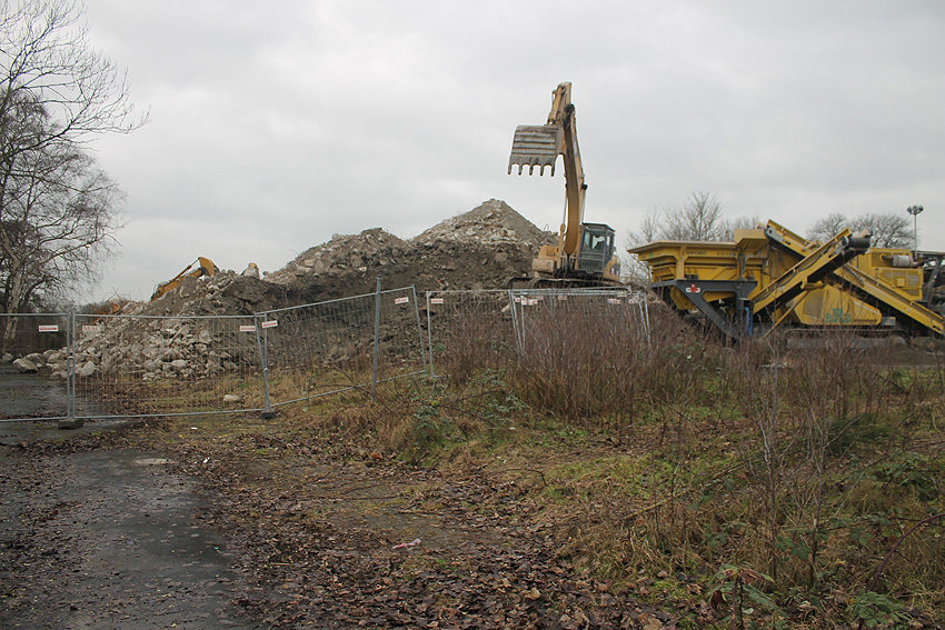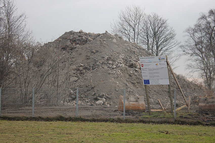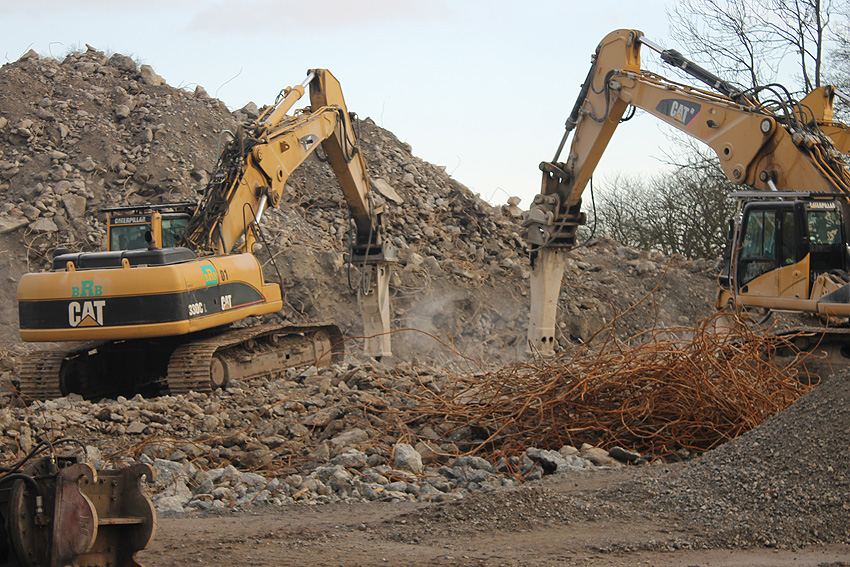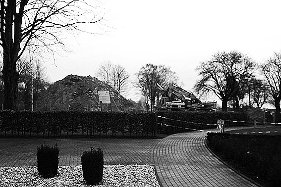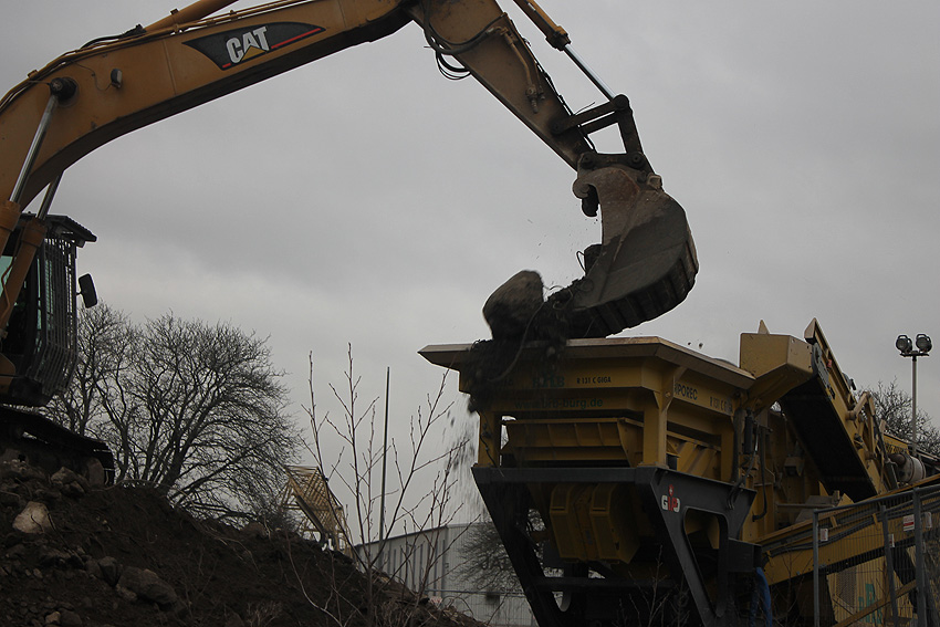 Heute war der erste Abrisstag im neuen Jahr. Gestern und vorgestern stand die Rückbaustelle wider Erwarten still. Heute wurde weiter auf die Fundamentplatte eingemeißelt, die nun auf Tiefe von etwa einem Meter ungefähr bis zur Hälfte zerkleinert ist. Die Zerschellerplatte ist weiterhin unangetastet. Zudem ist die Brechmaschine mittlerweile wieder in Funktion. Ab jetzt werden wir regulär einmal wöchentlich, immer mittwochs, die Dokumentation fortsetzen. Sollten zukünftig jedoch unerwartete, interessante Entwicklungen eintreten, sind wir natürlich zeitnah vor Ort und berichten.