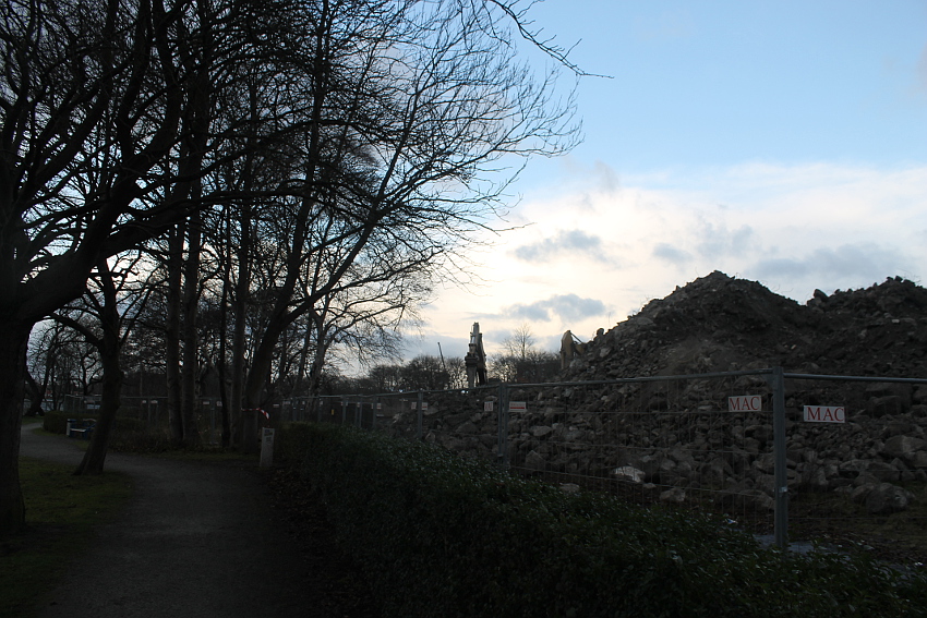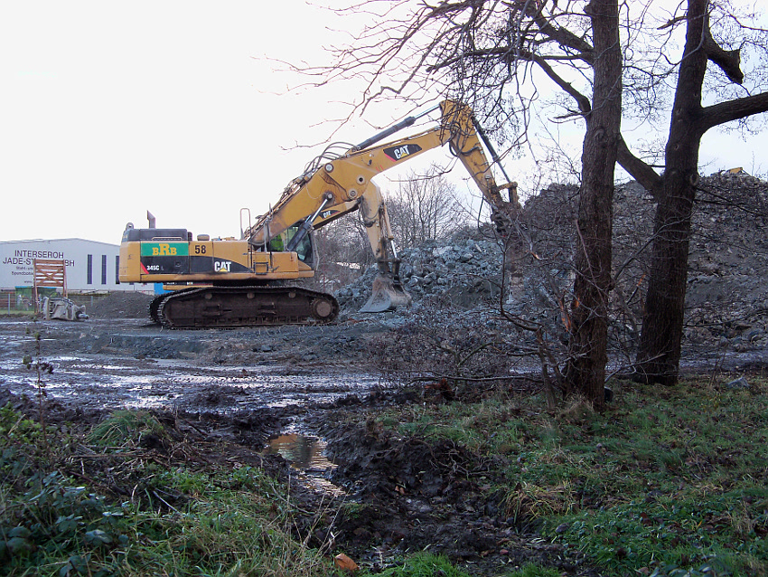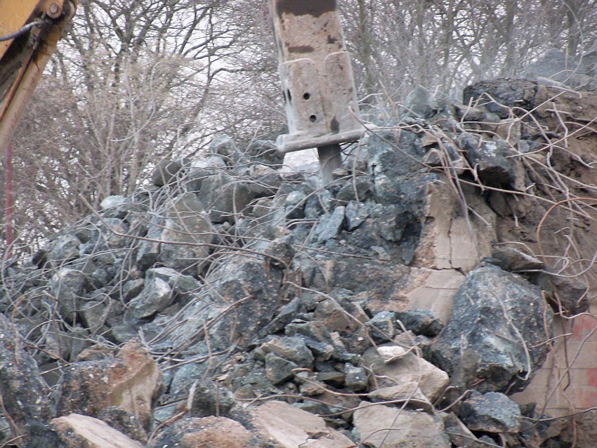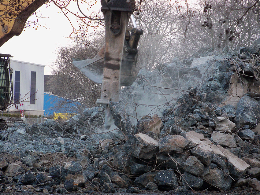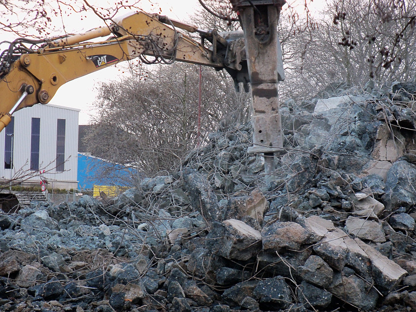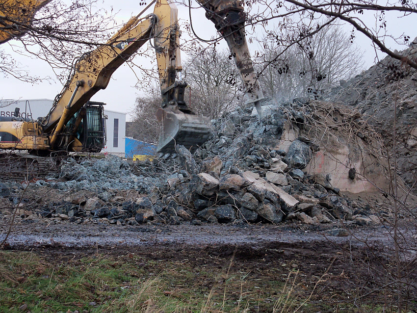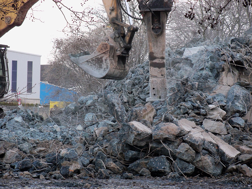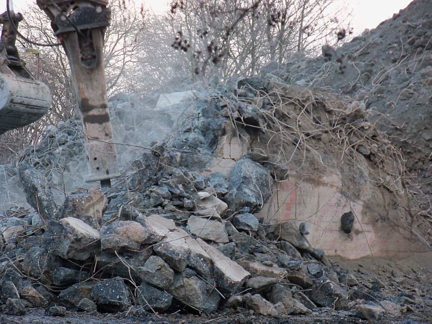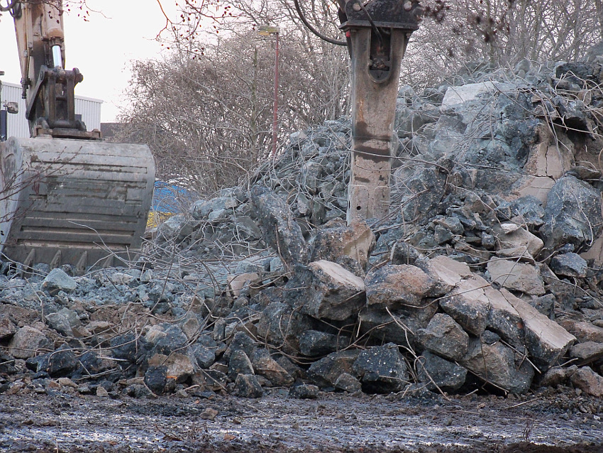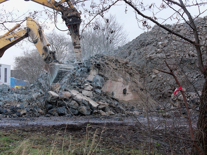 Das Ende des oberirdischen Rest-T 750 steht nun bevor. Mit geballter Kraft wurde am heutigen Tage gegen die noch verbliebenen Reste im Südbereich eingemeißelt. Bei beißendem Ostwind haben wir es heute allerdings nicht allzu lange am Banter See ertragen können.