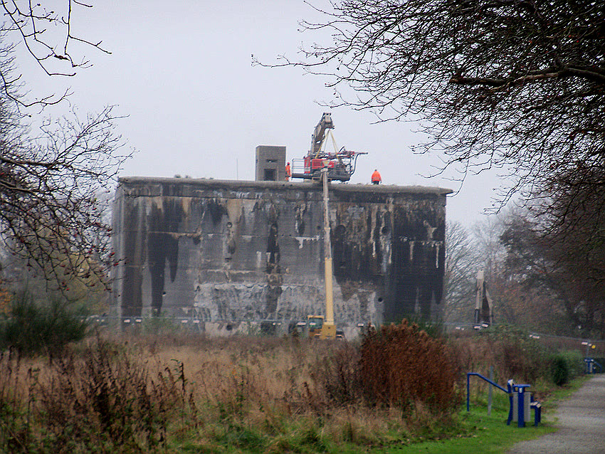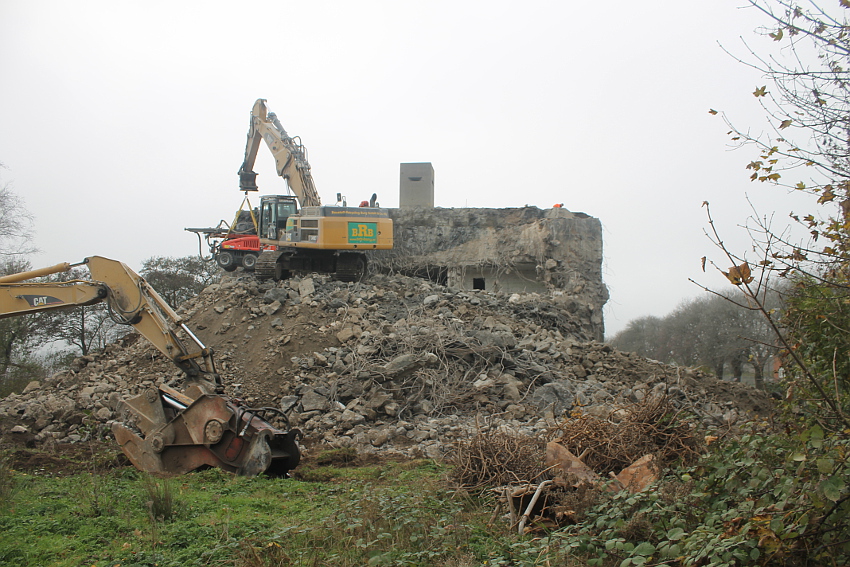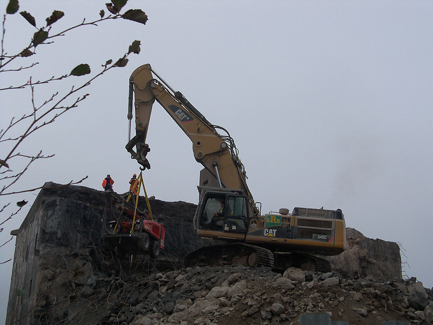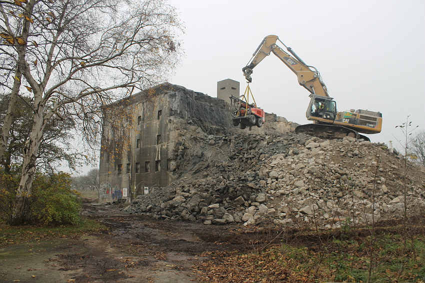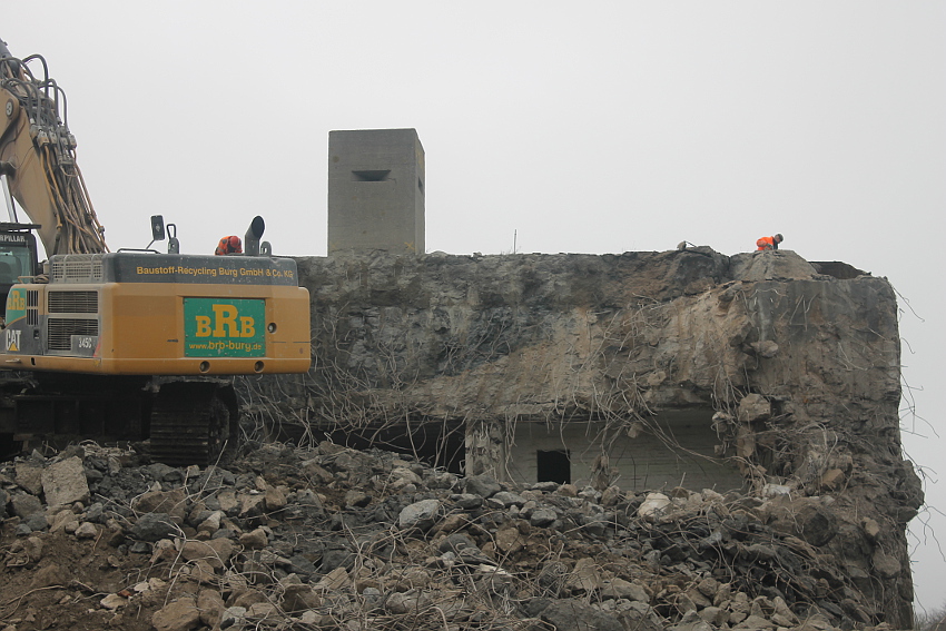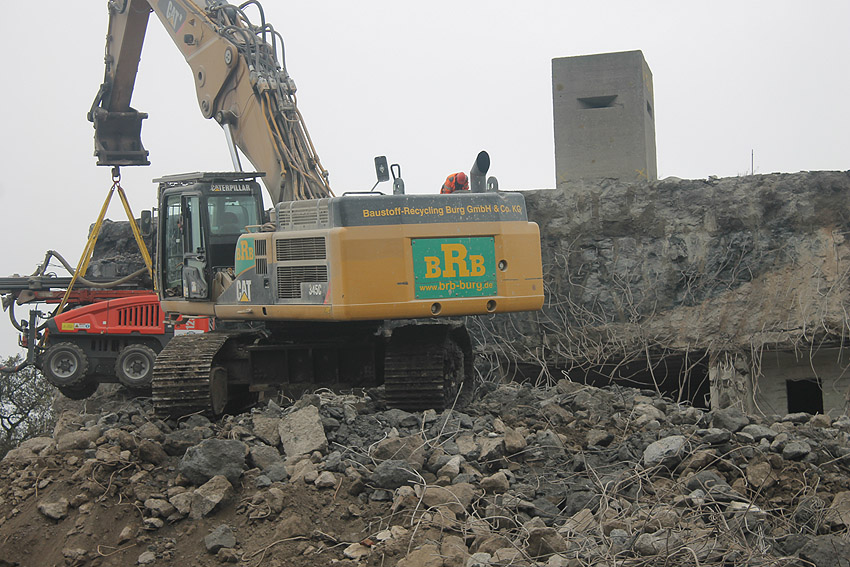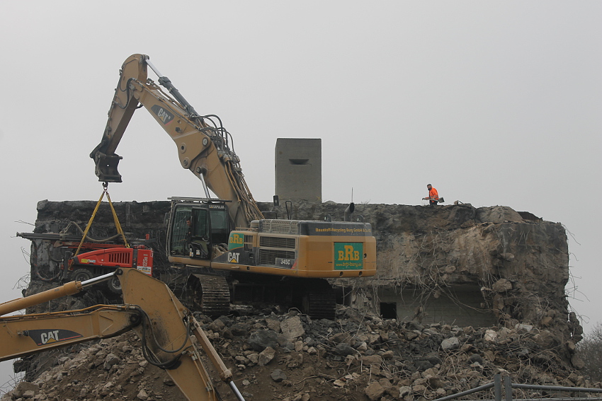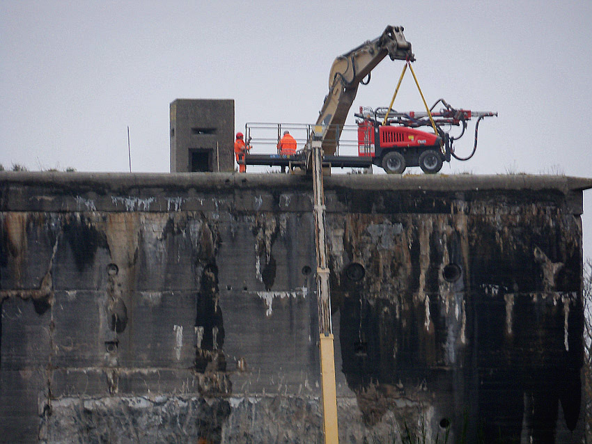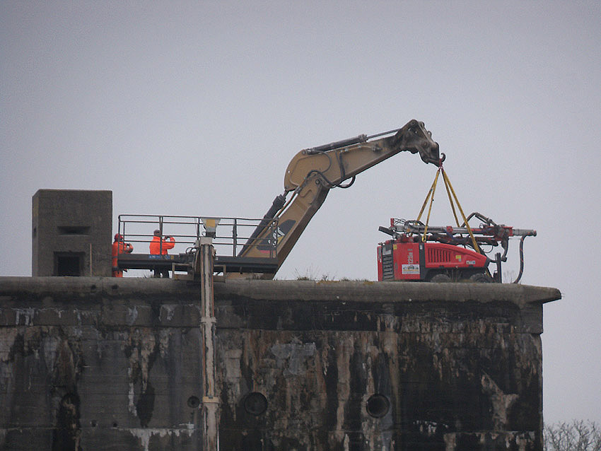Am heutigen Tage wurden die Bohrungen abgeschlossen. Ungefähr 100 Bohrungen mit Tiefe bis zu 2,50 Metern wurden gesetzt. Am Nachmittag wurde das Bohrgerät, welches mit einem Kran Anfang der Woche aufs Dach gehoben wurde, mit einem der Bagger wieder heruntergelassen. Weitere Teile des Ostbereiches vom Dach wurden gestern und heute abgebrochen. Dort ist nun aber erst einmal Schicht, da die Bohrlöcher nun bis an die Abrisslinie reichen. Die Lockerungssprengung soll laut Auskunft eines Mitarbeiters am nächsten Dienstag erfolgen. Dann wird auch erkennbar sein, wie der Beobachtungsstand auf die Detonation, die fast nicht zu hören sein soll, reagieren wird. Schutzmatten sollen vorher zur Dämmung auf das Dach gelegt werden. Ob die Sprengung an einem Stück erfolgt oder in Etappen, bleibt abzuwarten. Logischer wäre aber eine einzige Gesamt-Lockerungssprengung des Daches. Äußerlich erkennbar werden wohl diverse kleine Risse im Oberbereich des Bunkers im Anschluss darauf sein. Wir sind gespannt.