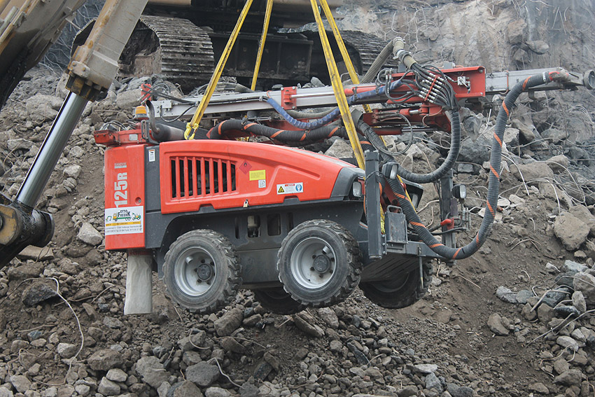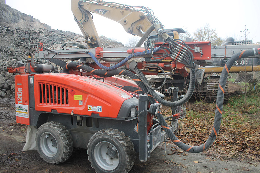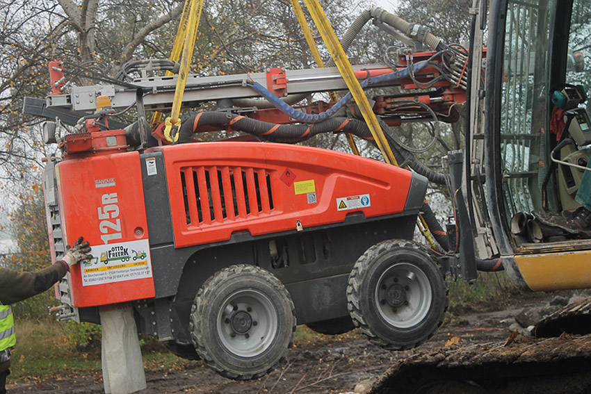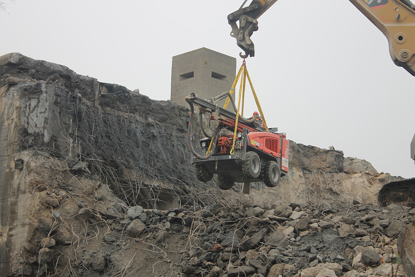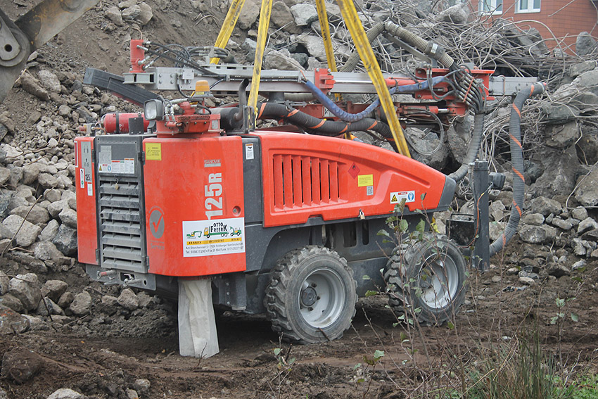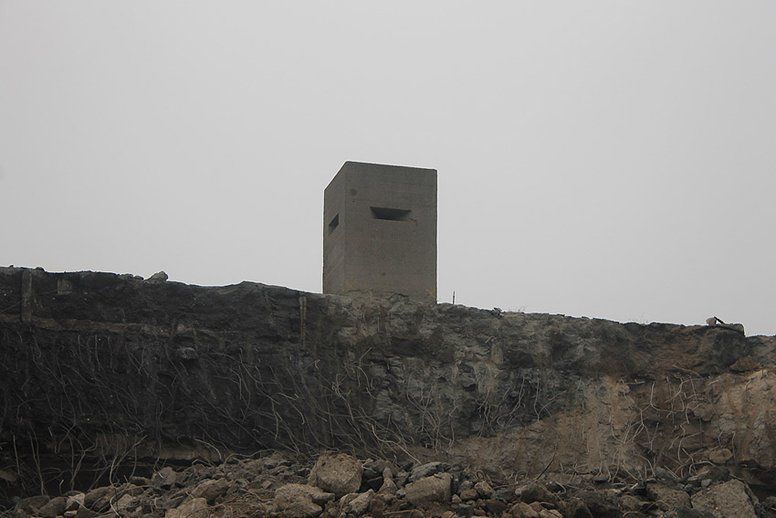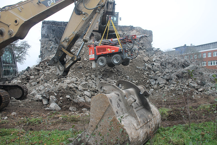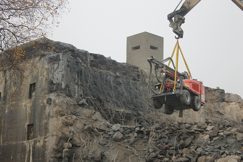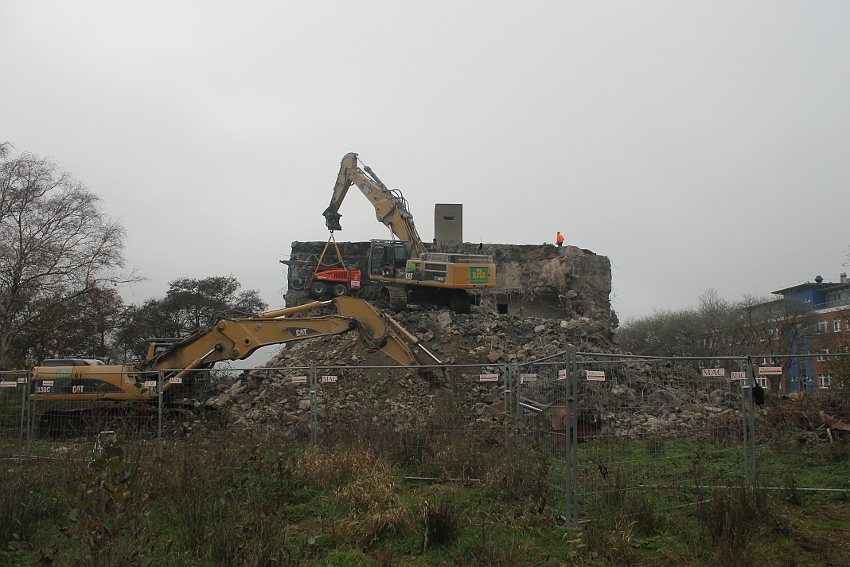 Am heutigen Tage wurden die Bohrungen abgeschlossen. Ungefähr 100 Bohrungen mit Tiefe bis zu 2,50 Metern wurden gesetzt. Am Nachmittag wurde das Bohrgerät, welches mit einem Kran Anfang der Woche aufs Dach gehoben wurde, mit einem der Bagger wieder heruntergelassen. Weitere Teile des Ostbereiches vom Dach wurden gestern und heute abgebrochen. Dort ist nun aber erst einmal Schicht, da die Bohrlöcher nun bis an die Abrisslinie reichen. Die Lockerungssprengung soll laut Auskunft eines Mitarbeiters am nächsten Dienstag erfolgen. Dann wird auch erkennbar sein, wie der Beobachtungsstand auf die Detonation, die fast nicht zu hören sein soll, reagieren wird. Schutzmatten sollen vorher zur Dämmung auf das Dach gelegt werden. Ob die Sprengung an einem Stück erfolgt oder in Etappen, bleibt abzuwarten. Logischer wäre aber eine einzige Gesamt-Lockerungssprengung des Daches. Äußerlich erkennbar werden wohl diverse kleine Risse im Oberbereich des Bunkers im Anschluss darauf sein. Wir sind gespannt.