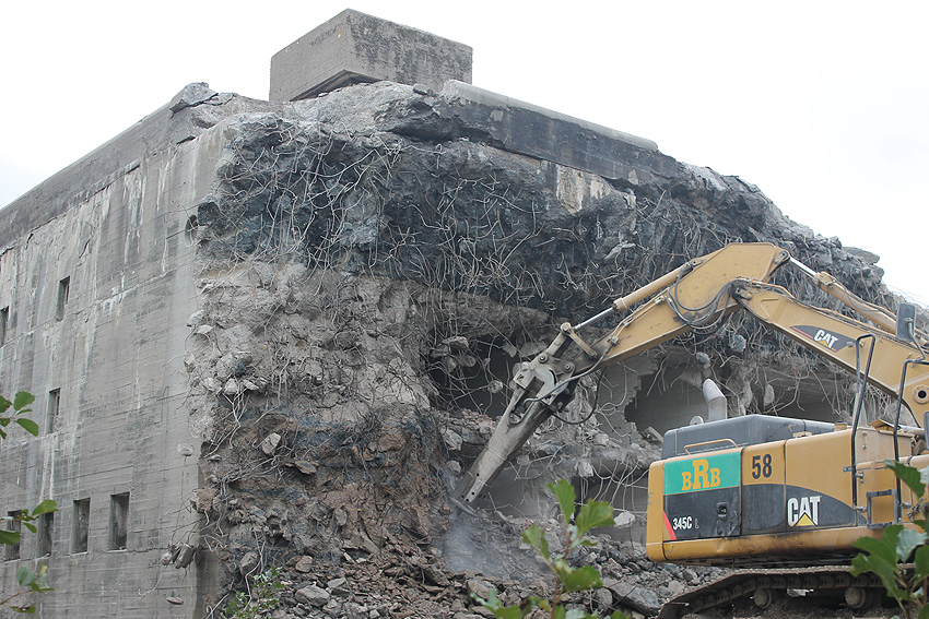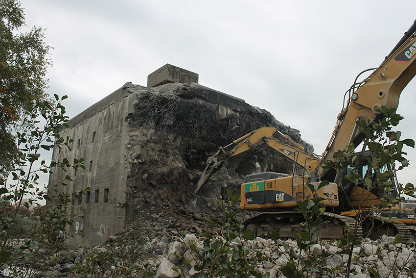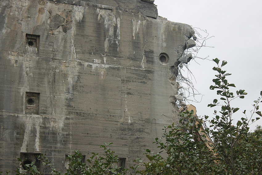 Der Abriss an der Ostwand wurde heute fortgesetzt. Zusammen mit den Bereichen dahinter, die bereits abgetragen wurden und abzüglich des teilweise noch vorhandenen Erdgeschossbereiches der Ostwand kann man feststellen, dass nun etwa ein Siebtel des (oberirdischen) Bunkerbereiches abgebrochen worden ist. Mannschaftsraum Südost OG 2 trat heute ans Tageslicht.