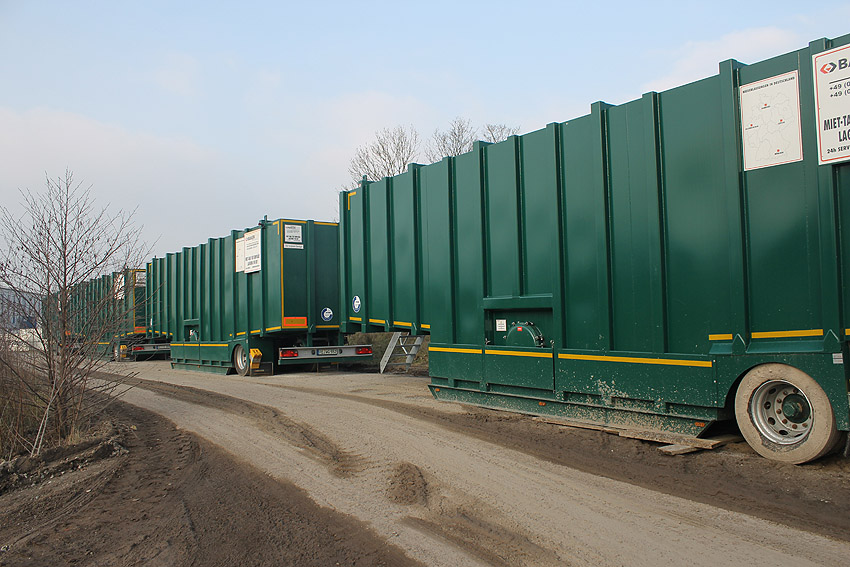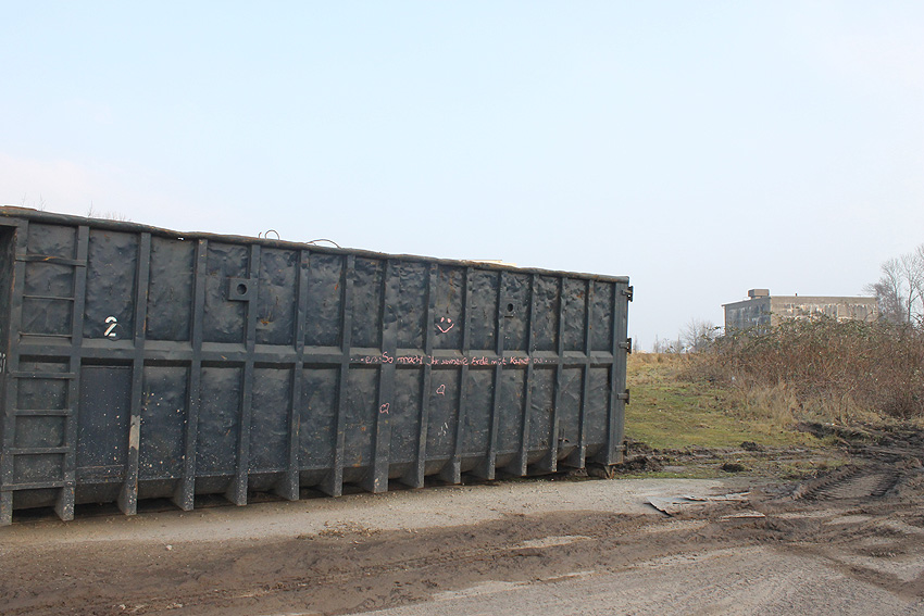 Diese Container stammen vom Großbrand bei der Verwertungsfirma gegenüber vor einigen Tagen. Im Inneren befindet sich temporär gelagertes Löschwasser.