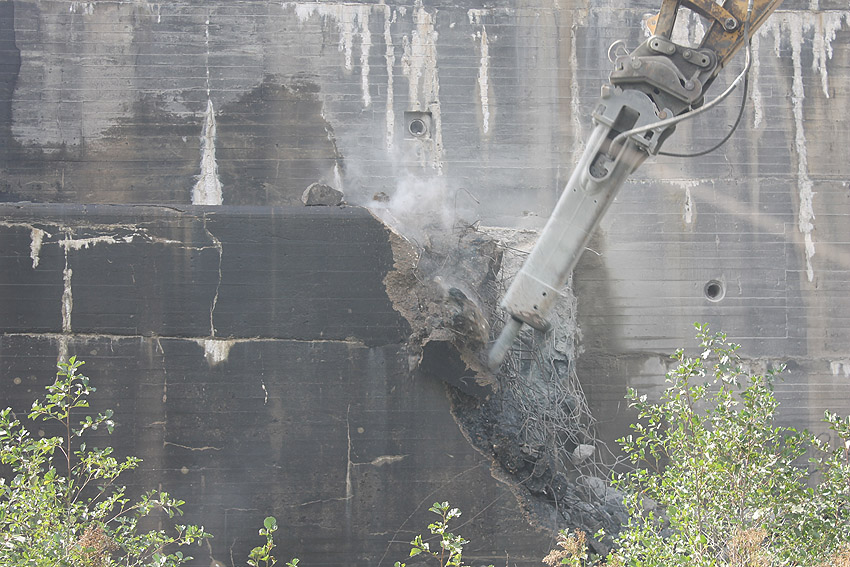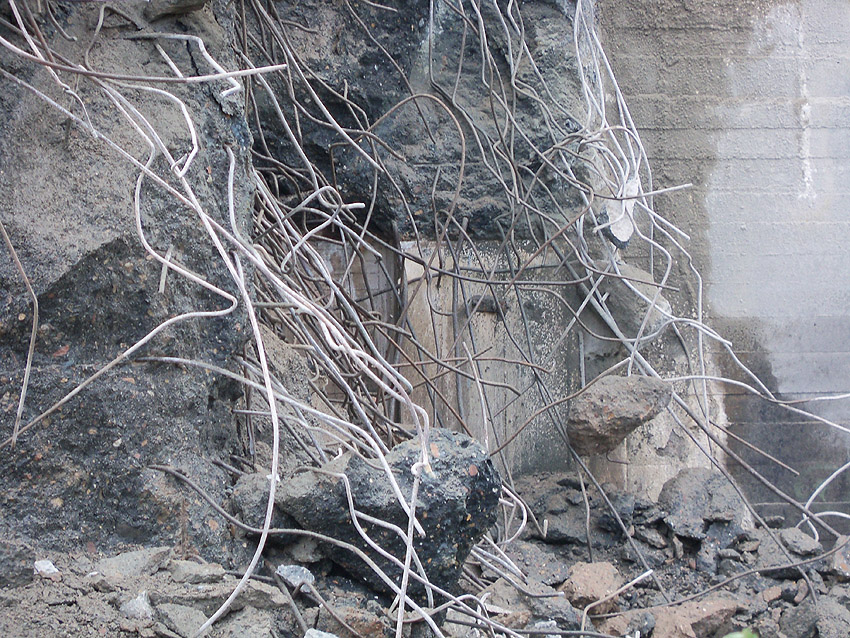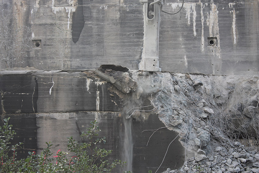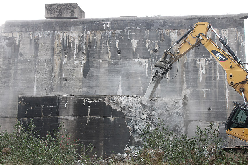 Heute wurde der Abriss fortgesetzt! Wider Erwarten nicht an der Südseite, sondern an der Nordkante des Ostsplitterschutzvorbaues. Bis zum späten Nachmittag hatte sich der Bagger bis fast zur Hälfte des Vorbaues fortgefressen. Anscheinend soll nun von der Ostseite aus der Bunker abgebrochen werden, da die Schuttrampe wohl doch zu lang sein würde, als dass sie an der Südseite entstehen könnte (Uferweg / Banter See)...