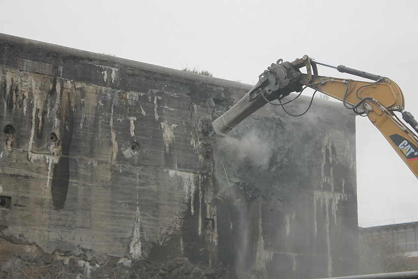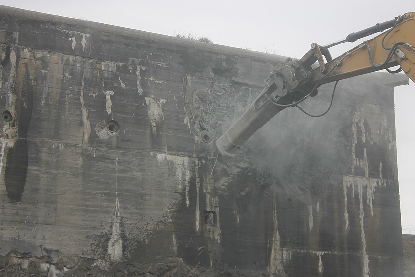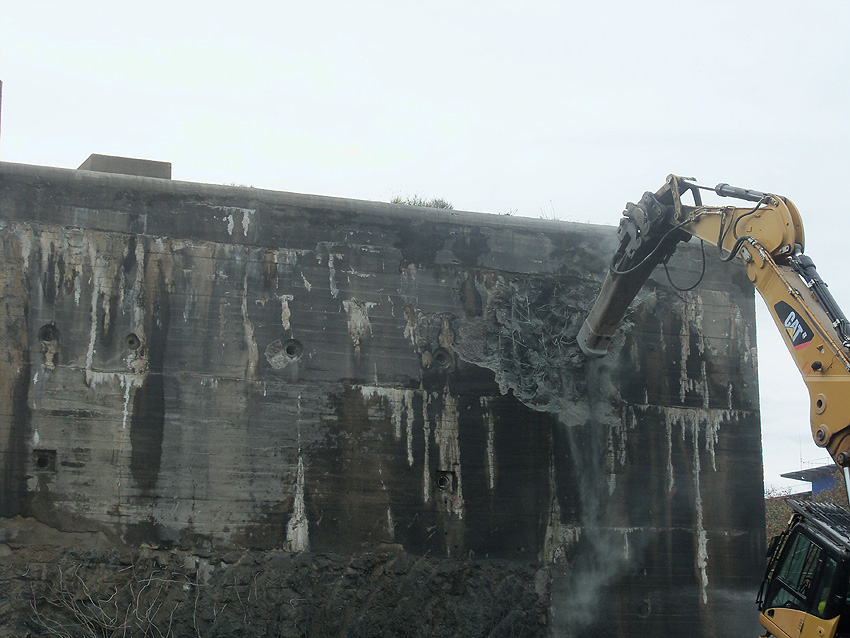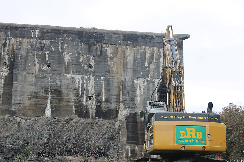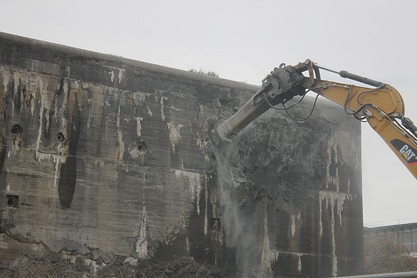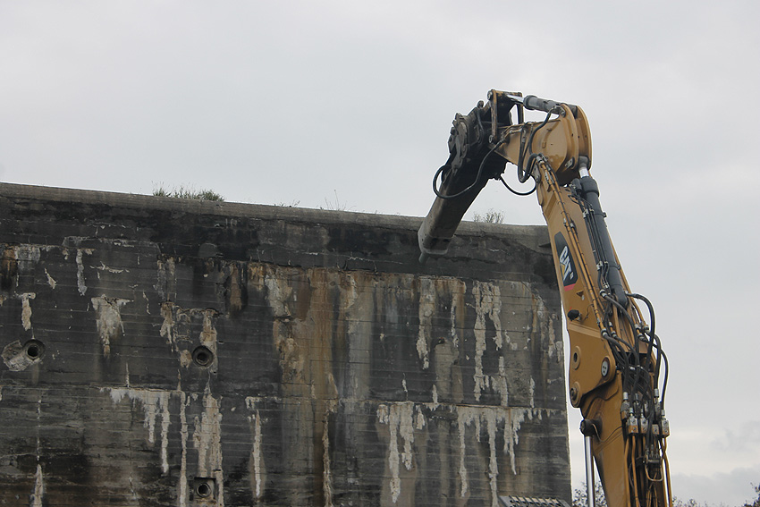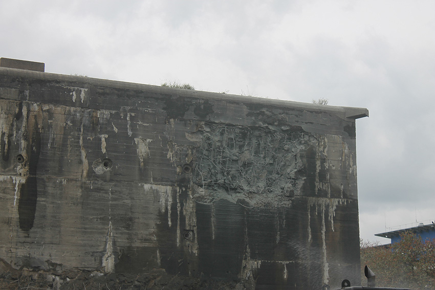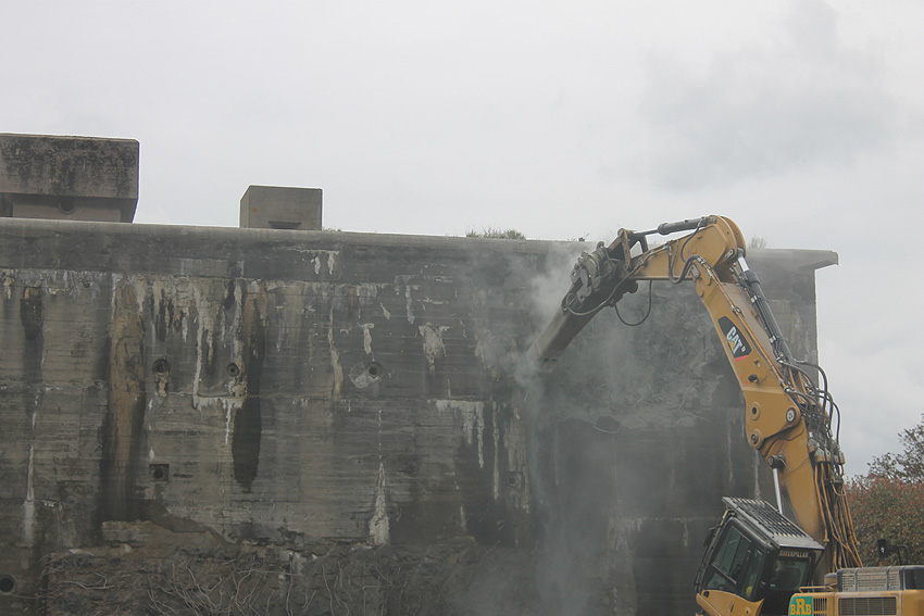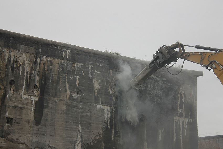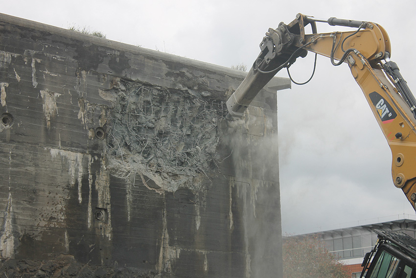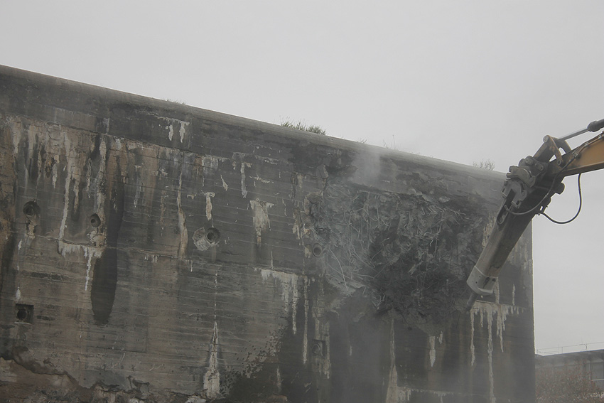 Der Splitterschutzvorbau Ost ist Vergangenheit. Gegen 16 Uhr wurde dann begonnen, an der Ostwand im Deckenbereich die Abbrucharbeiten fortzusetzen. Langsam verliert die Ostwand des Bunkers seine Struktur.