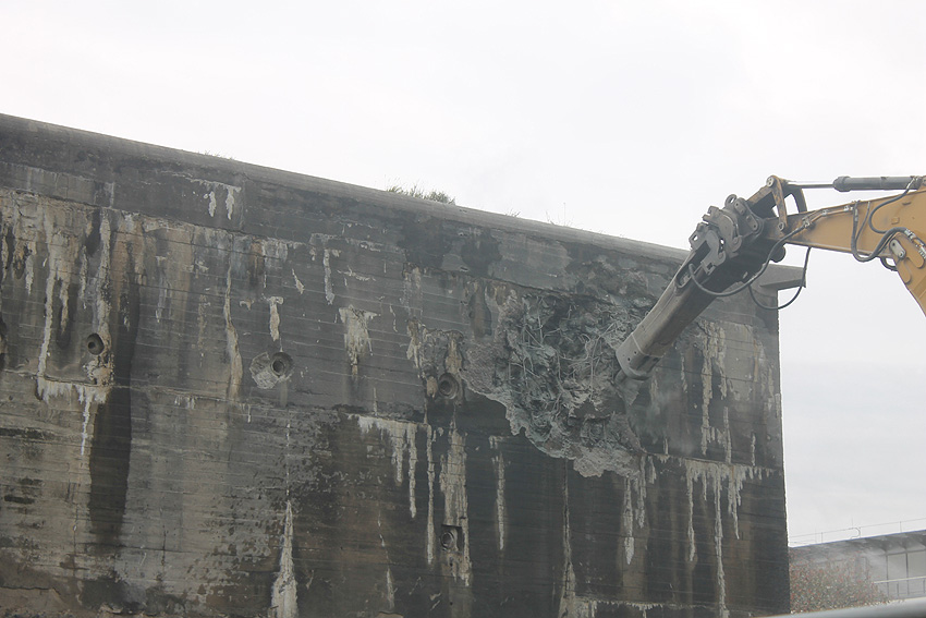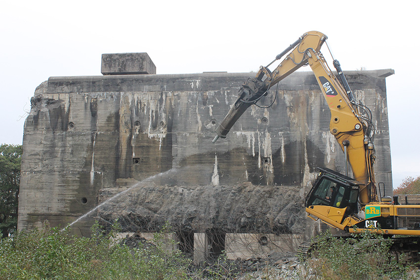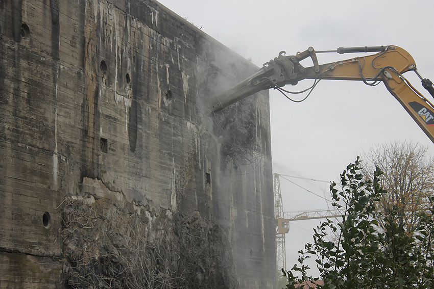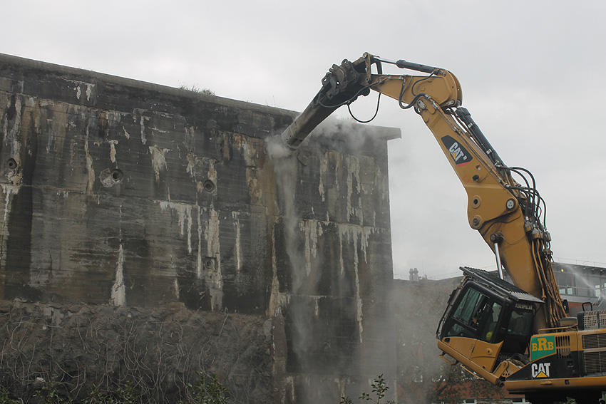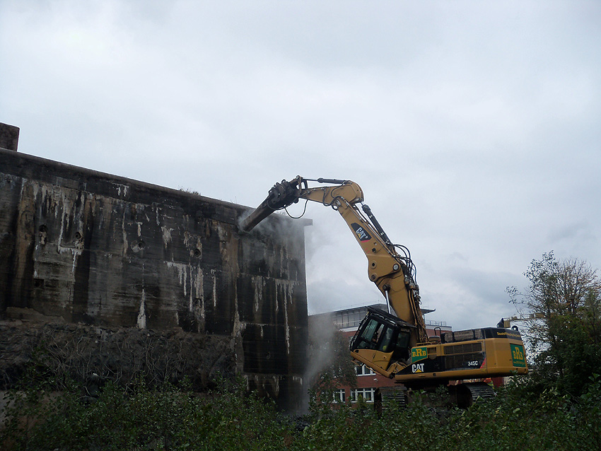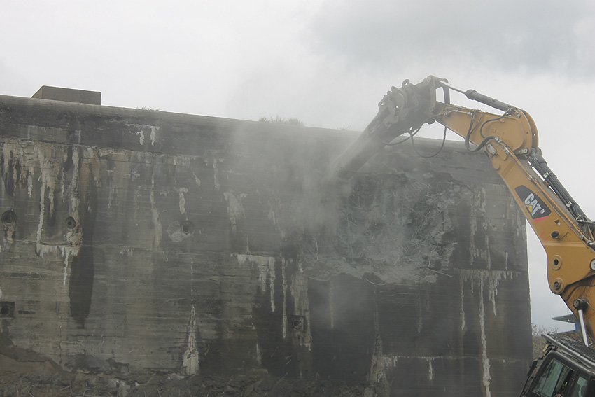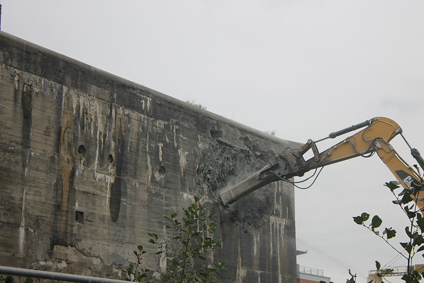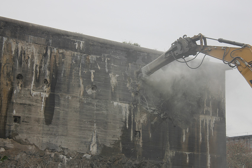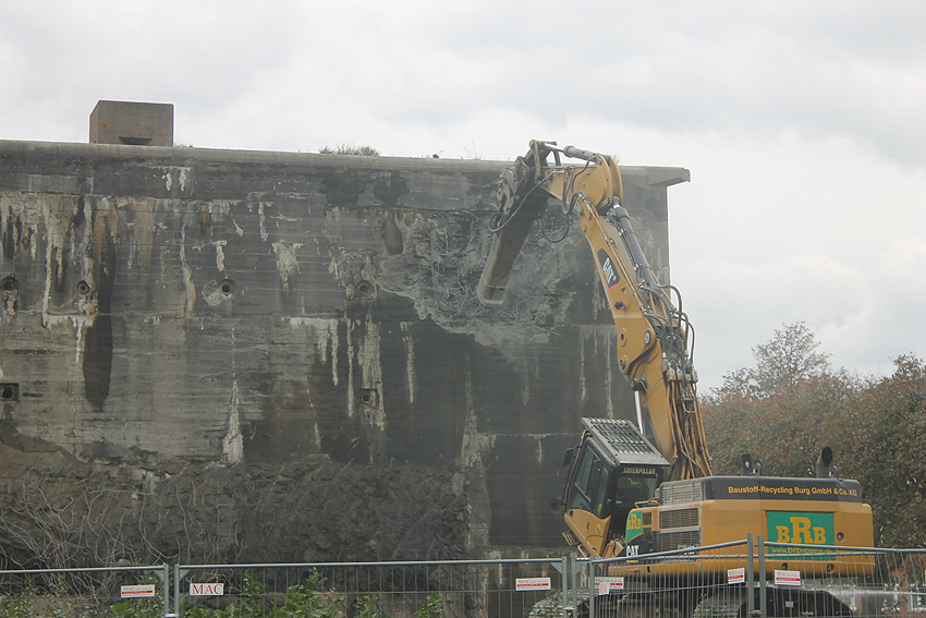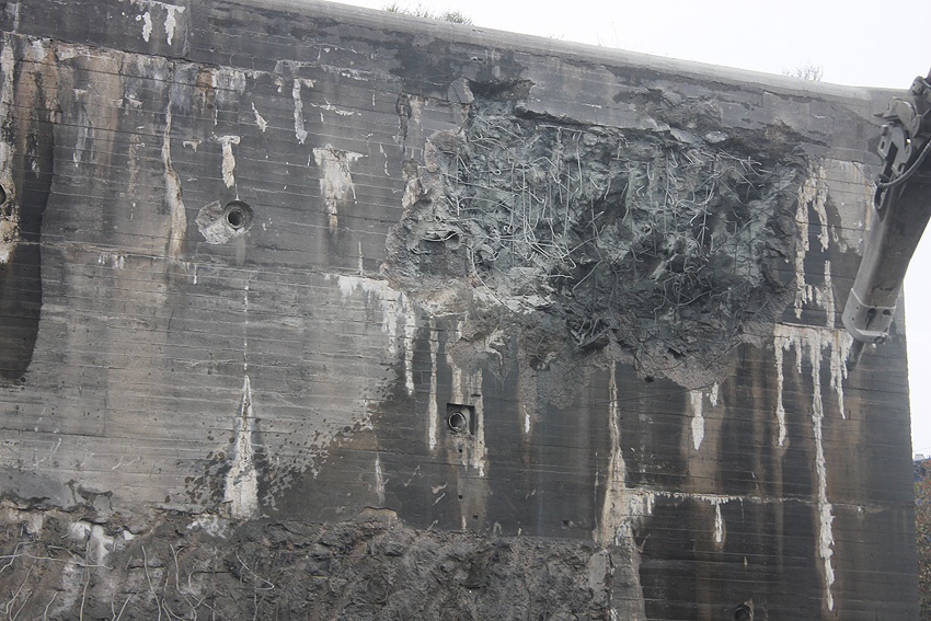 Der Splitterschutzvorbau Ost ist Vergangenheit. Gegen 16 Uhr wurde dann begonnen, an der Ostwand im Deckenbereich die Abbrucharbeiten fortzusetzen. Langsam verliert die Ostwand des Bunkers seine Struktur.
