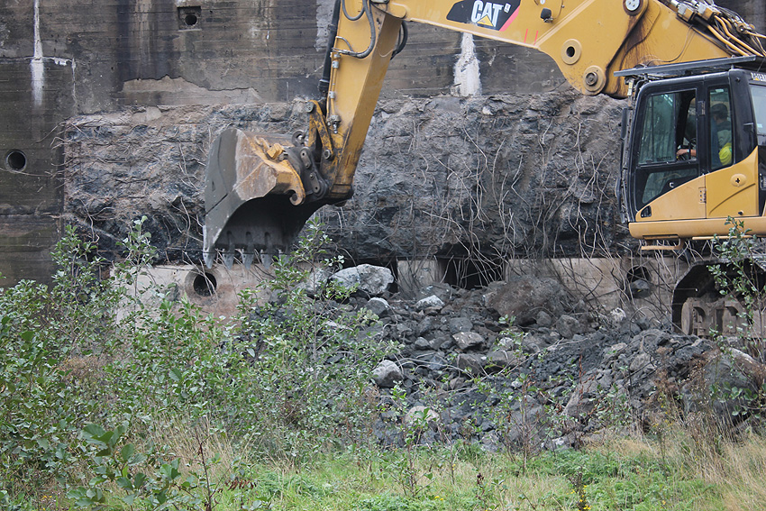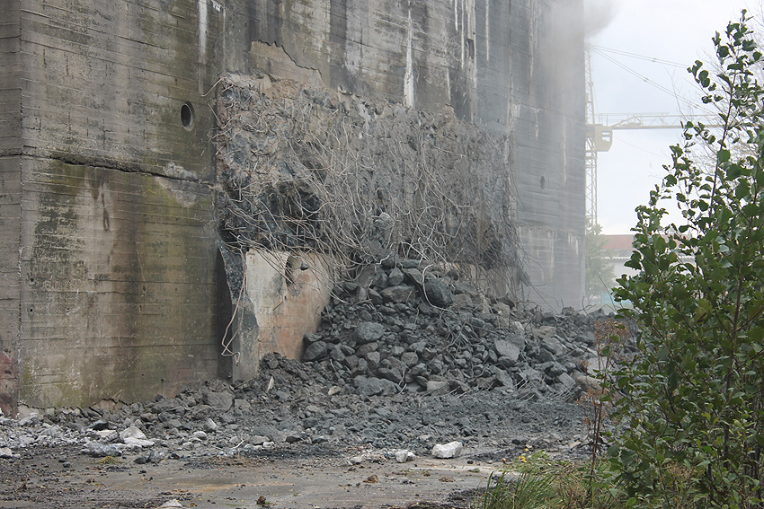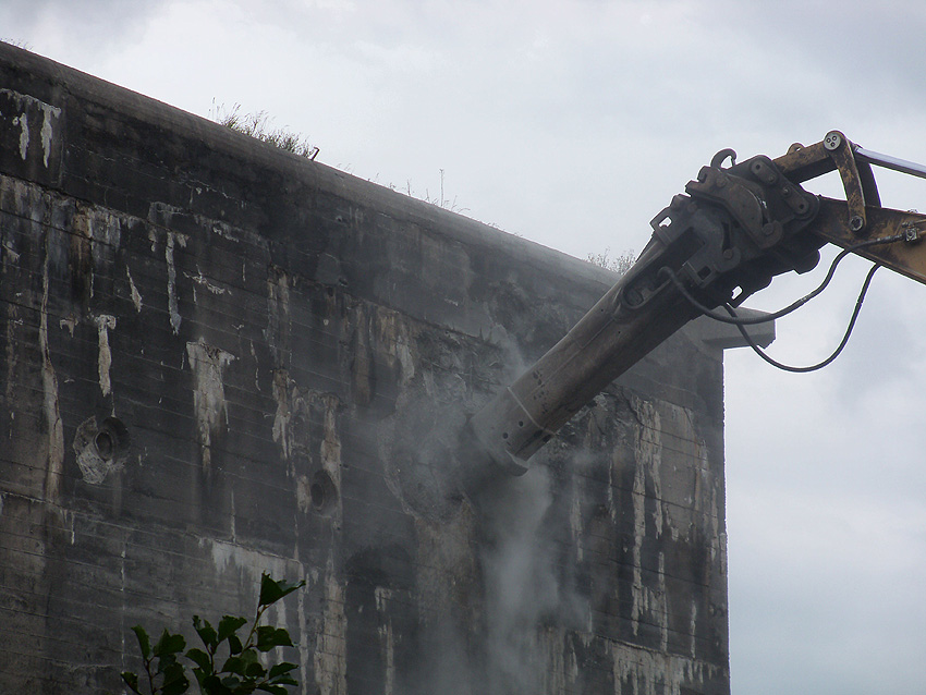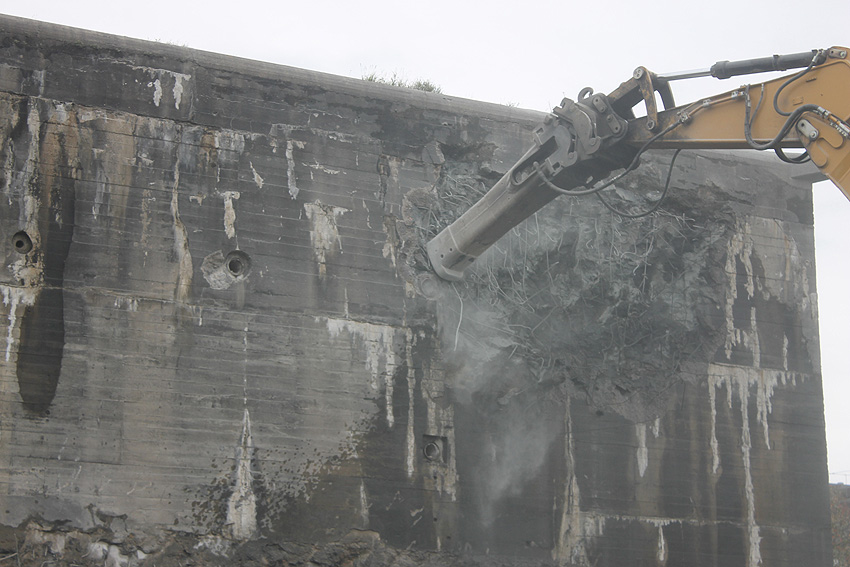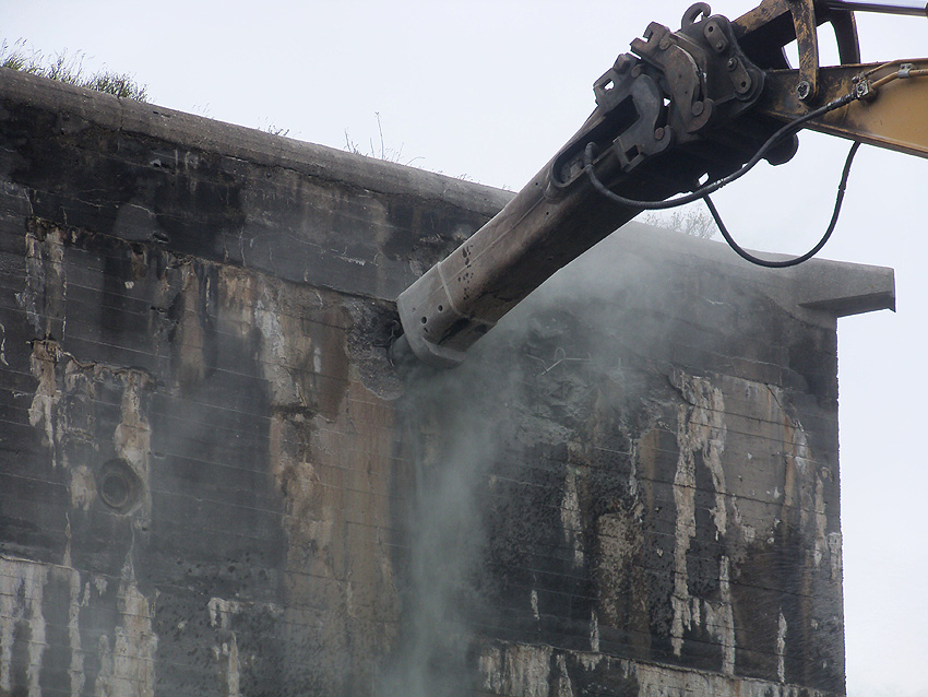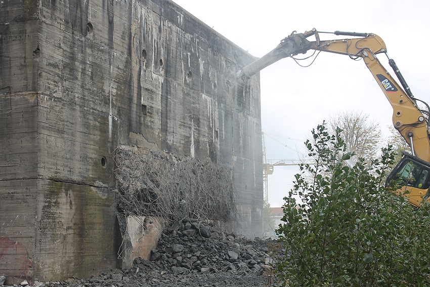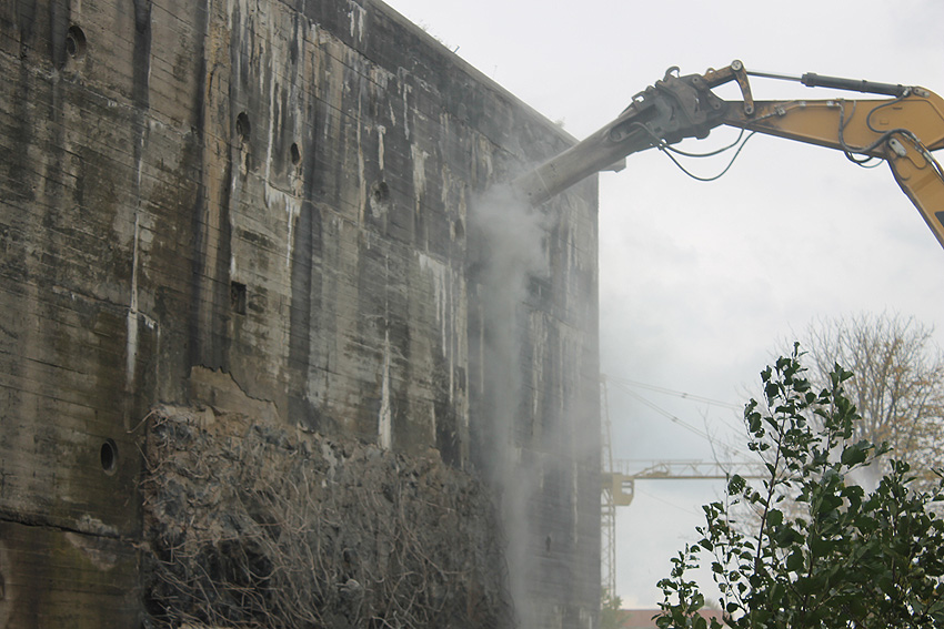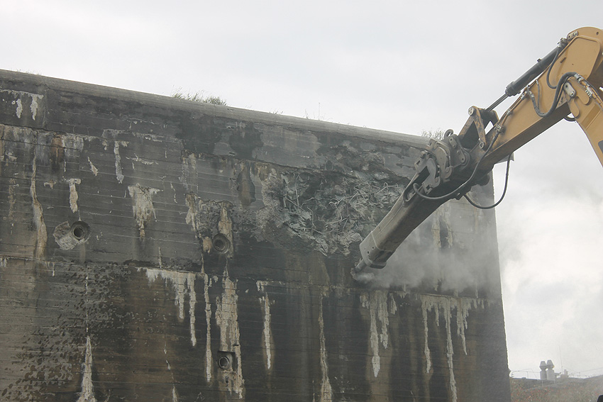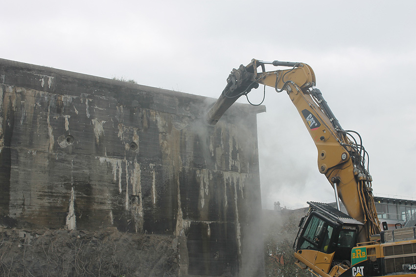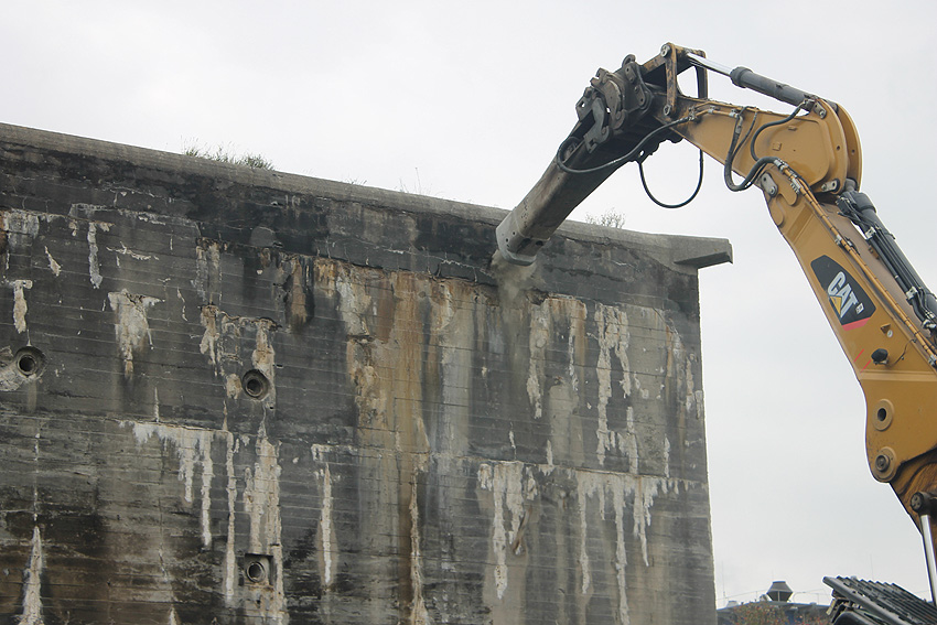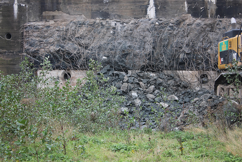 Der Splitterschutzvorbau Ost ist Vergangenheit. Gegen 16 Uhr wurde dann begonnen, an der Ostwand im Deckenbereich die Abbrucharbeiten fortzusetzen. Langsam verliert die Ostwand des Bunkers seine Struktur.