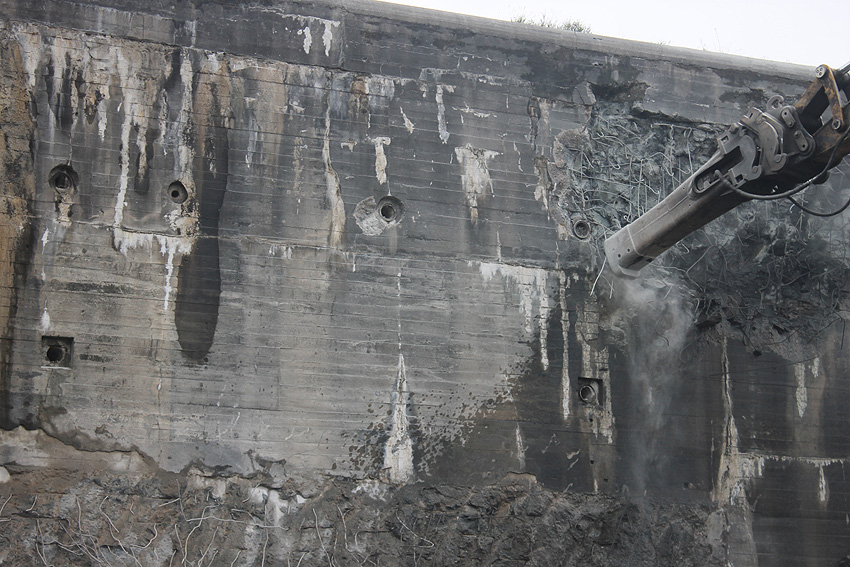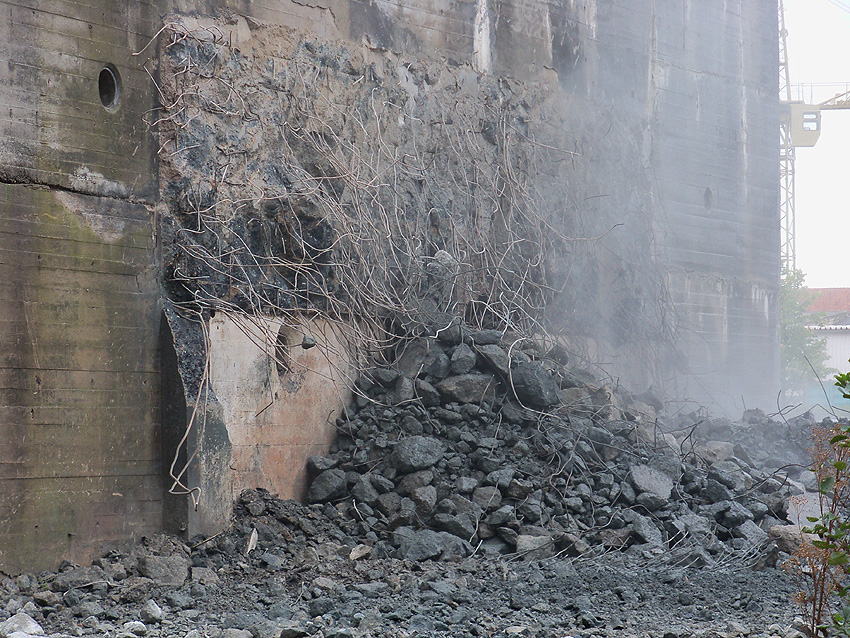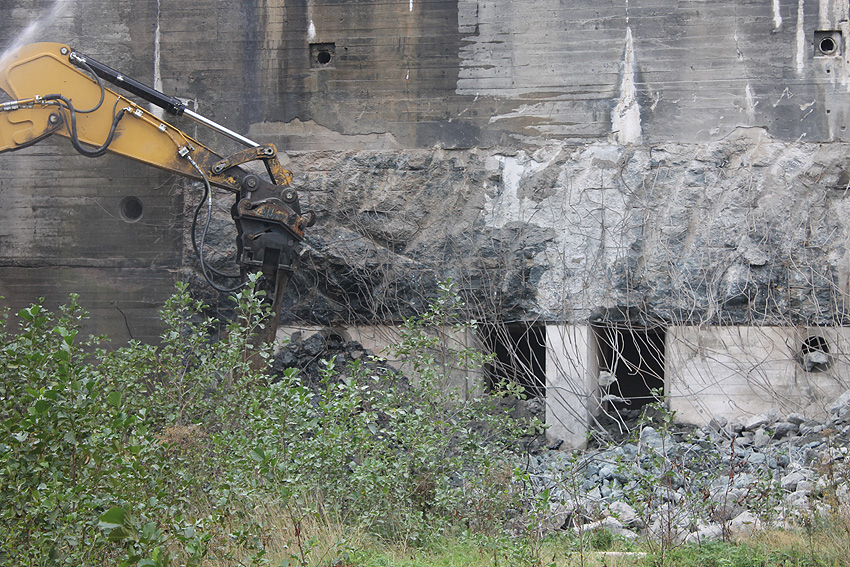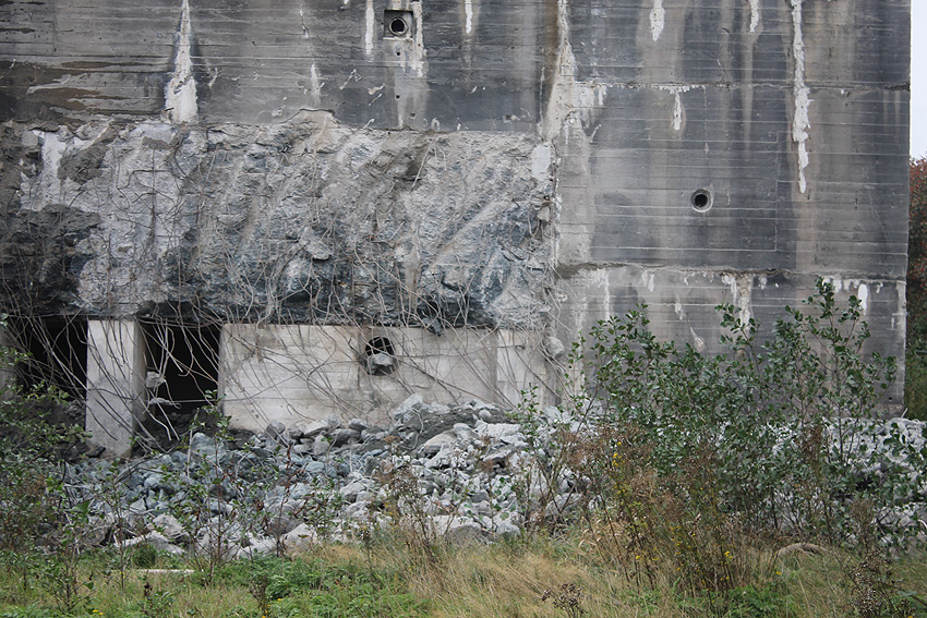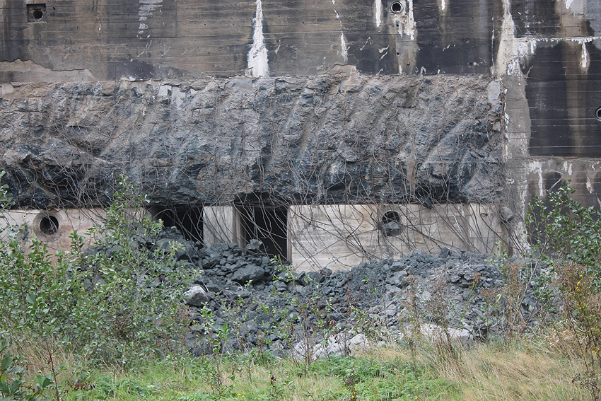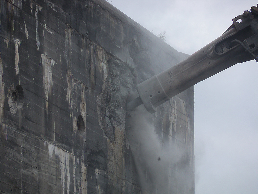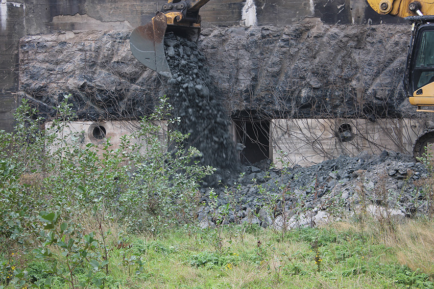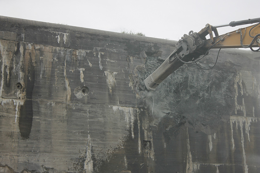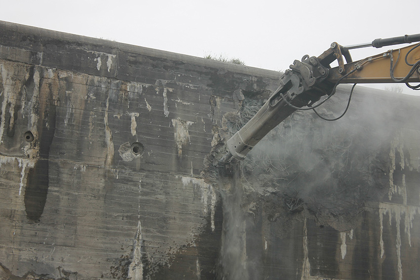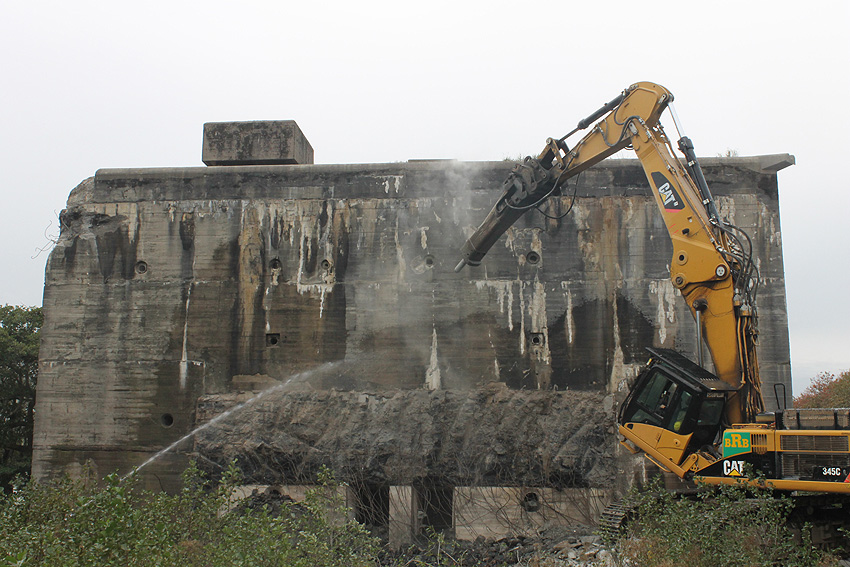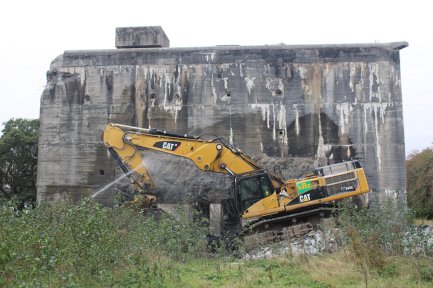 Der Splitterschutzvorbau Ost ist Vergangenheit. Gegen 16 Uhr wurde dann begonnen, an der Ostwand im Deckenbereich die Abbrucharbeiten fortzusetzen. Langsam verliert die Ostwand des Bunkers seine Struktur.