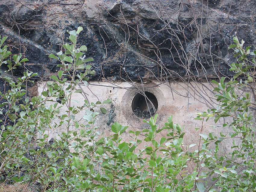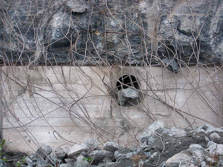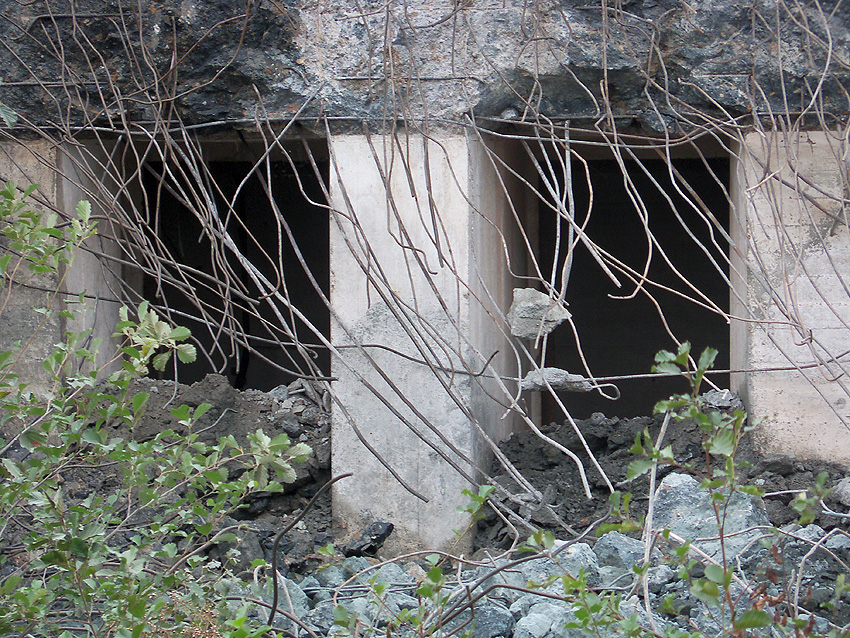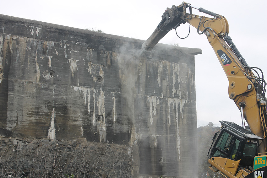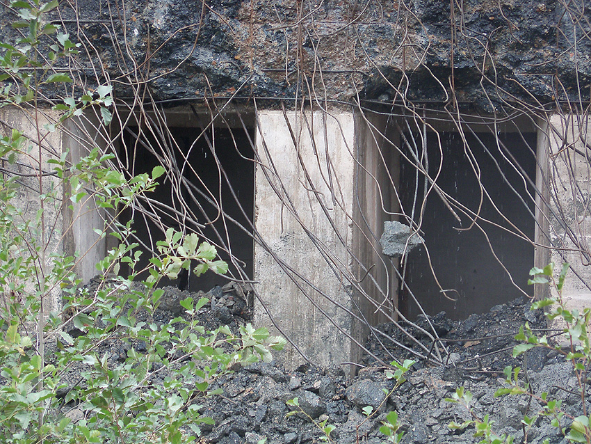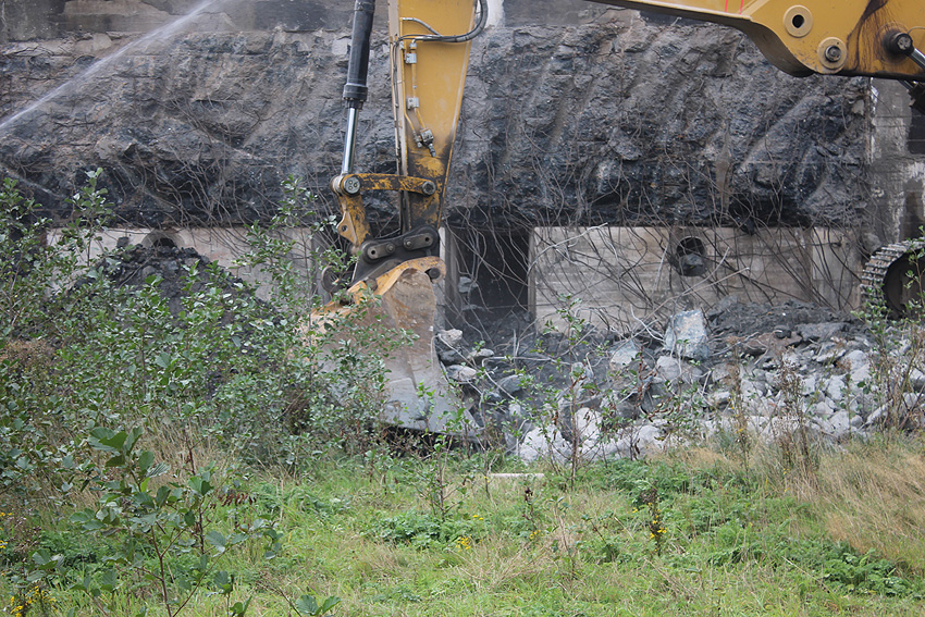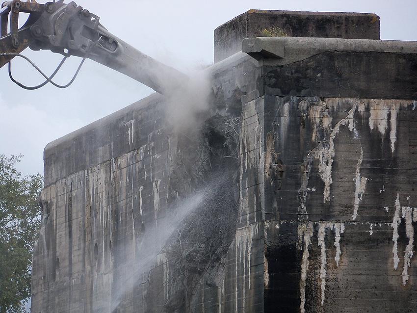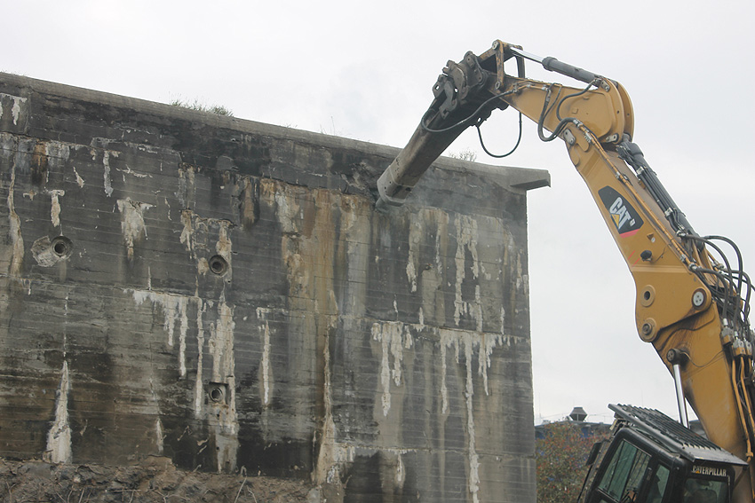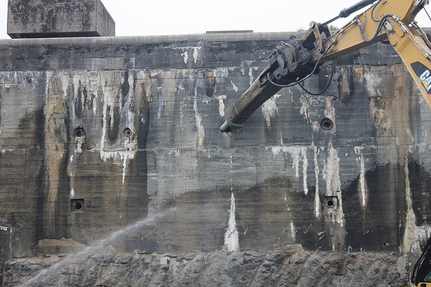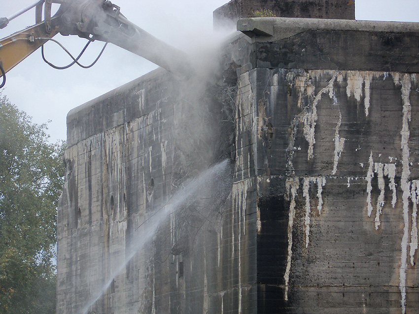 Der Splitterschutzvorbau Ost ist Vergangenheit. Gegen 16 Uhr wurde dann begonnen, an der Ostwand im Deckenbereich die Abbrucharbeiten fortzusetzen. Langsam verliert die Ostwand des Bunkers seine Struktur.