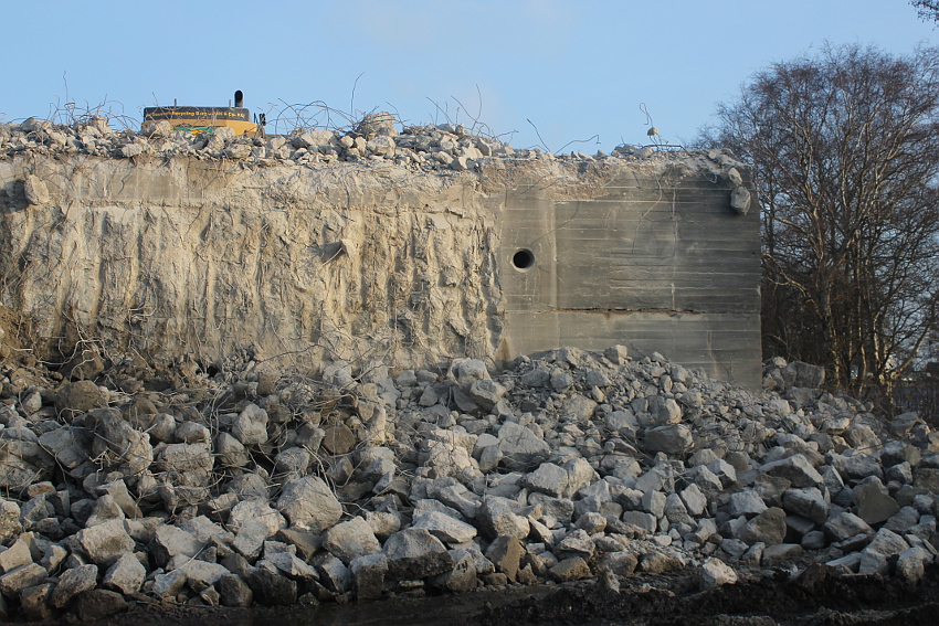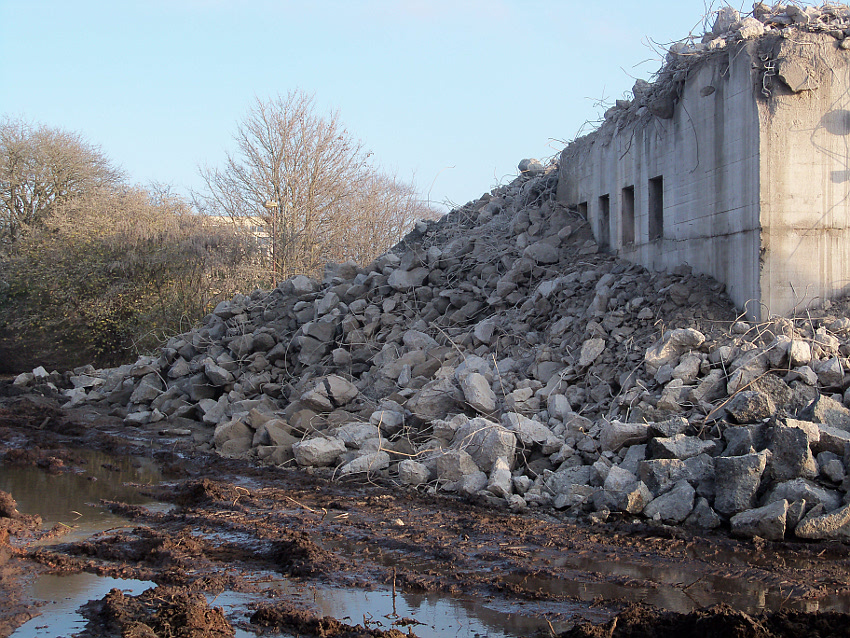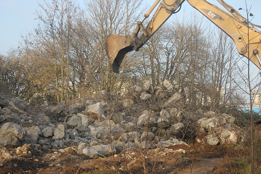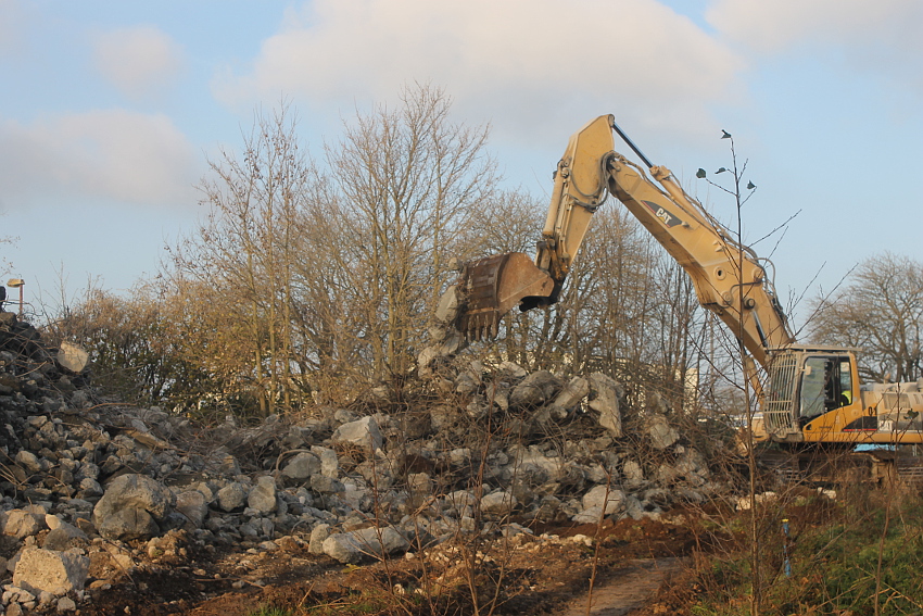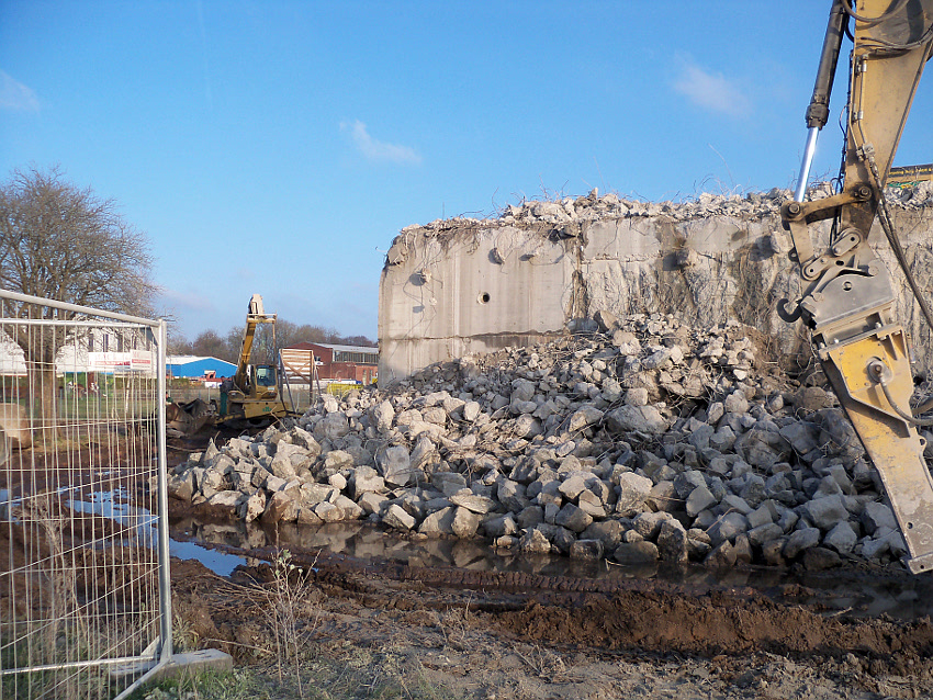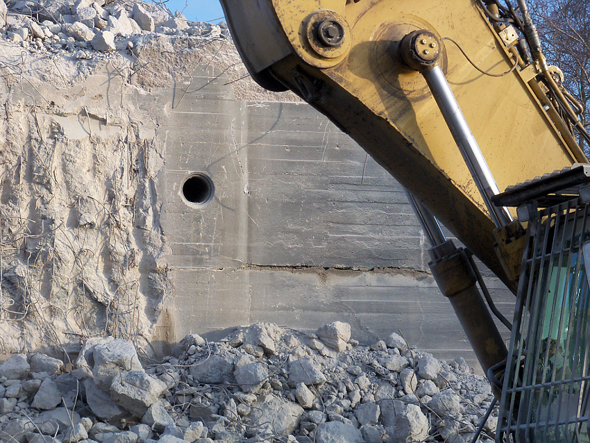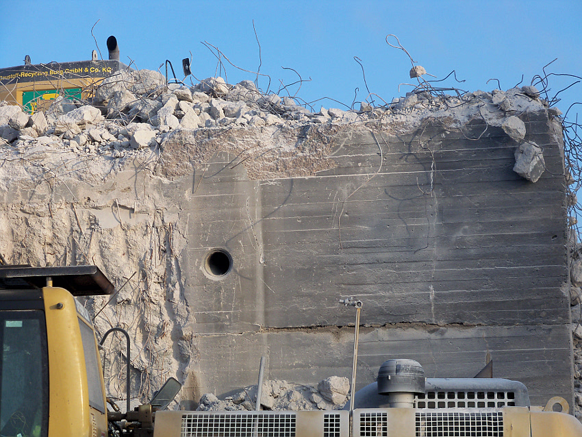 Der letzte Rest des ehemaligen OG 2 vom T 750 in dessem Südwestbereich wurde heute zerstört. Die gesamte Außenwand des OG 2 ist nunmehr Vergangenheit. Es wurde heute damit begonnen, den mittlerweile entstandenen gigantischen Schuttberg nach Osten hin zu verlagern, um an die verschütteten Teile des Bunkers zu gelangen. Eventuell soll bereits nächste Woche die "Brechmaschine" eintreffen, welche dann nach und nach den Betonschutt zerkleinert. Dafür wurde die Baustelle um rund 25 Meter nach Osten hin erweitert und auch der Bauzaun folglich weiter nach Osten versetzt.